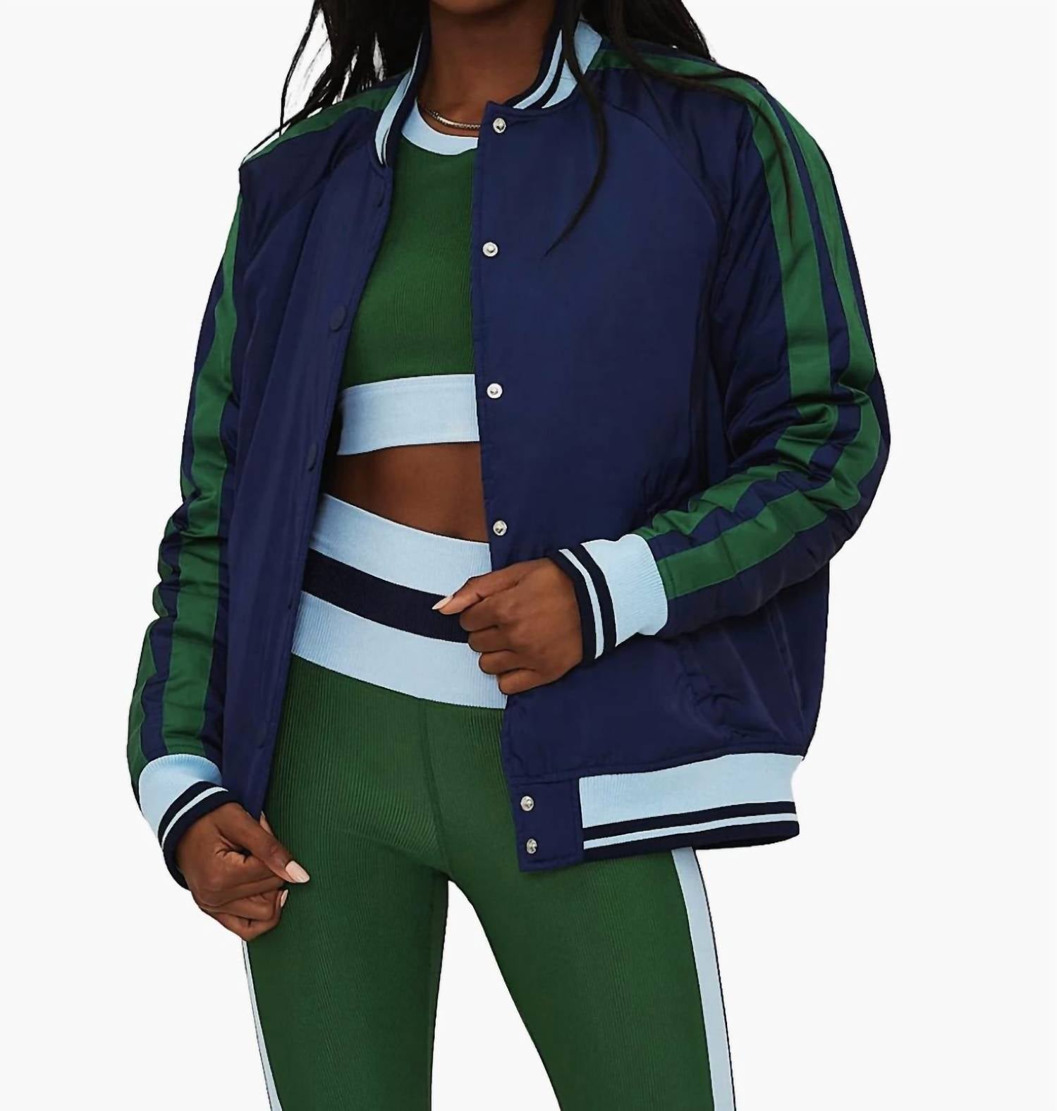 Make any outfit instantly cool by pairing it with this bomber jacket. The Flight Jacket brings a bold athletic edge to outerwear with its varsity-inspired design and rich color palette. Crafted in deep navy with striking green stripe detailing down the sleeves, it features ribbed cuffs, a striped collar, and a snap-button front for a classic, collegiate finish. This structured silhouette layers effortlessly over sporty ensembles, adding a refined, street-ready touch to any look.