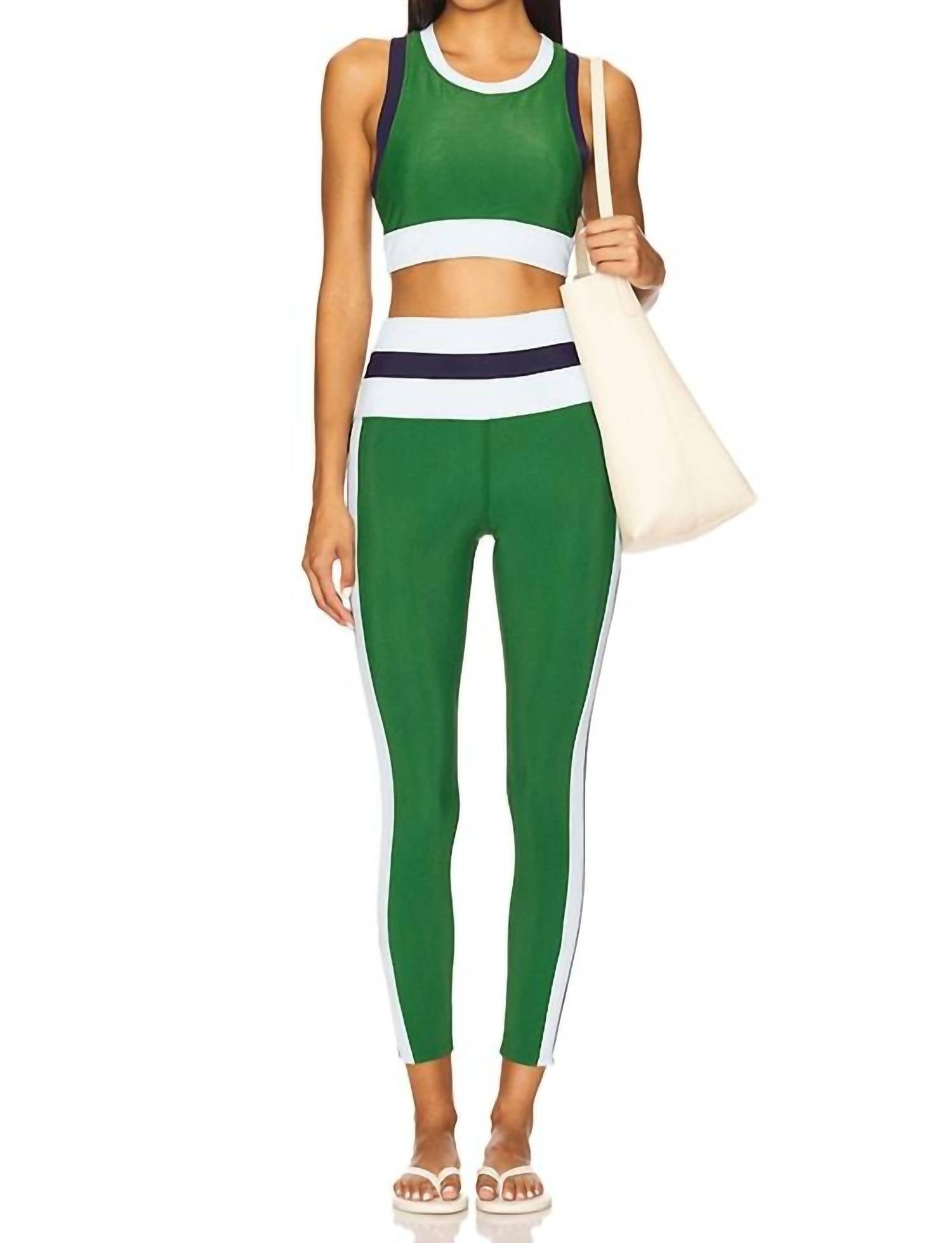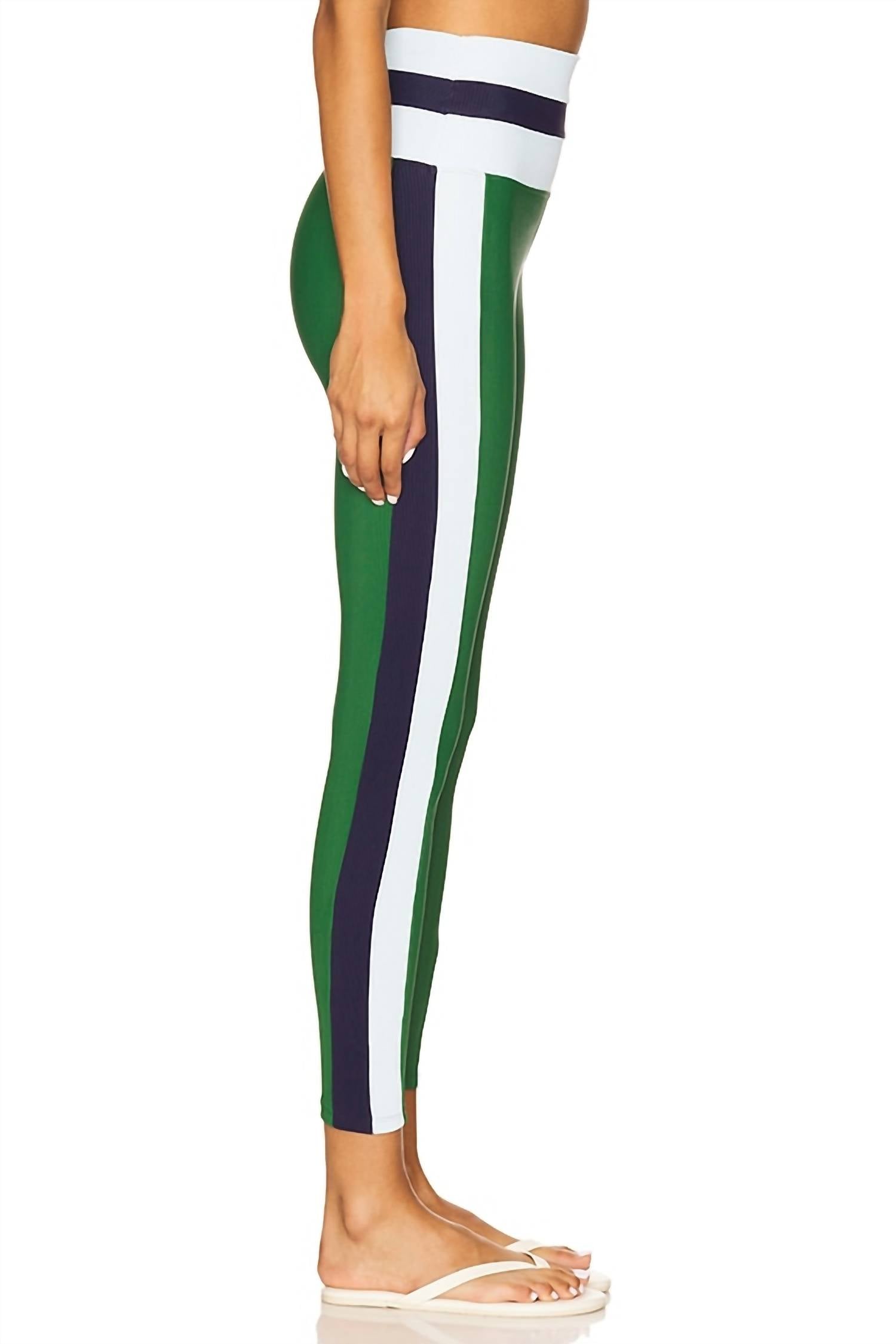 The legging you didn't know you needed and you won't want to take off. Experience sporty style and comfort with the Mariella Leggings by Beach Riot in Ivy Colorblock. These high-rise leggings feature a relaxed fit with tapered legs and are crafted from 82% polyester and 18% spandex to provide the perfect stretch. Designed in a midweight ribbed athletic fabric, they do not include pockets and are not part of a set. Closure: Pull-on. Origin: Made in China. Care: Machine wash. Perfect for workouts or casual sporty looks.