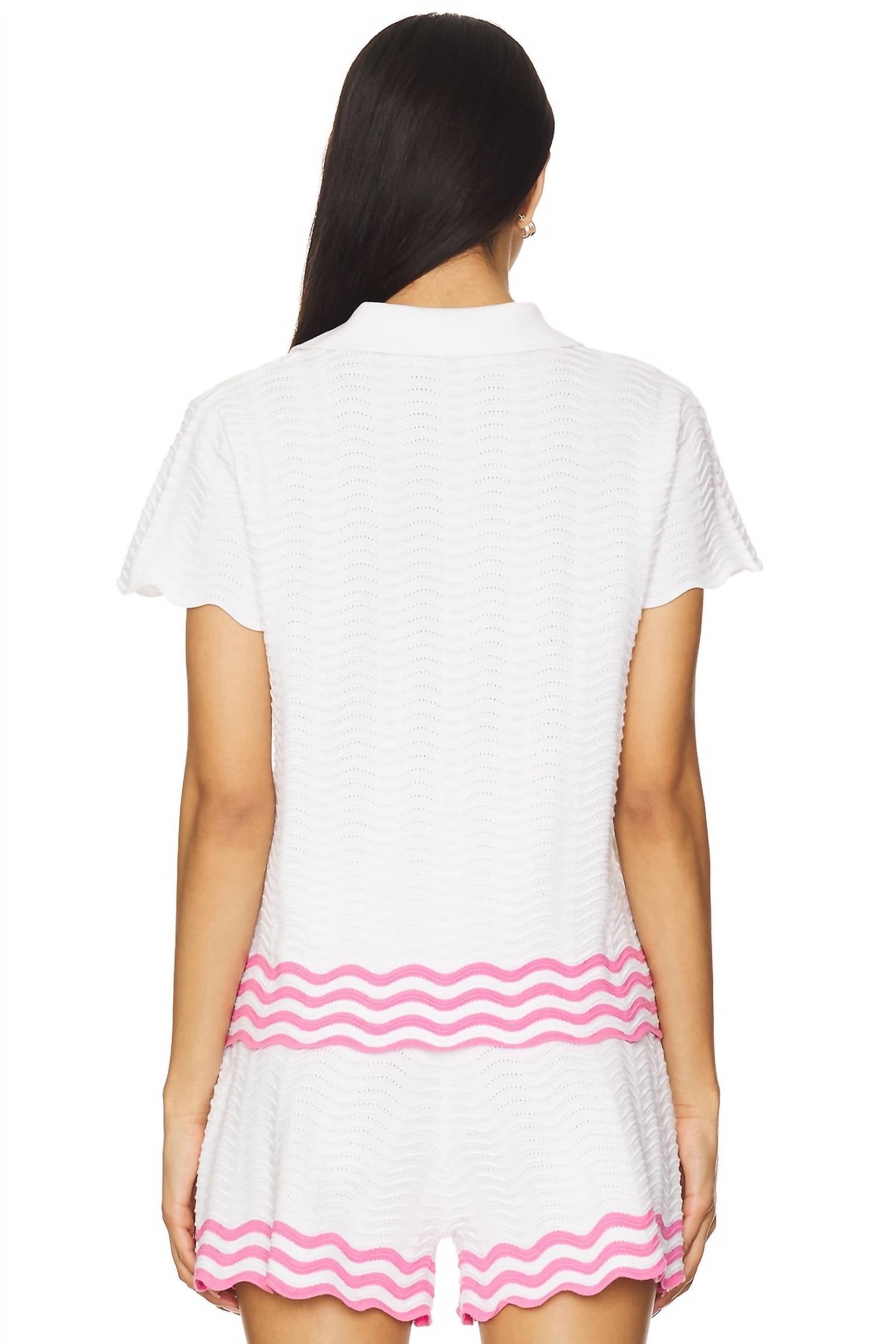 This classic, short sleeve tee will be your go-to staple this season and beyond. Introducing the Vera Collared Top by Beach Riot, a boho chic piece perfect for your summer vacation wardrobe. This short sleeve top in a delightful strawberry hue features a collared design and a striking wave pattern throughout, complemented by striped trim. Crafted from a midweight knitted fabric with a viscose blend composition (55% Viscose, 27% Polyester, 18% Nylon), it offers both comfort and style. Closure: Pull on. Care: Hand wash recommended and lay flat to dry.