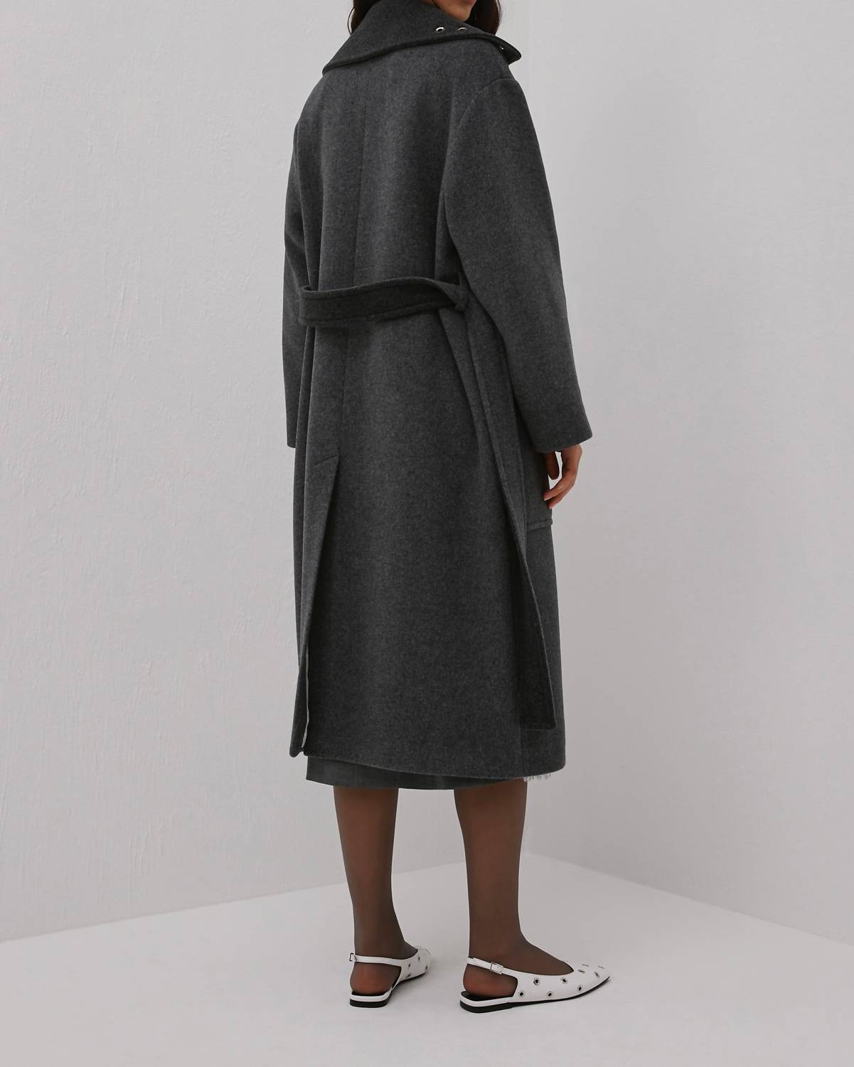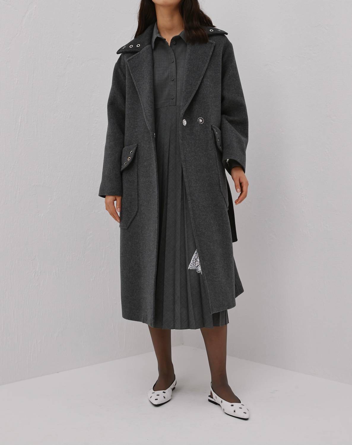 Classicly chic, this is the kind of trench coat that never goes out of style. Elevate your outerwear with the Grommet Collar Long Coat by Beatrice .b, a sophisticated statement in Charcoal Grey. Crafted with a long sleeve design, this coat features a blend of 70% wool and 30% polyamide, ensuring both style and warmth. This Italian-made piece boasts a snap closure, along with distinctive metal eyelets and roomy maxi pockets. Embrace elegance this fall at evening events, embodying chic workwear trends.