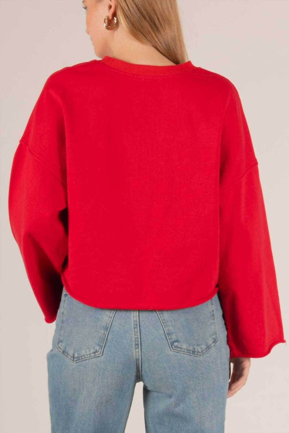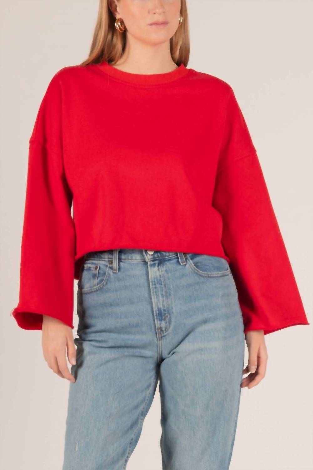 Whether you're running around town or lounging at home, this sweatshirt works for both. Elevate your casual wardrobe with the French Terry Cropped Sweatshirt by Before You, a minimalist essential in vibrant red. This sweatshirt features wide long sleeves and a stylish cropped length with raw edge detailing for an effortless oversized fit. Crafted from 100% cotton, it offers comfort and is designed for easy pull-on wear. Made in China, it requires simple care with a quick machine wash, perfect for travel and spring seasons.