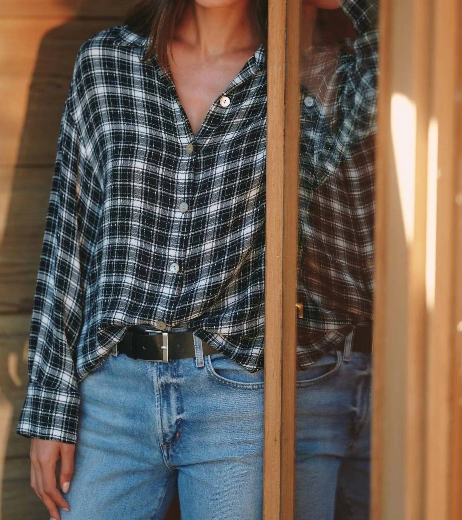 This button down shirt is comfortable yet polished. Elevate your wardrobe with the Boyfriend Button Down Shirt by Bella Dahl, featuring a timeless plaid pattern in black and white. Designed with long sleeves and a relaxed fit, this shirt boasts a 26.75" length for size small. Crafted from 87% rayon, 12% polyester, and 1% spandex, it promises comfort and style. Made in the USA with a button closure, it is easy to care for with machine wash instructions.