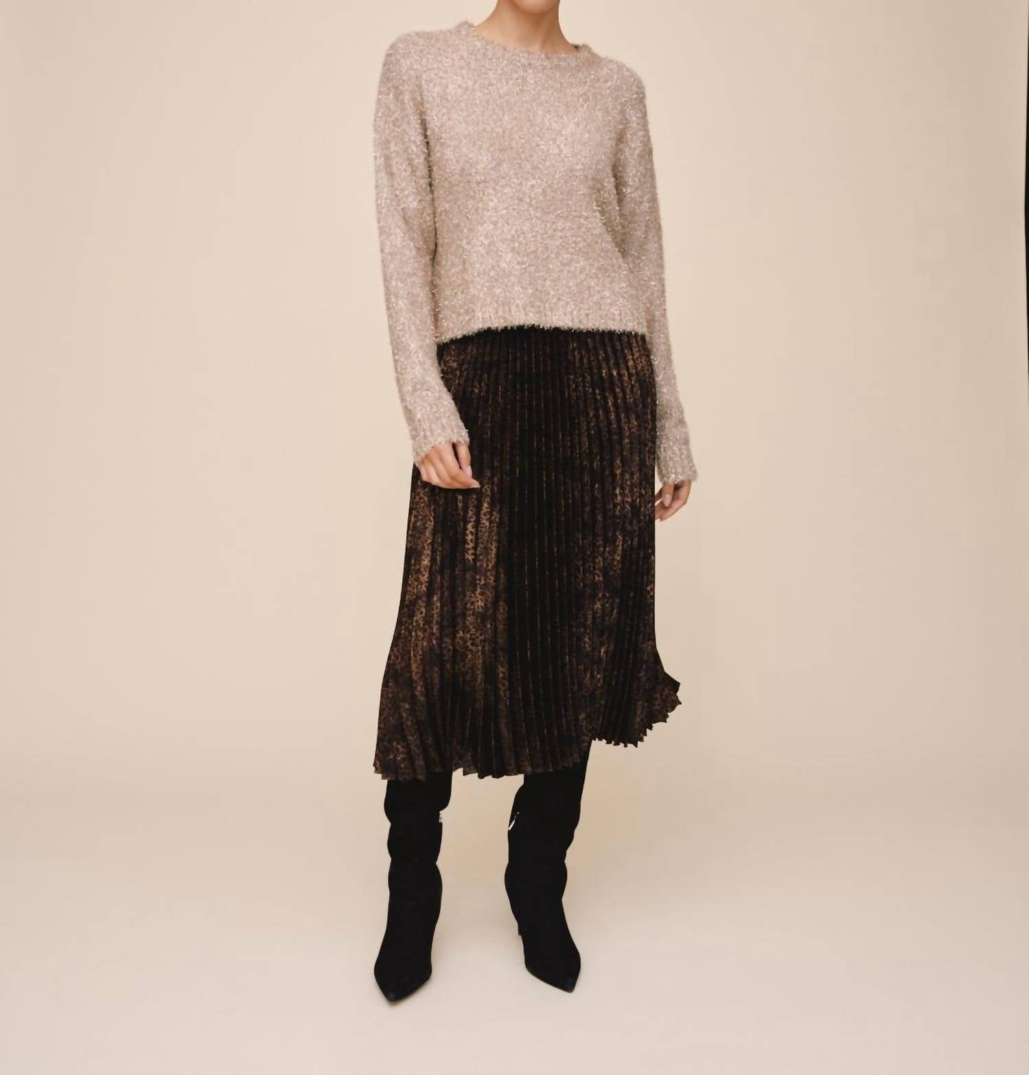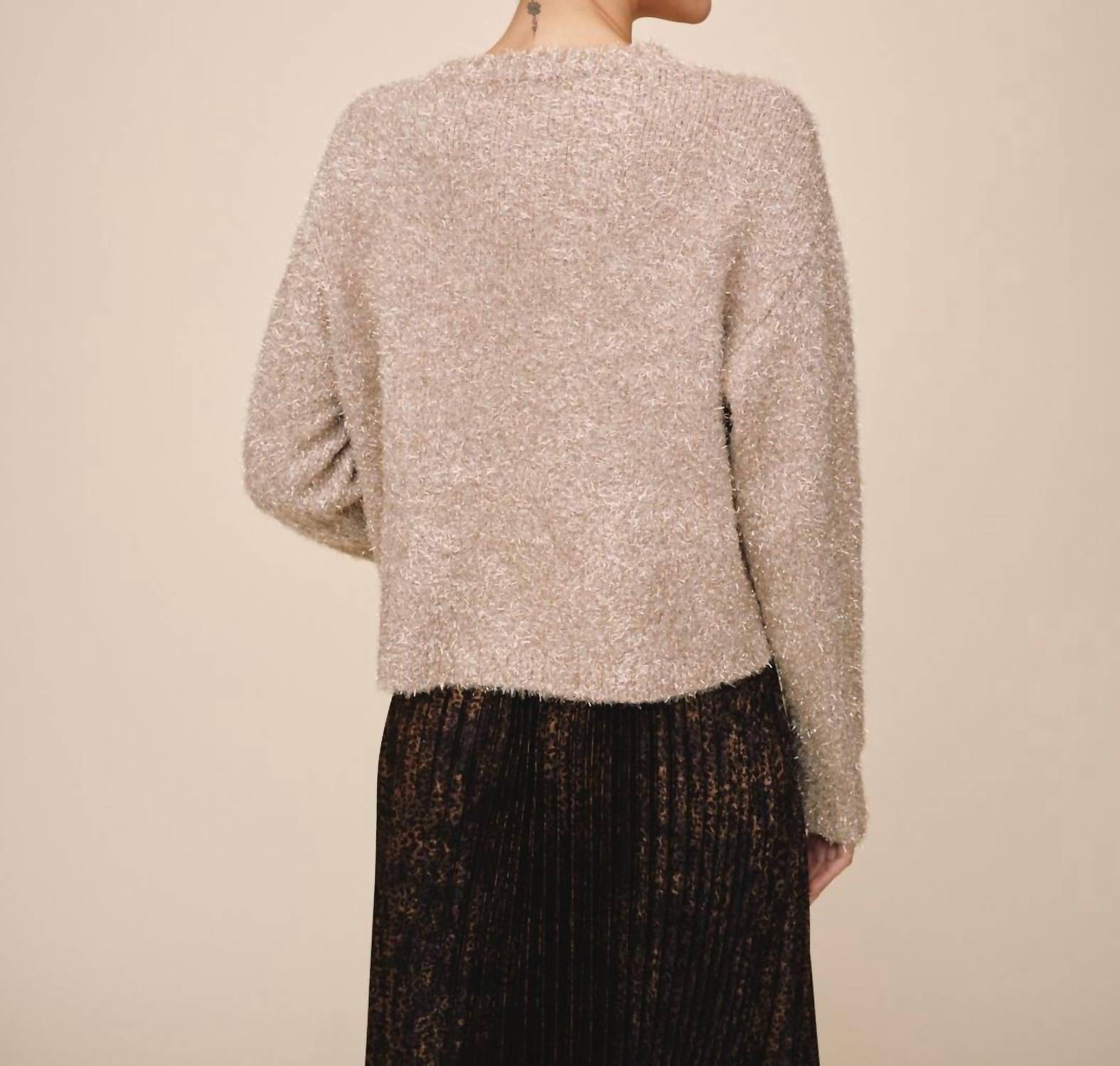 Experience the perfect blend of comfort and style with this trendy crew neck sweater, designed to effortlessly elevate your wardrobe. Pair it with your favorite denim and loafers for the perfect look. Elevate your fall wardrobe with the Bella Dahl Slouchy Sweater in a sophisticated Gold Shimmer. This long-sleeve sweater, with its crew neckline and relaxed fit, offers both warmth and a chic drape for everyday elegance. Composed of a luxurious blend of 34% Polyester, 19% Nylon, 16% Viscose, 16% Wool, 12% Metallized Fibre, and 3% Cashmere, it features a subtle shimmer thread for a polished finish. Care for it with a gentle hand wash and lay flat to dry; this imported piece is perfect for travel and holiday gatherings.