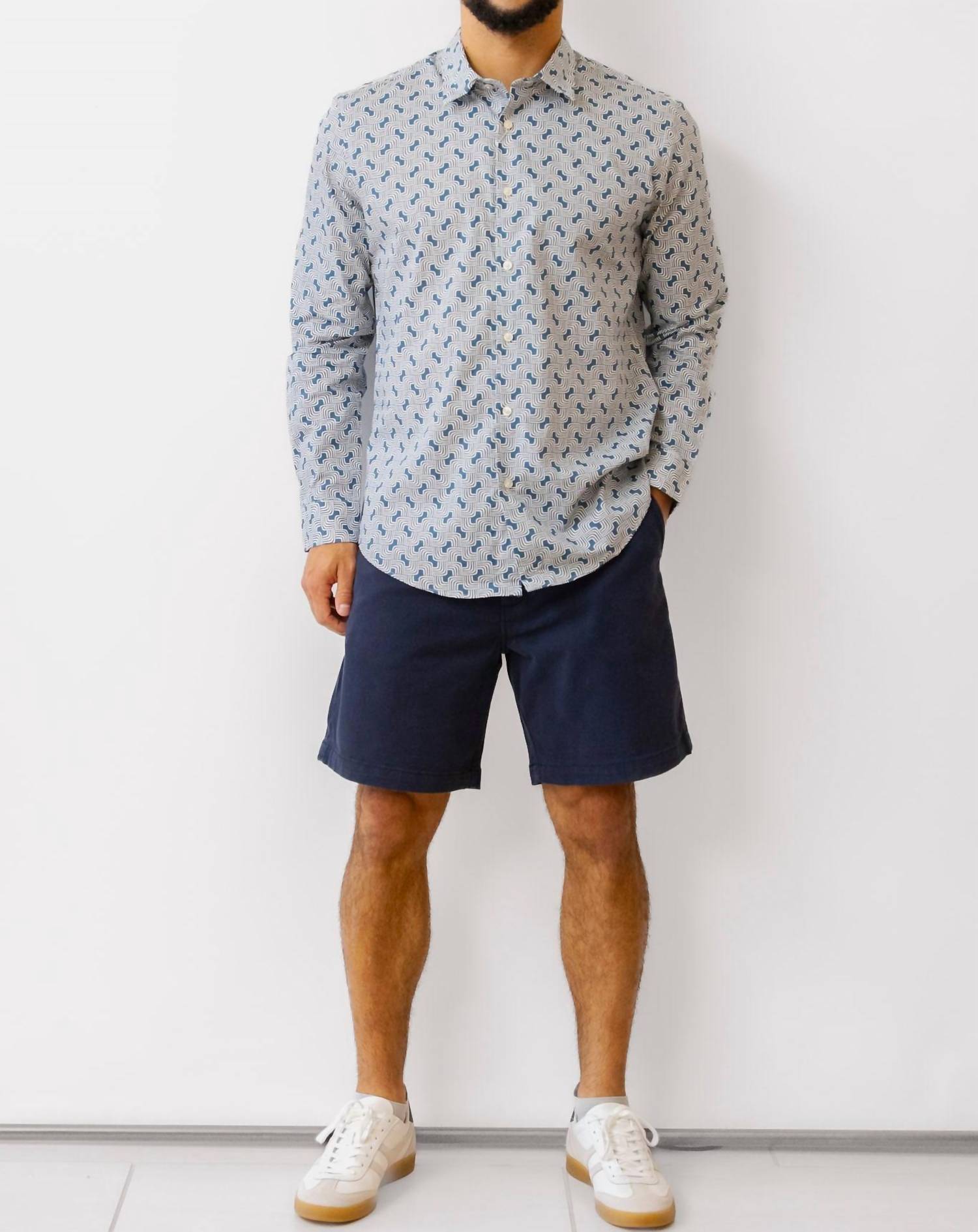 Upgrade your wardrobe with the Ben Sherman Linear Print Shirt, a stylish choice for those seeking comfort and flair. This long sleeve shirt boasts a modern slim fit and features a striking blue geometric pattern. Made from 100% cotton, it includes a pleated back detail and a practical button closure. Enjoy easy maintenance with machine wash care instructions.