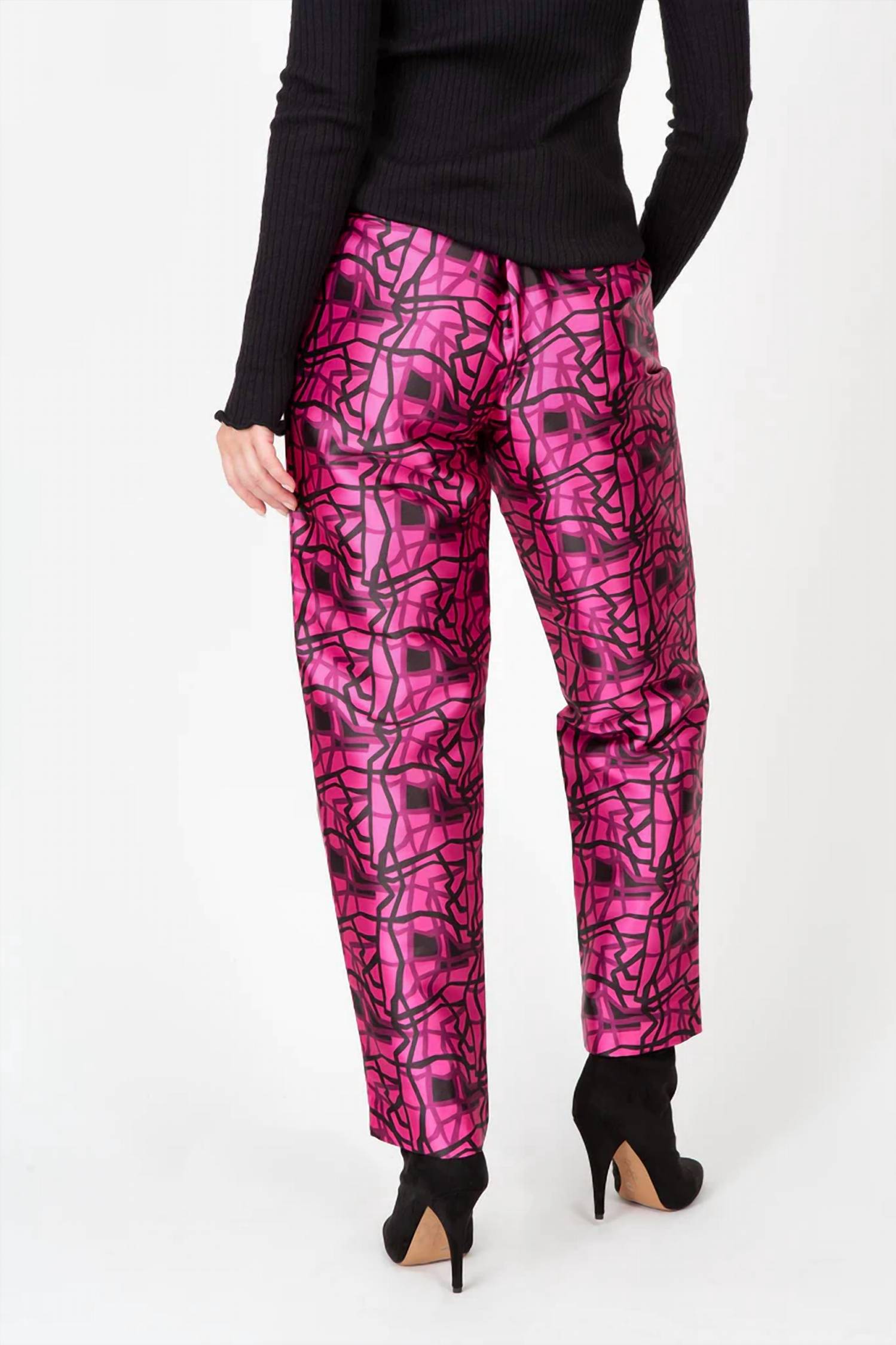 A straightleg pant that workes season after season. Dress these up with your favorite blouse or keep it casual with your go-to tee. Introducing the Bold Lines Pant by Berek, a stunning piece crafted for modern elegance in striking pink. These women's pants showcase a straight, slim fit with a high rise and geometric print, elegantly tapering towards the ankle for a flattering silhouette. Made from 100% polyester, this design features a structured front waist and comfortable elastic back, complete with pockets for added functionality. The pull-on style and luxurious fully lined interior ensure a perfect blend of sophistication and comfort, ideal for fall evening events.