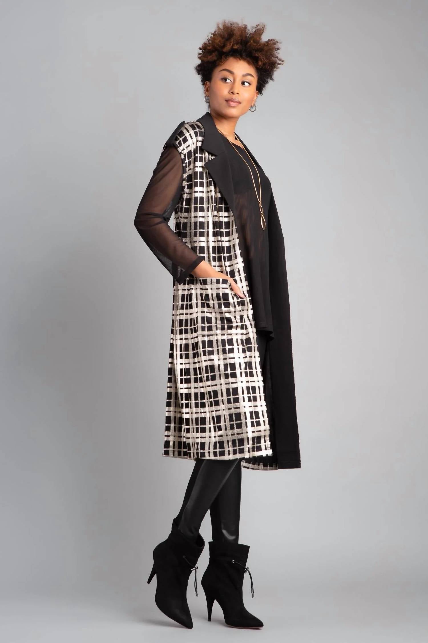 That extra layering piece you didn't know you needed! Introducing the Plaid Foil Vest by Berek, a stylish piece in a striking black gold foil print. This sleeveless vest is made from a soft and comfortable polyester/spandex blend, ensuring ease of wear. It features a sophisticated notch collar, practical patch pockets, and sits just below the knee. This vest is ideal for fall travel, embodying the trend of quiet luxury.