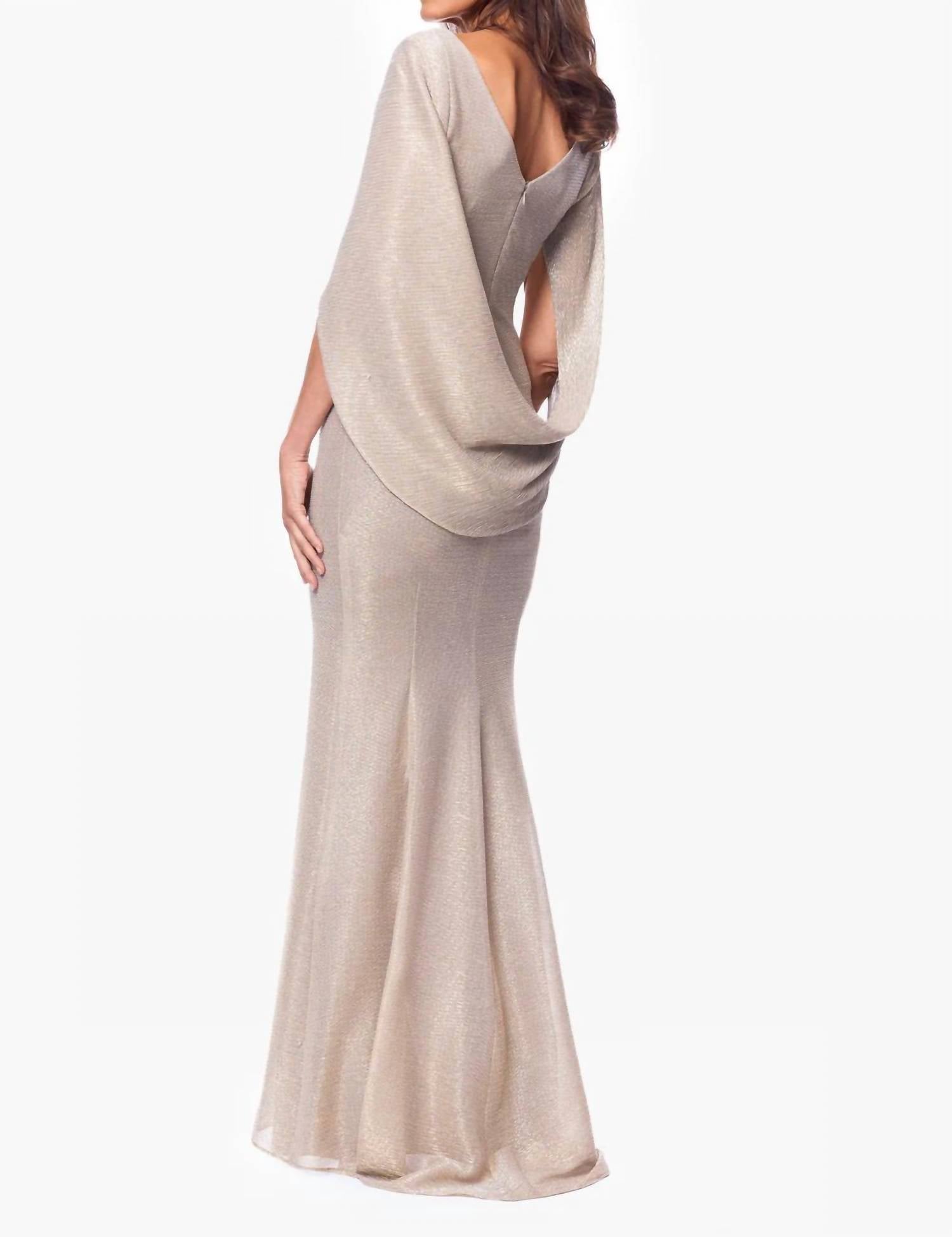 Looking for that perfect event dress? Look no further... The Crinkle Cowl Neck Gown by Betsy & Adam is a glamorous choice for any black-tie event, available in a stunning gold and silver combination. This sheath silhouette dress features draped sleeves and a cowl neckline, crafted from a metallic crinkle knit with a fully lined finish. It offers a hidden back zipper for a seamless look, and its stretchy fabric provides a snug, comfortable fit. Designed to be floor-length, the gown measures approximately 61 inches from shoulder to hem and should be dry cleaned to maintain its exquisite texture.