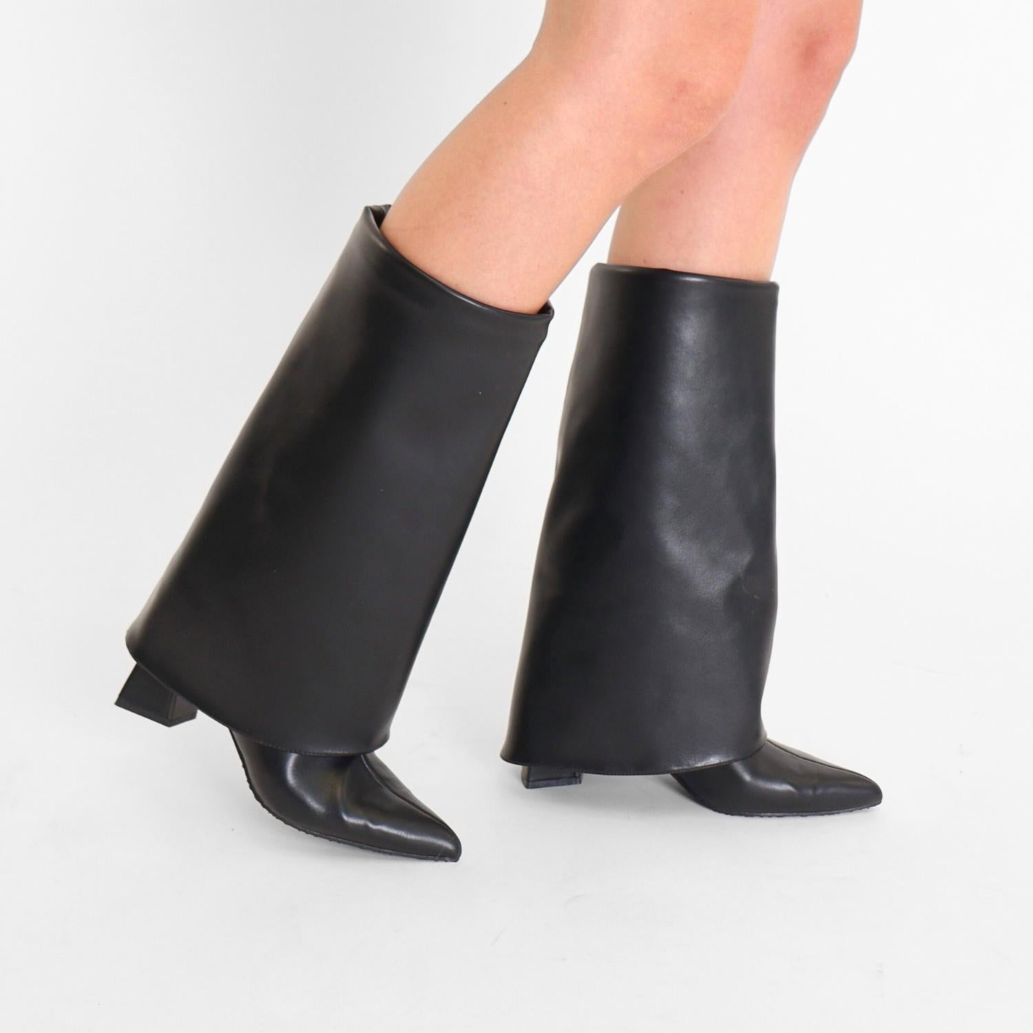 Say hello to the perfect, most versatile boot. The ankle height makes this style easily transition from day to night. Wear them with your favorite skinny jeans and tee for a more laid back look, or pair them with your favorite mini dress and jacket for a night out on the town. Step up your style game with the Maralyn Foldover Boots by BIANCO, a bold statement piece in sleek black. These women's ankle boots are crafted from smooth faux leather and flaunt a striking silhouette with an extended, structured upper that sets them apart. Designed with a pointed toe and mid-height block heel, they offer both sophistication and all-day comfort. Embrace the monochrome trend and pair them effortlessly with tailored trousers, skirts, or dresses for a contemporary, fashion-forward look.
