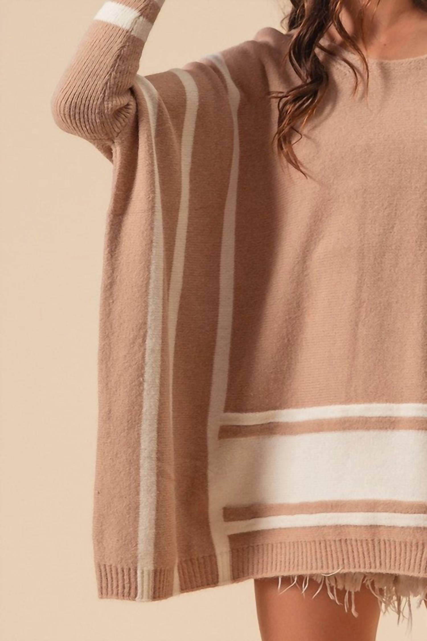 Stay warm and stylish in this versatile and effortlessly cool knitwear staple. Wear it alone or layered, it's the perfect sweater for the season and you'll wish you had it in every color. Wrap yourself in the Batwing Striped Sweater by BiBi, combining an oversized fit with chic stripes in oatmeal and ivory. This women's sweater stands out with its long sleeves and crewneck, perfect for fall travel in a minimalist trend. Crafted with a patterned design, it offers both comfort and style for versatile wear.