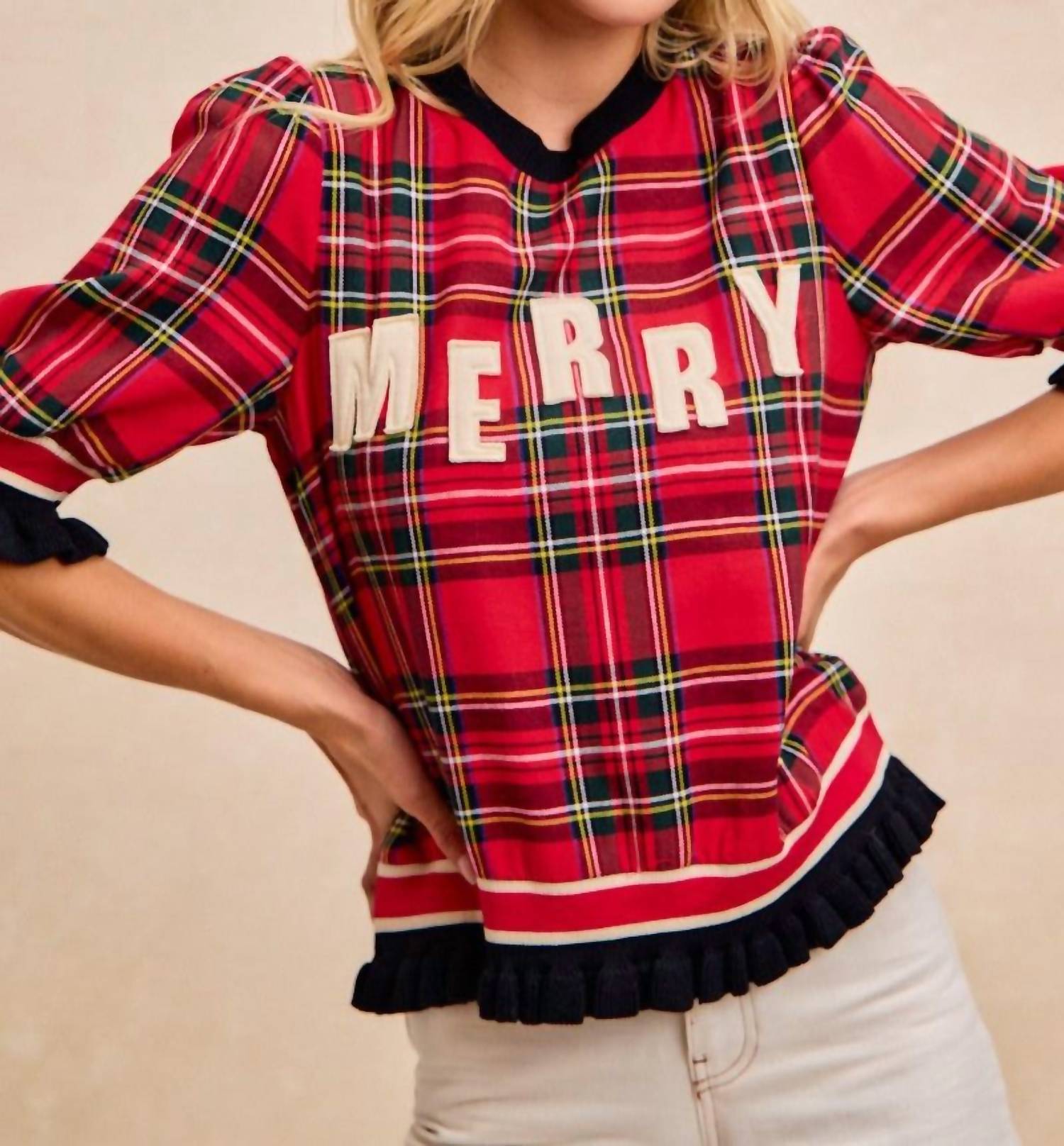 Look no further, you just found your perfect tee! Introducing the Merry Patches Top by BiBi, a perfect blend of holiday cheer and classic style. With short sleeves, this plaid shirt crafted from a 58% Cotton and 42% Polyester blend ensures comfort while celebrating the season. Featuring a pull-on closure, this piece is machine washable for easy care. Adorned with merry letter patches, it's an ideal choice for adding festive charm to your winter wardrobe.