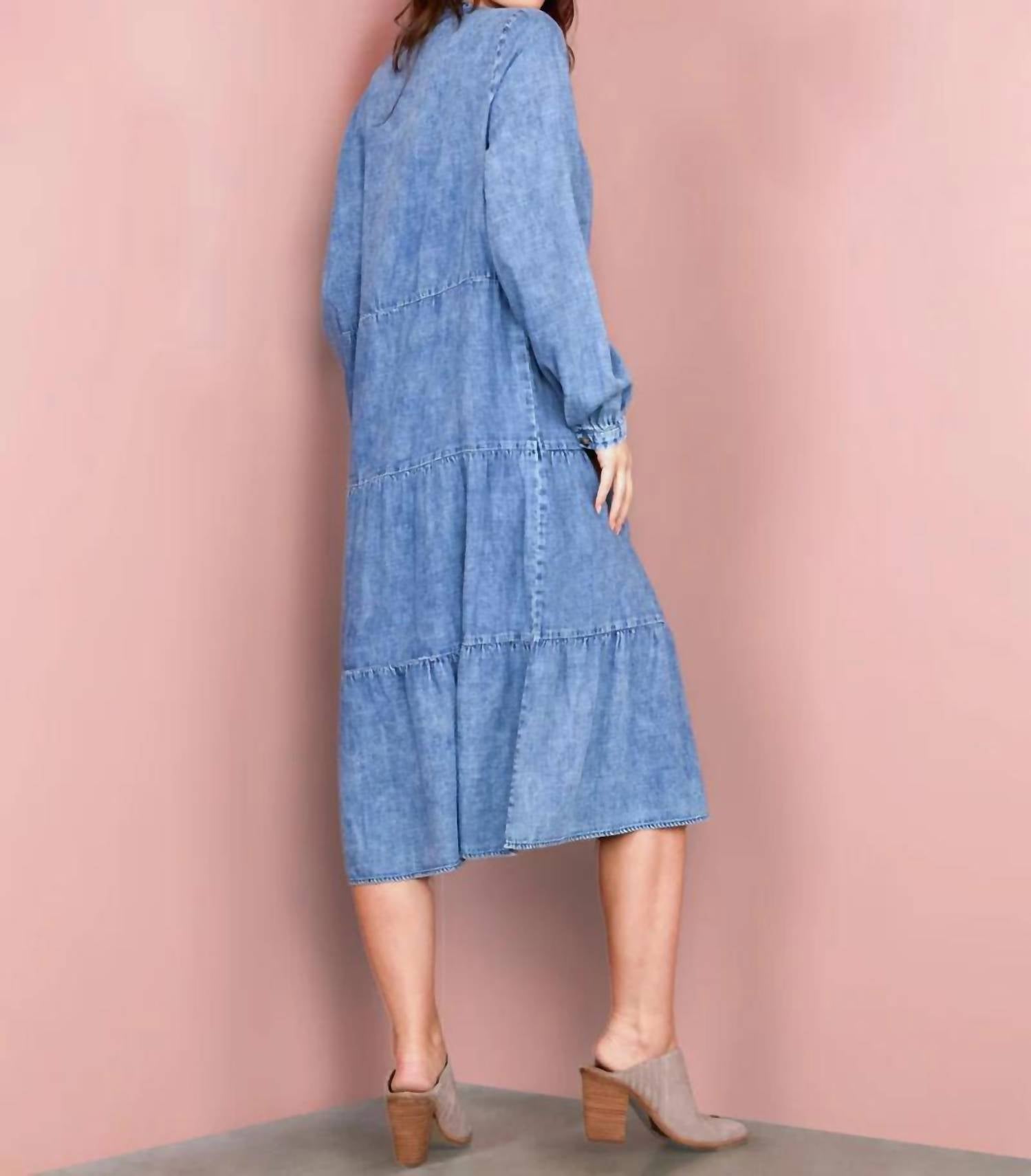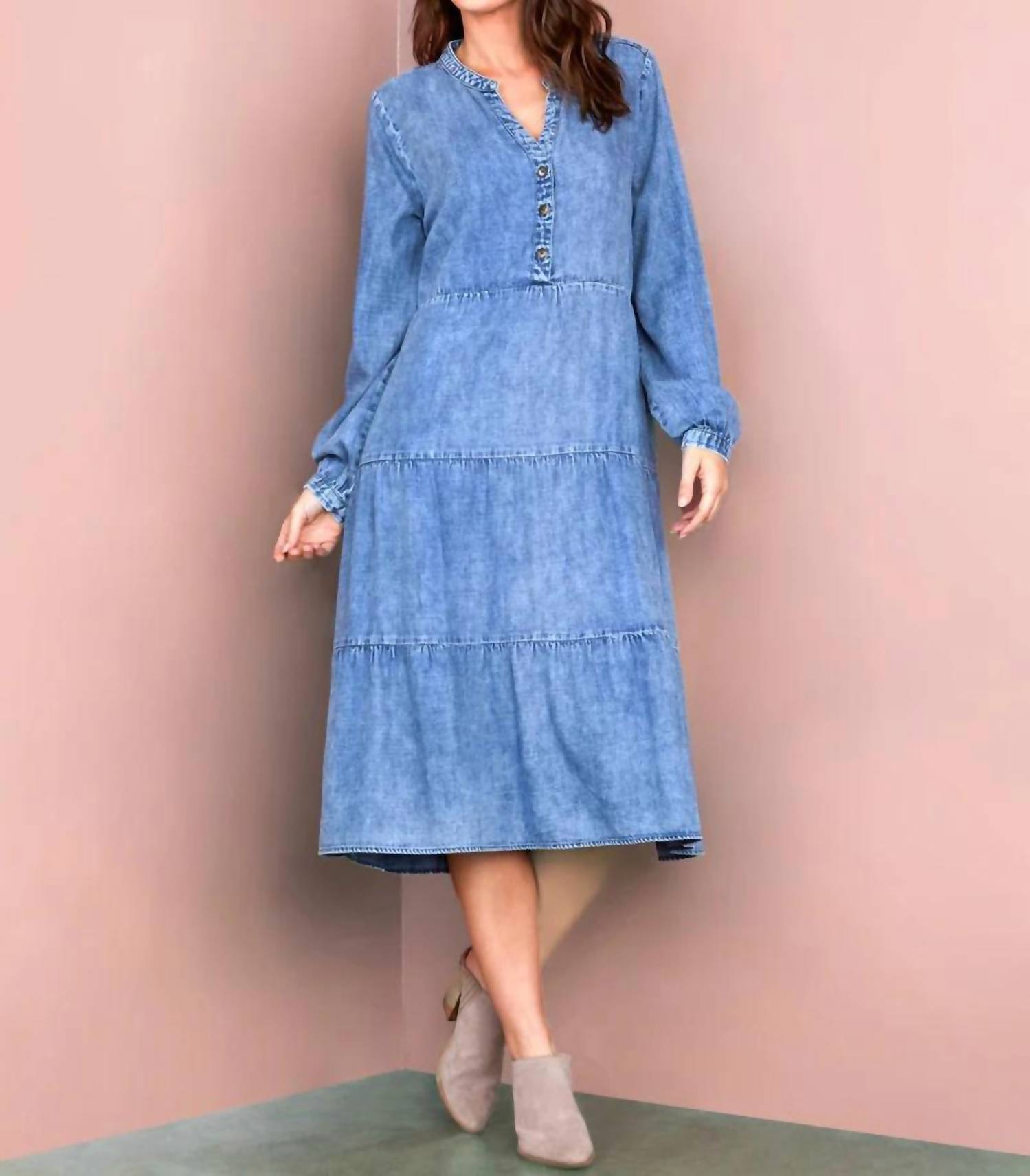 Comfortable and cute, this casual day dress has it all. Introducing the Eliana Maxi Denim Dress from Billy T, perfectly crafted for versatile styling. This long sleeve dress features a shift silhouette with a V-neckline, adding a touch of elegance to any wardrobe. Made from 100% Lyocell, it offers a breathable fit and comfort for those summer months. Closure: Button closure. Care: Machine wash. Model is 5'7" and wears a size small.
