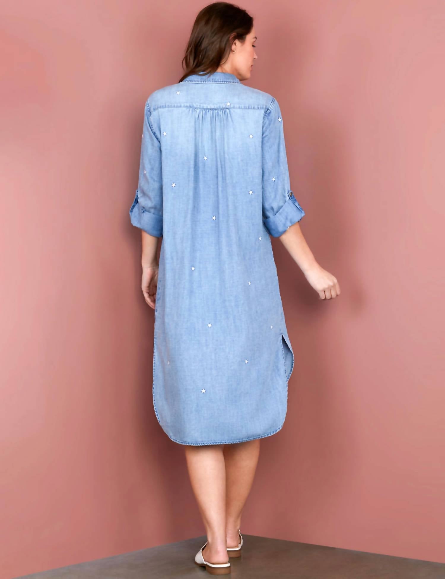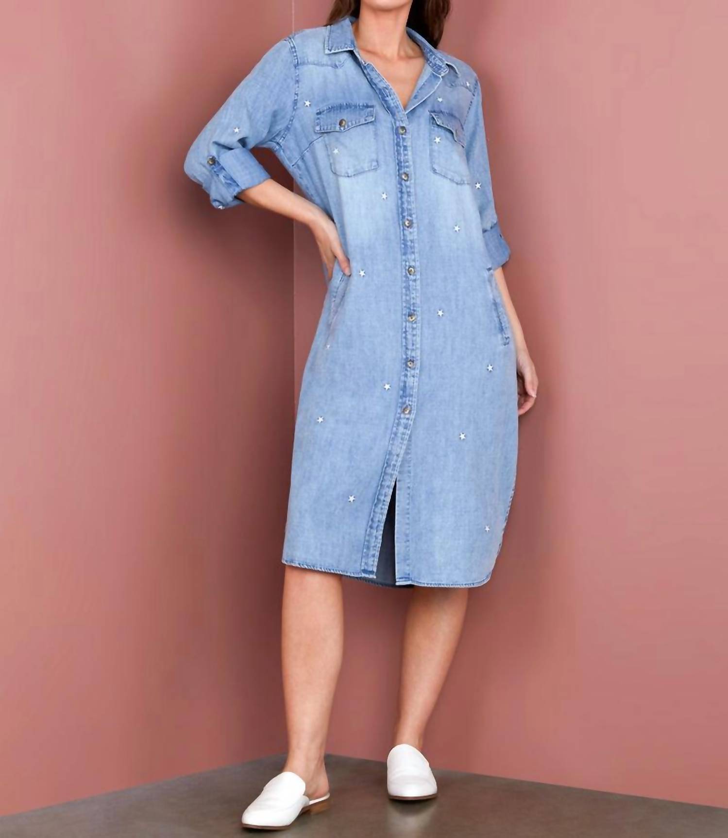 The perfect length dress does exist. The Little Star Dress by Billy T offers a perfect blend of style and comfort with its three-quarter sleeves and 55% Cotton 45% Lyocell blend fabric. This denim graphic dress is designed in a chic shirt silhouette and midi length, ideal for preppy spring occasions like holiday parties. It features a practical button closure and handy pockets, combining fashion with functionality. With its classic collar neckline, this dress embodies a fresh and youthful appeal. The model is 5'7" wearing a size small.