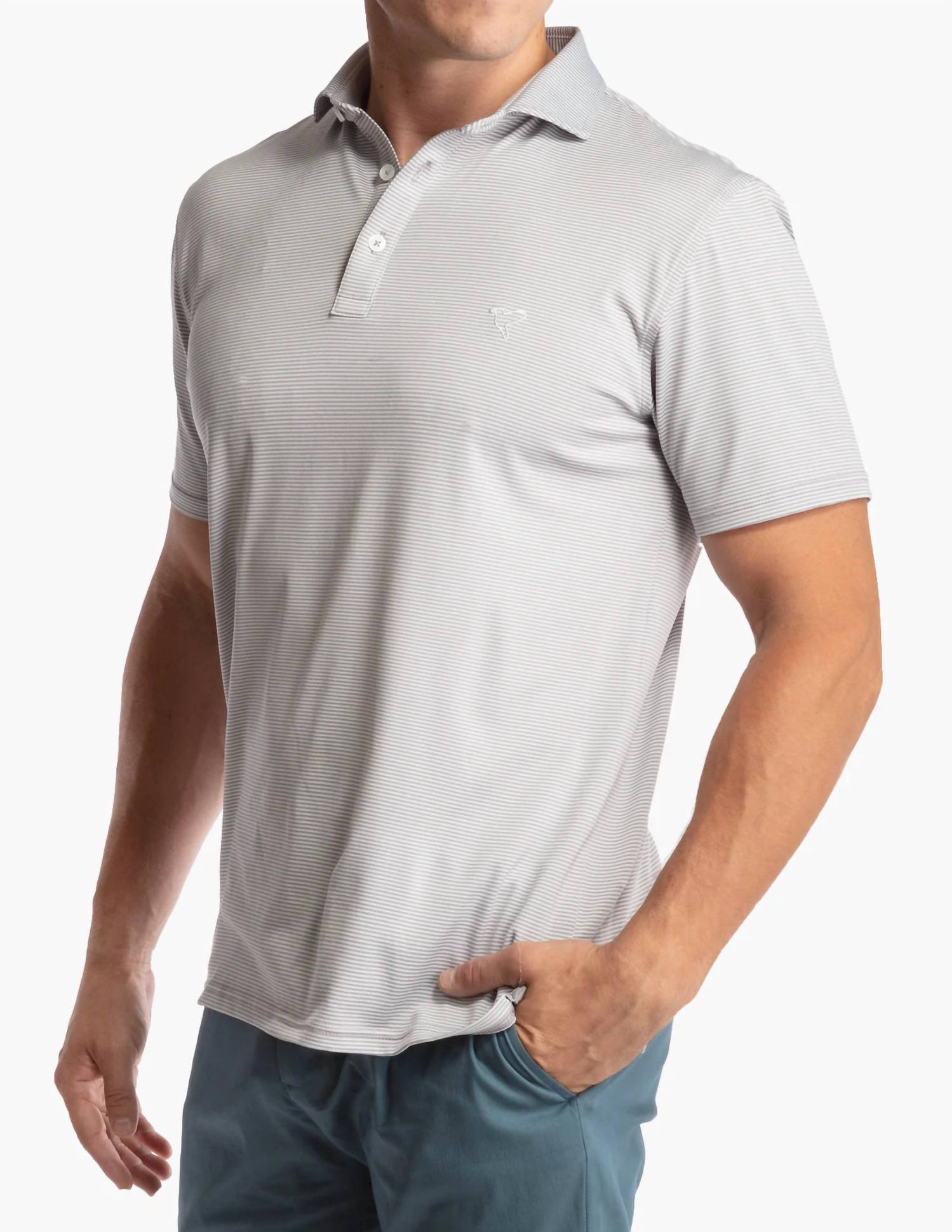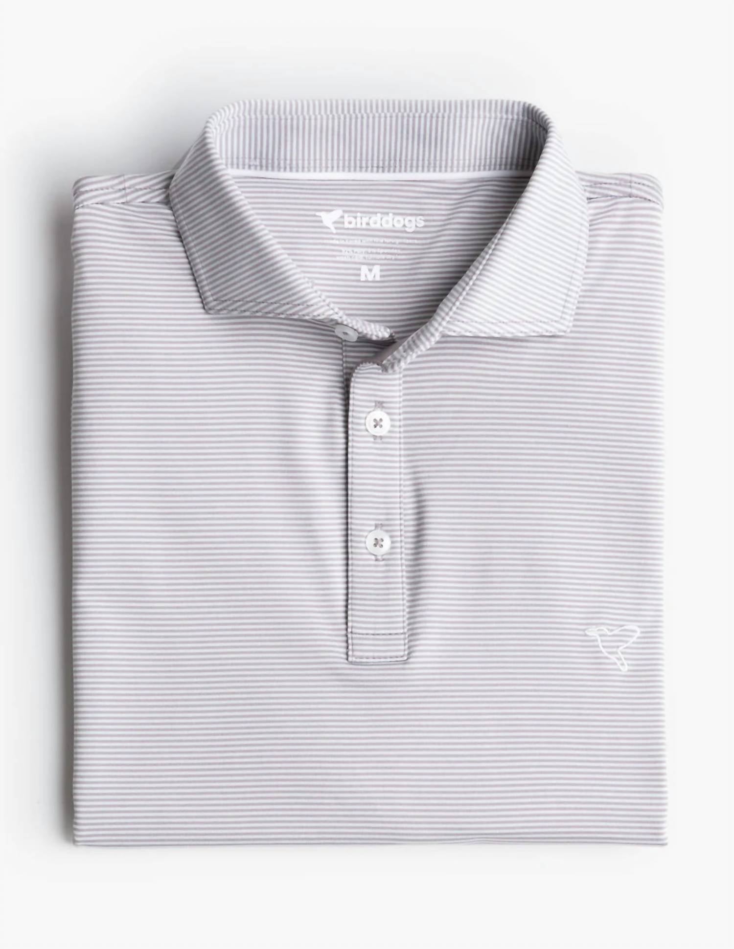 Elevate your wardrobe with the Birddogs Performance Polo, a stylish piece perfect for a dinner party or a round of golf. Crafted from 88% Polyester and 12% Spandex, this short sleeve polo ensures a comfortable and flexible fit with its stretch performance fabric. The classic button closure and minimalist gray stripes provide a timeless appeal. Care for this men's polo by machine washing and laying it flat to dry, ensuring long-lasting wear.