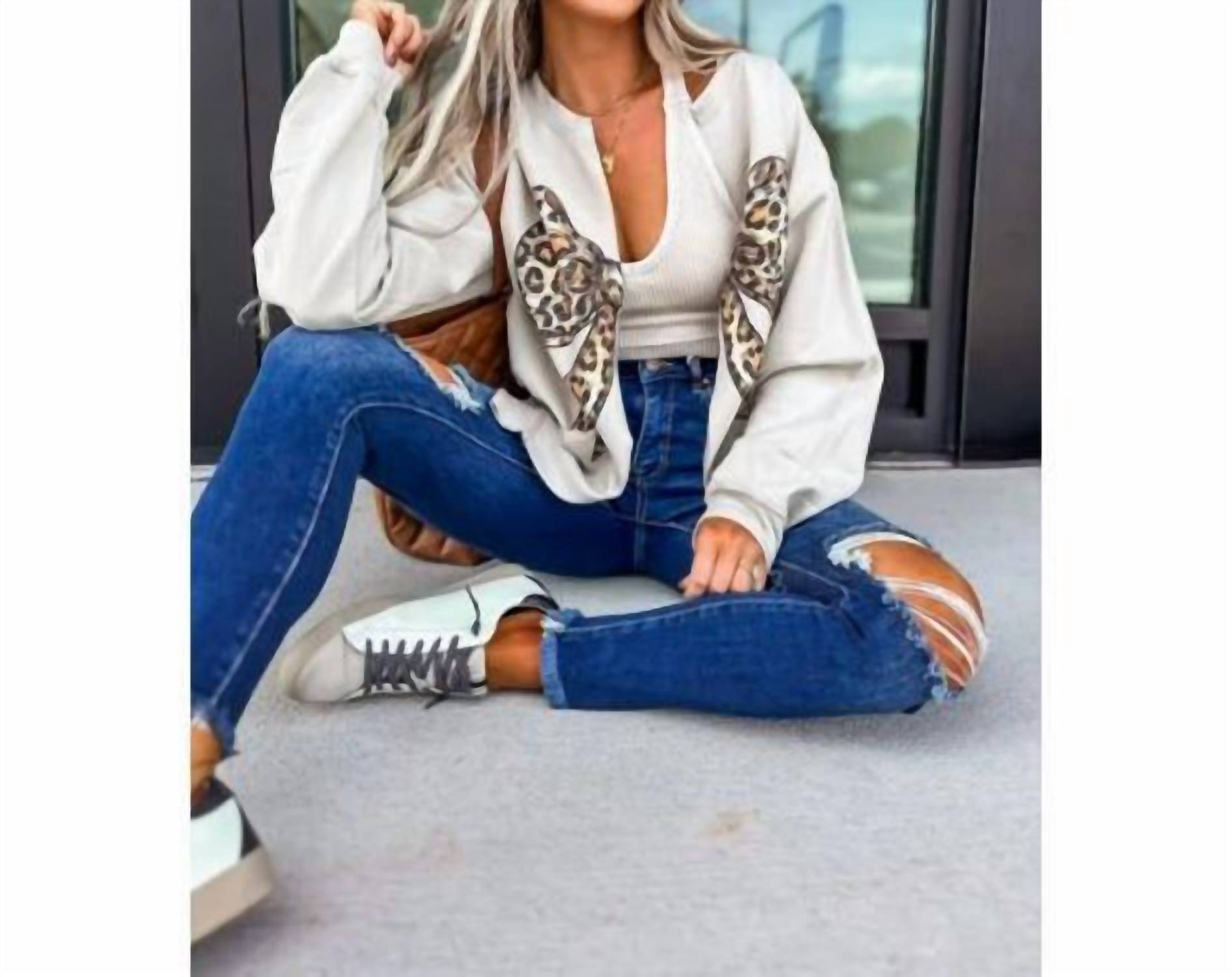 Cozy fabric, impeccable design - Meet the sweatshirt that you'll never want to take off. Introducing the Leopard Bow Luxe Sweatshirt by Birdie, a chic addition to any wardrobe with its eye-catching design. This long-sleeve sweatshirt in a versatile sand color features a striking oversized leopard bow, perfectly blending cozy comfort with standout style. Made from a soft 50% Cotton and 50% Polyester blend, it's designed for true-to-size everyday wear. Ideal for fall travel occasions with a trendy boho chic flair, this piece embodies both casual charm and bold personality.