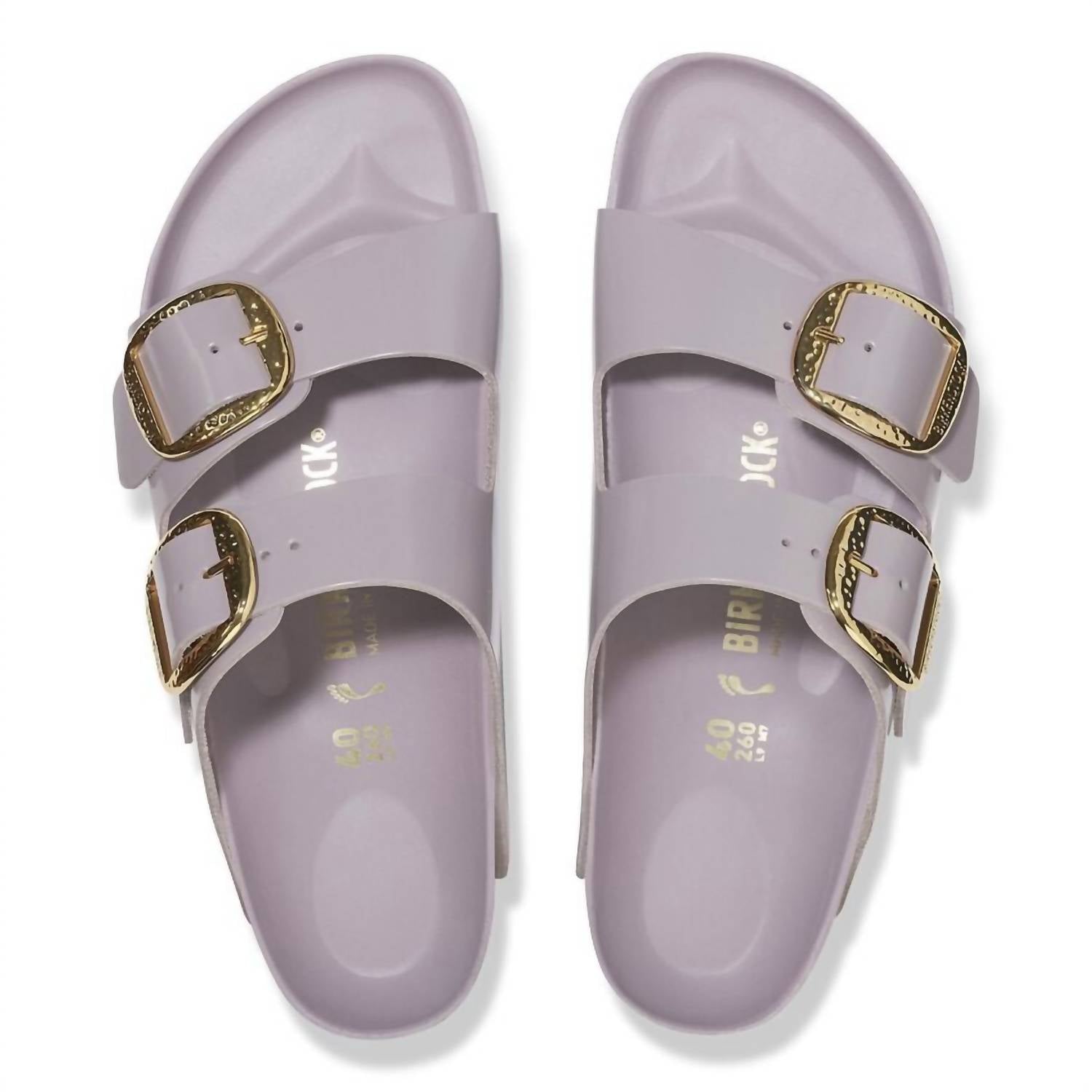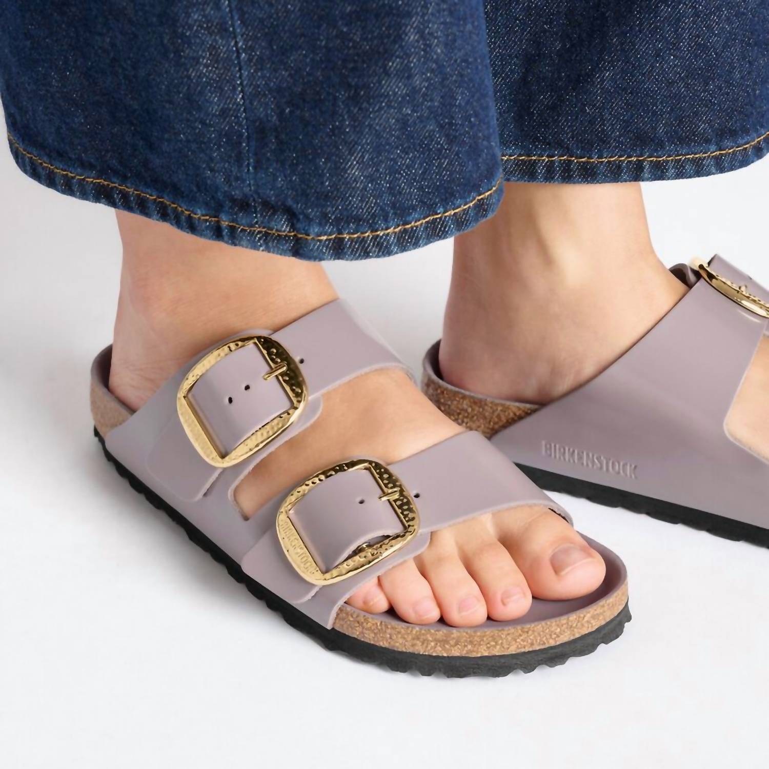 Classicly cute and all-day-wearable. We love this sandal. Elevate your spring footwear with the Women's Arizona Big Buckle Sandals by BIRKENSTOCK, a timeless classic in high-shine Faded Purple. Crafted from patent leather, these sandals feature a distinctive hand-hammered design with large, elegant pin buckles for adjustable comfort with a stylish twist. The anatomically shaped cork-latex footbed and comfortable piumato leather lining provide unparalleled support, complemented by a durable EVA sole. Made in Germany, these minimalist open-toe sandals are perfect for holiday parties or a chic Thanksgiving ensemble.