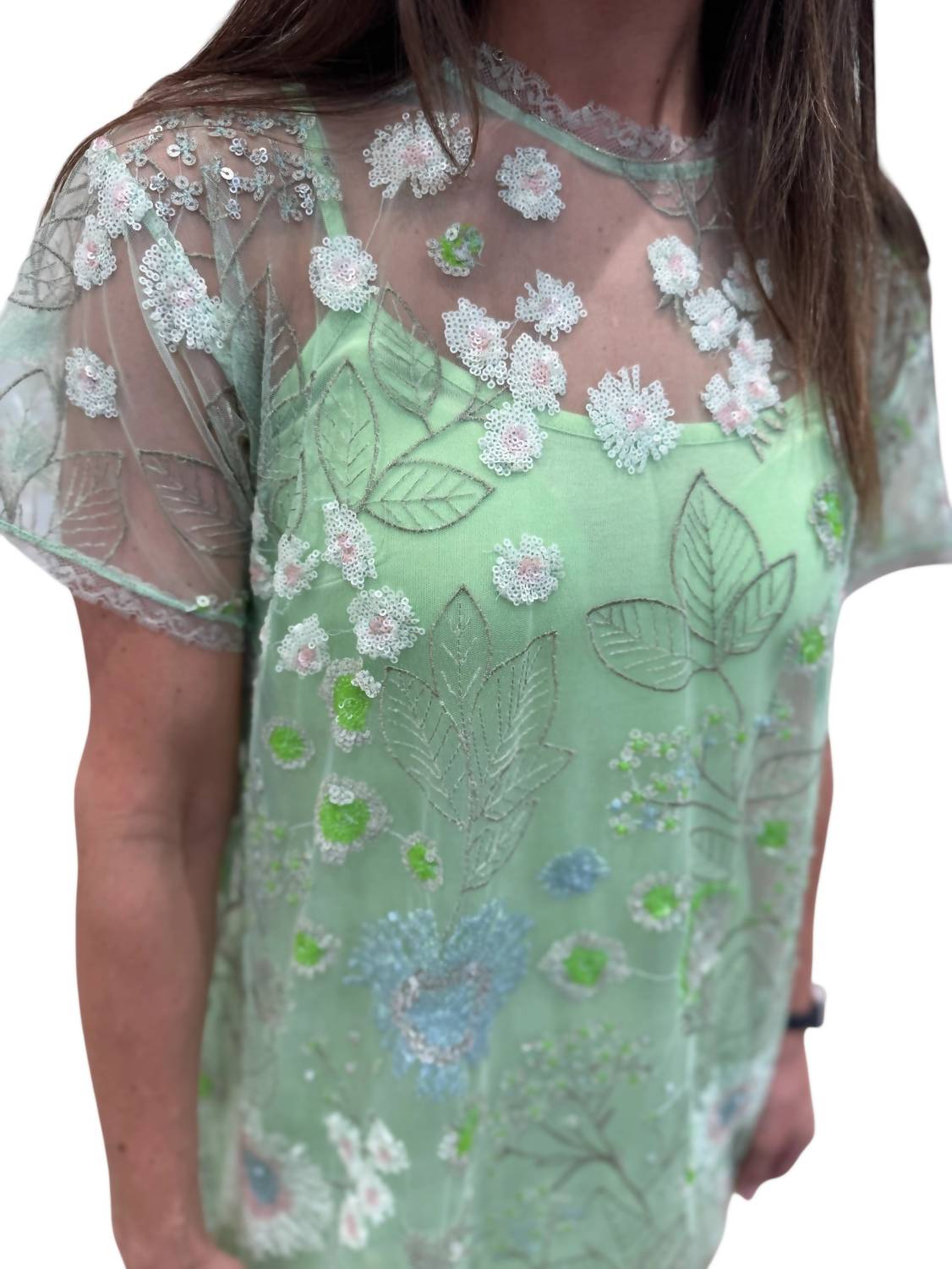 The kind of easy and flattering dress you'll be reaching for all season long. Perfect for a holiday party or Easter celebration. Mini shift dress features short sleeves and a mock neckline, with a sheer overlay adorned with white and blue floral embroidery for a boho chic flair. Designed for spring, offers a pull-on closure for effortless wear. Care for this delicate piece by hand washing to maintain its exquisite texture and detail.