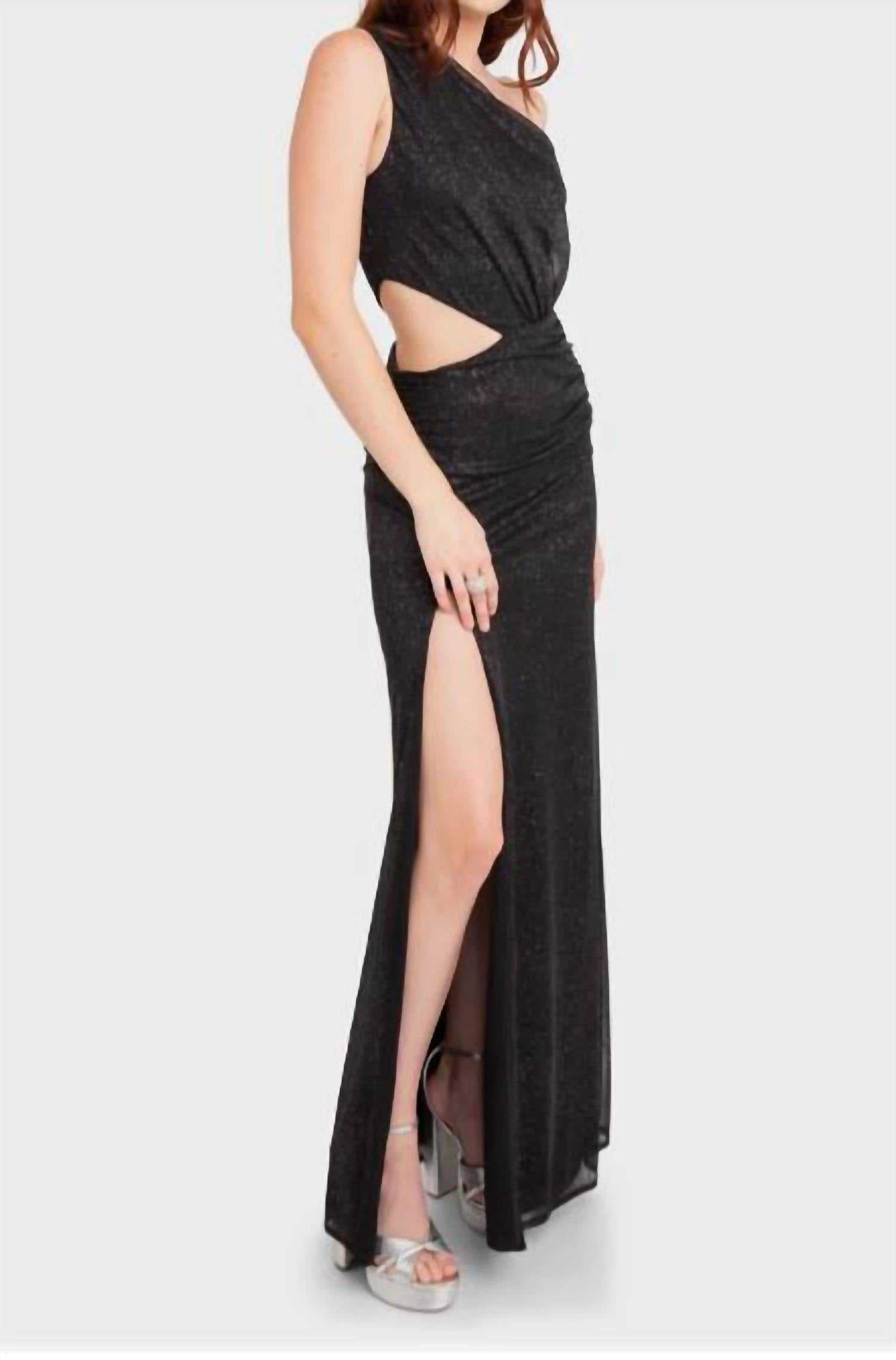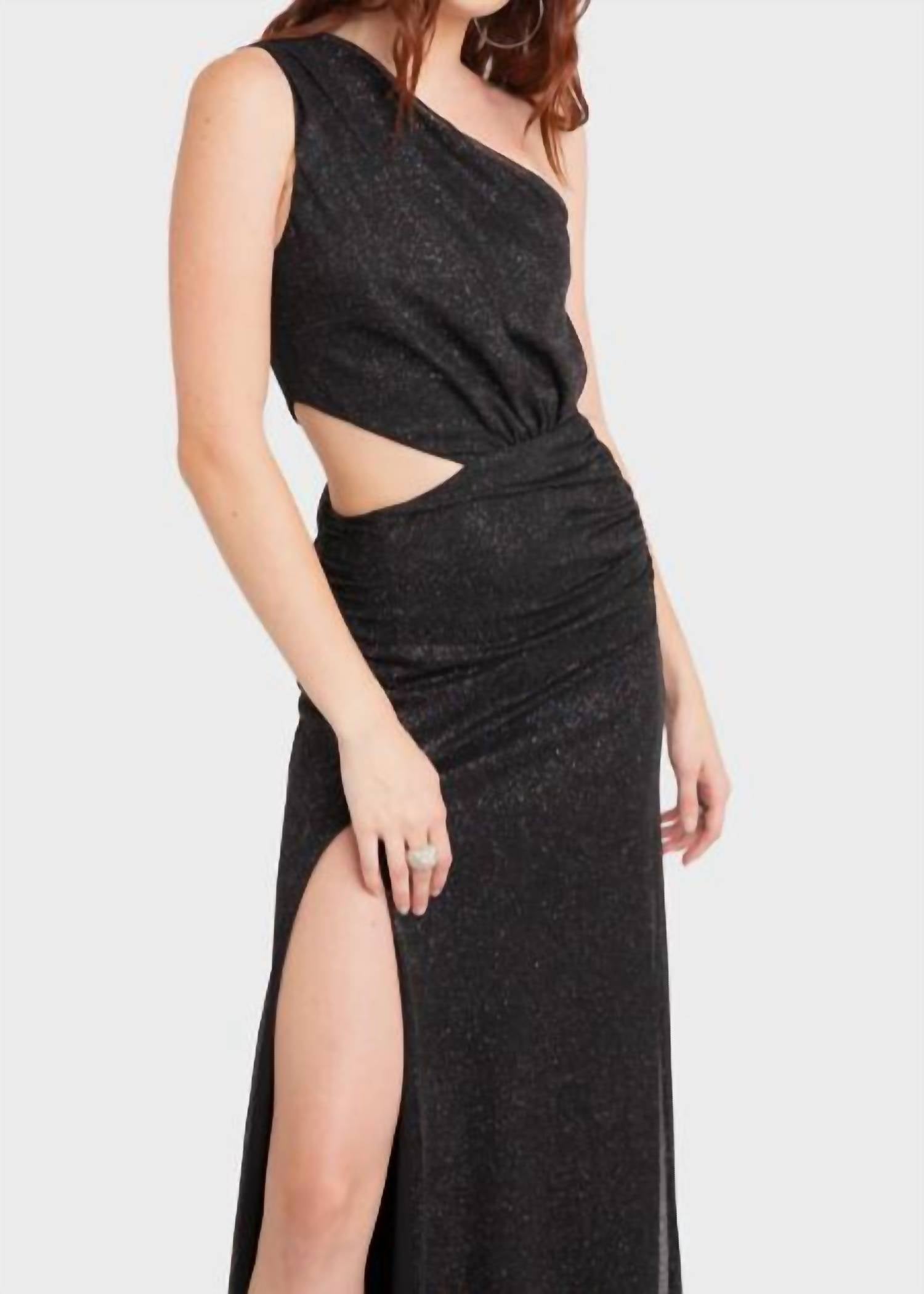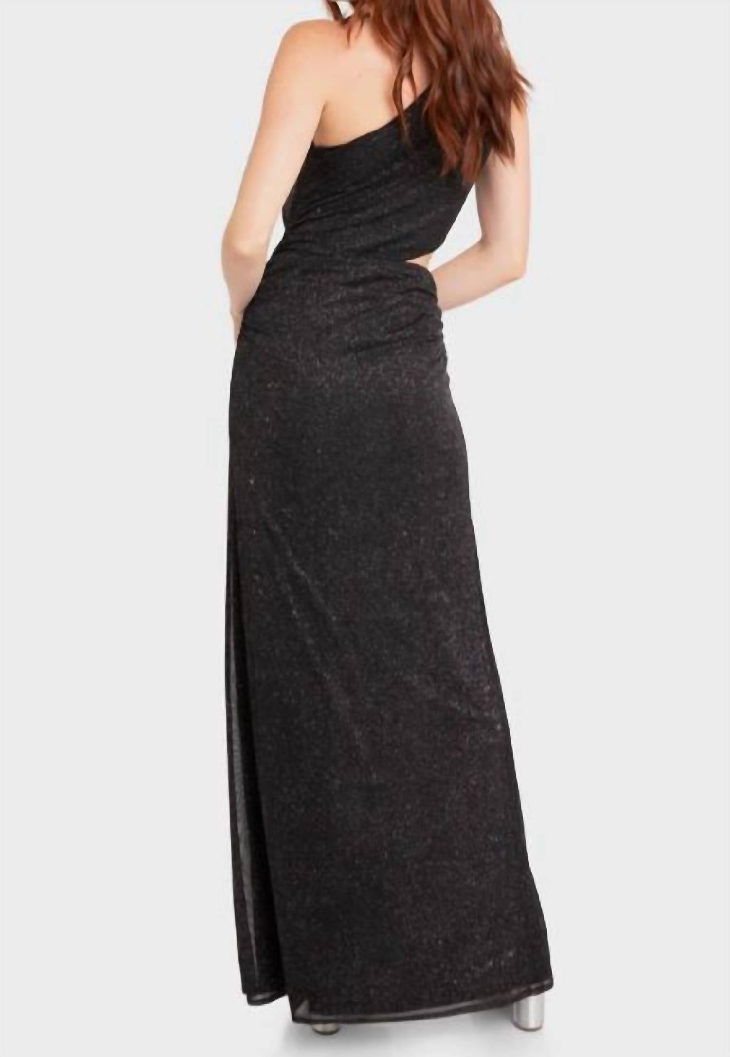 Just add a cute little clutch and a matching heel for the perfect event look. Step into elegance with the Damari One Shoulder Cutout Gown by Black Halo, an exquisite choice for any evening event. This sleeveless gown showcases a sheath silhouette and a striking off-the-shoulder neckline, perfect for New Year's Eve celebrations. Draped in a black multi-sparkle finish, it features a cutout design and a daring slit. Closure: Pull-on. Care: Dry clean only.