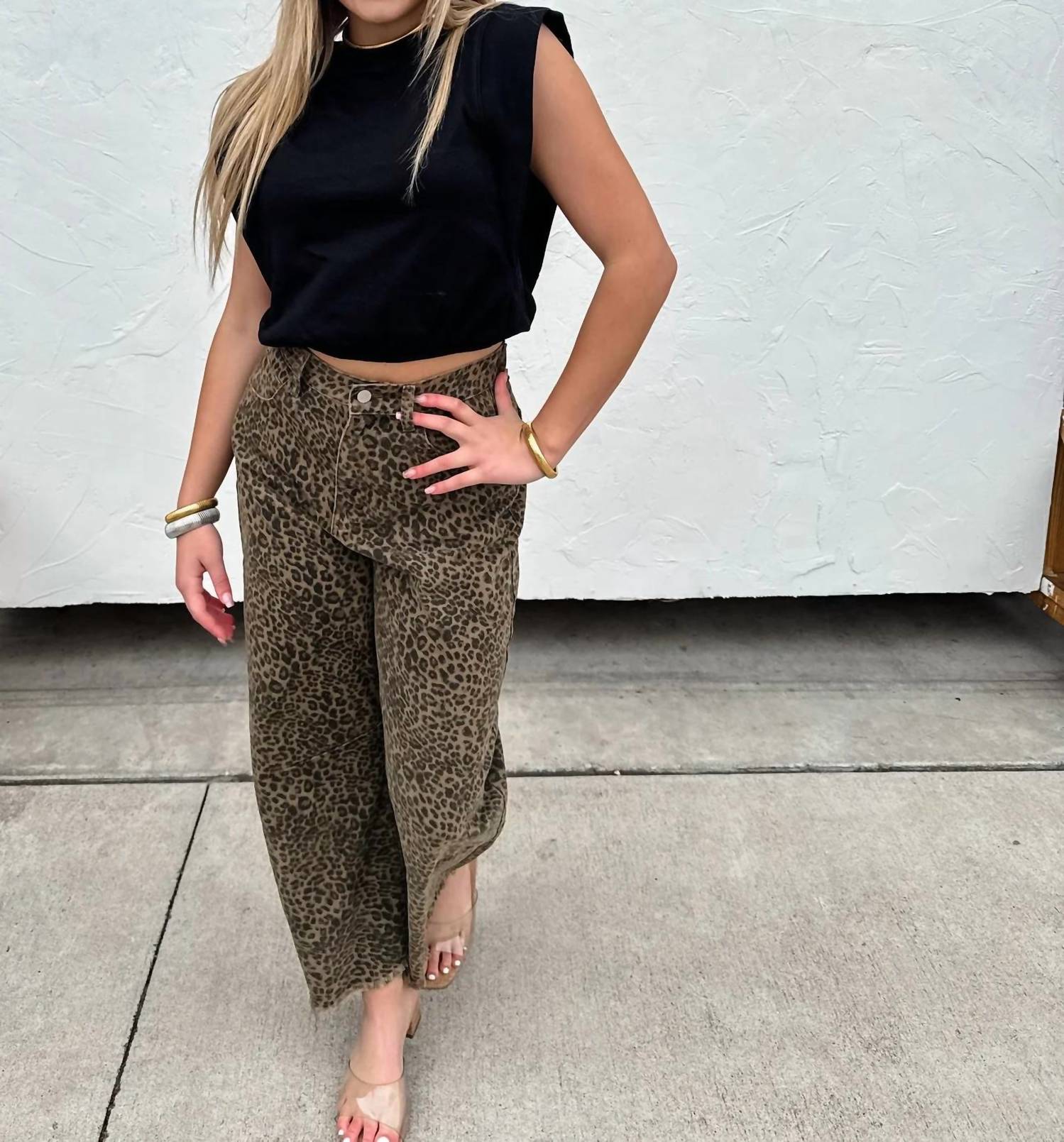 Just as cute as they are comfortable. Unleash your wild side with the Cheetah Print Barrel Leg Jeans by Blakeley, where bold design meets laid-back comfort. These high-rise jeans feature a wide-leg, relaxed fit and are crafted from 100% cotton, highlighting a rigid, non-stretch composition that balances structure and comfort. They come with practical pockets and a button closure, perfect for a boho chic, travel-ready wardrobe. Care is easy with machine washable fabric; simply pair with a black tee and boots for a standout look.