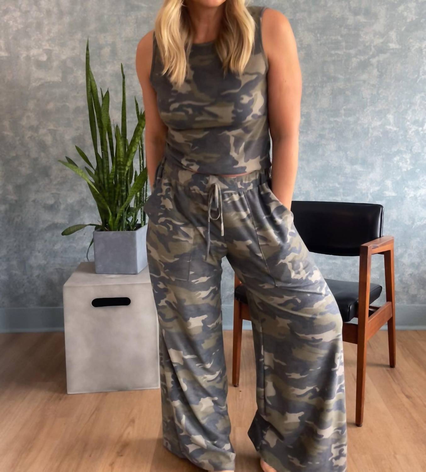 Embrace effortless style with the Haven Camo Wide Leg Pants by BLAKELEY, crafted for women who appreciate comfort and fashion-forward design. These pants feature a mid-rise, relaxed fit with a comfort elastic waistband and drawstring ties, complemented by a wide-leg silhouette. Made from durable polyester in a striking camouflage pattern, these pull-on pants are perfect for casual outings or cozy days at home, complete with functional pockets for added convenience. Whether you're tackling your daily tasks or relaxing, these pants offer versatile styling for every season and occasion.