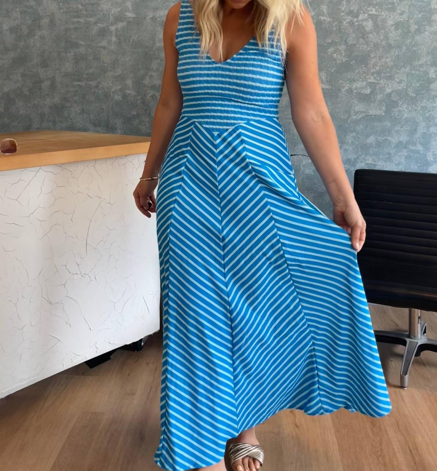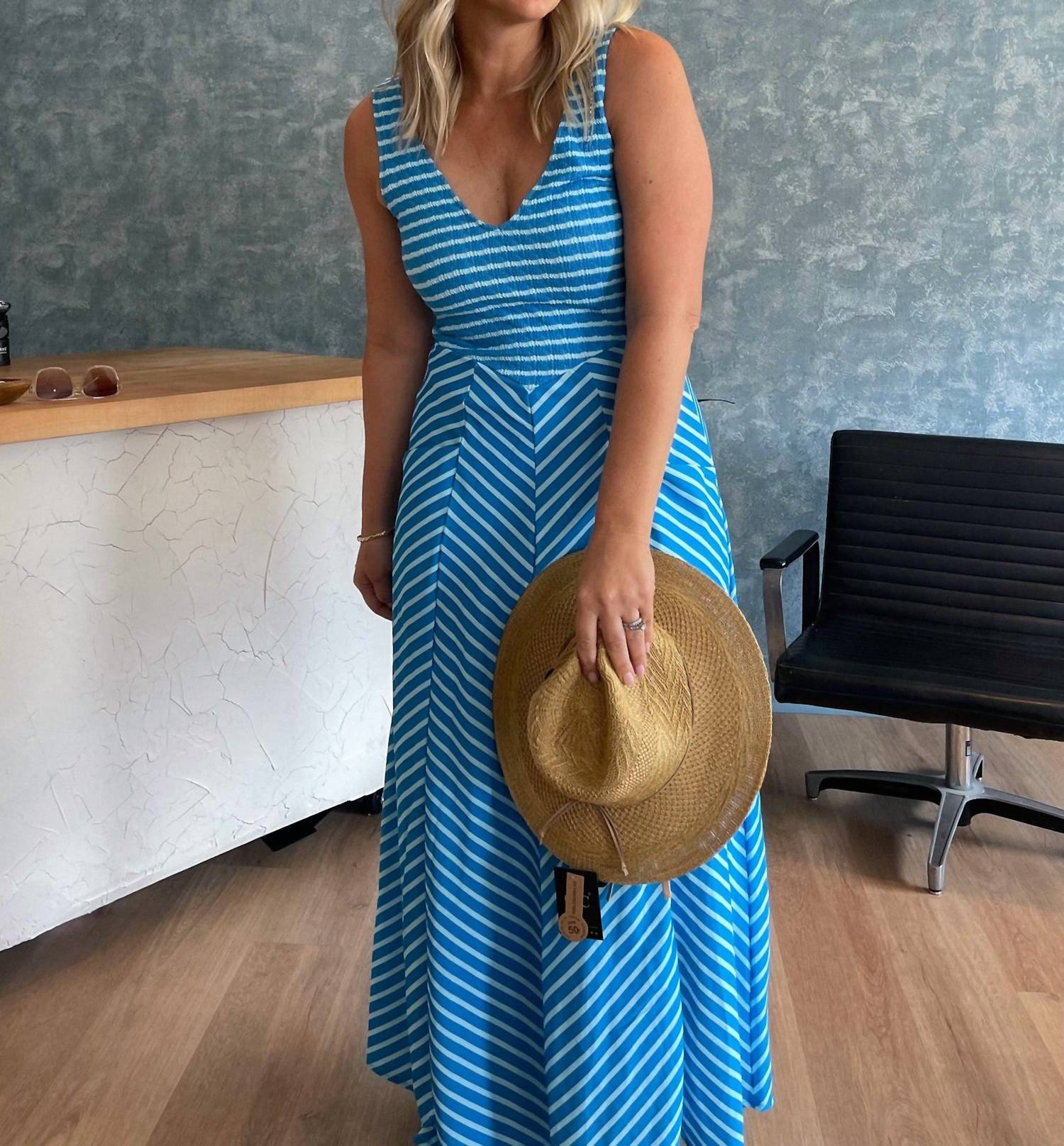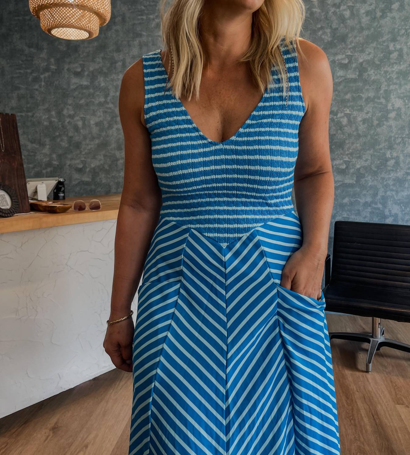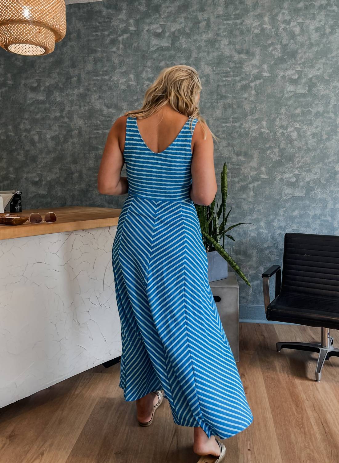 A maxi dress that is just as cute as it is comfortable. Meet the Luciana Stripe Maxi Dress by BLAKELEY, your go-to summer staple for minimalist style and holiday parties alike. This sleeveless A-line maxi dress in refreshing blue features a textured, fitted bodice with V-neck details at both front and back. The flowy, striped polyester blend skirt offers convenient pockets, making it both stylish and functional. Closure: Easy pull-on design.