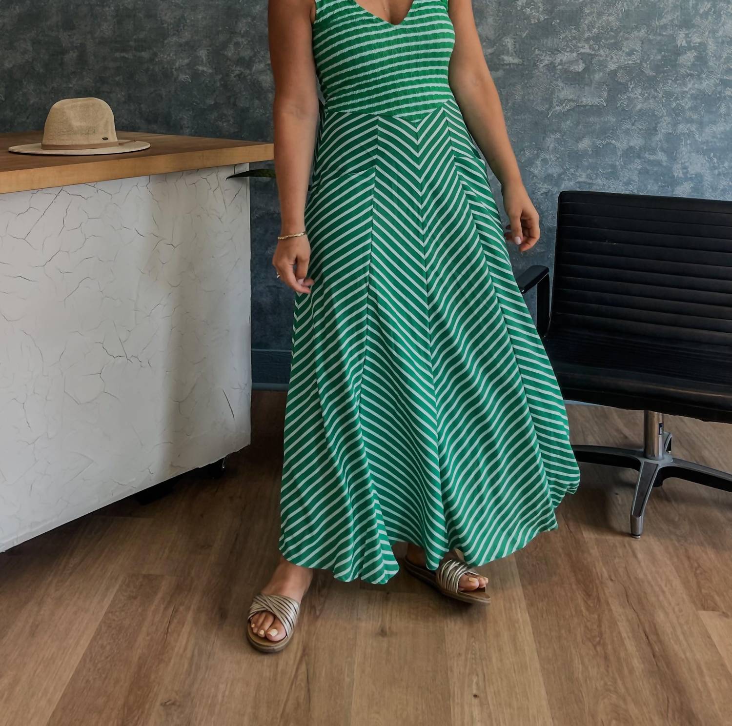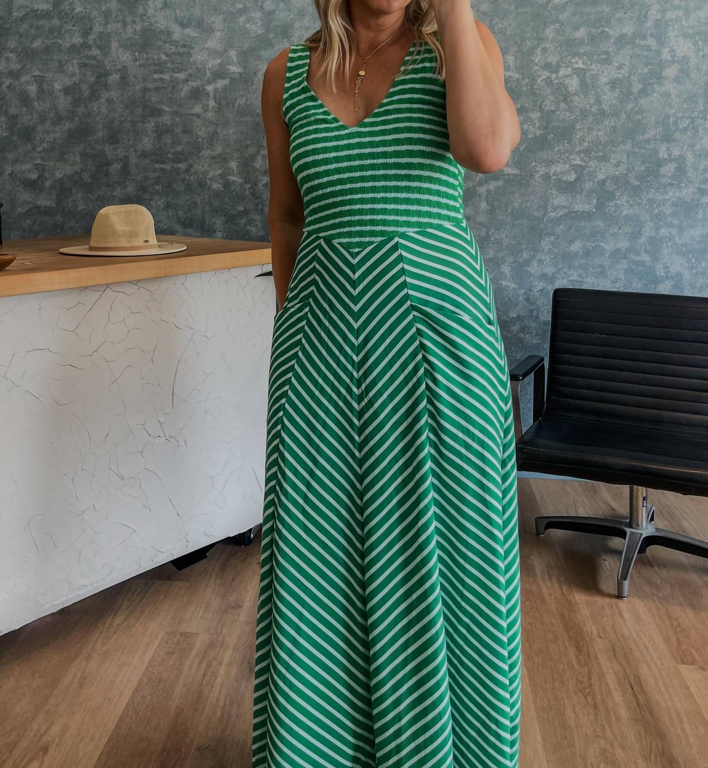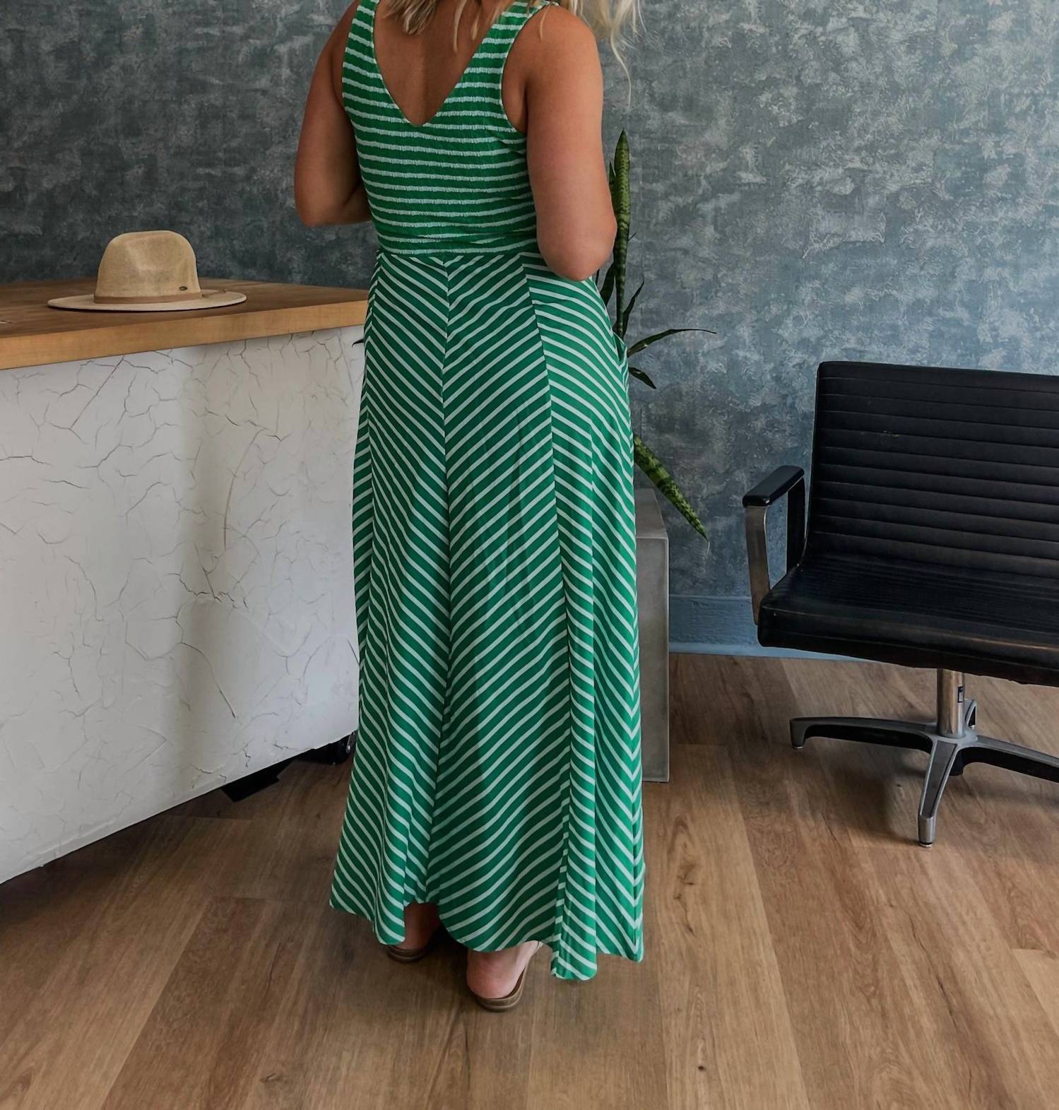 Who doesn't love a good maxi dress? This one you'll be reaching for season after season. The Luciana Stripe Maxi Dress by BLAKELEY is the perfect choice for a sophisticated yet comfortable holiday party look. Designed in a vibrant green stripe, this sleeveless dress features a flattering A-line silhouette with a fitted bodice, and elegant v-neck and back detailing. Made from a breezy polyester blend, it has a flowy skirt enhanced with seam details and practical pockets, making it both stylish and functional. Closure: Pull on.