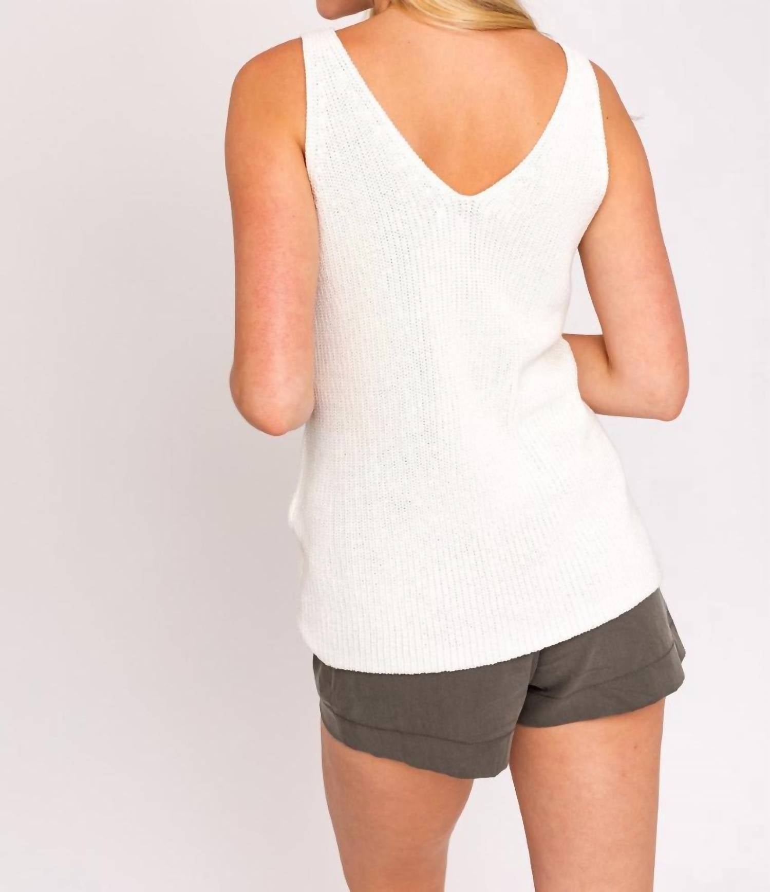 Fit, fabric and functionality. This tank top checks all the boxes. Elevate your holiday party ensemble with the V-neck Sweater Tank by Blank, a minimalist piece perfect for fall. Crafted in a textured ivory fabric, this women's tank is designed with a V-neck at both the front and back, adding a sophisticated touch. Its sleeveless style and pull-on closure ensure a sleek and comfortable fit.