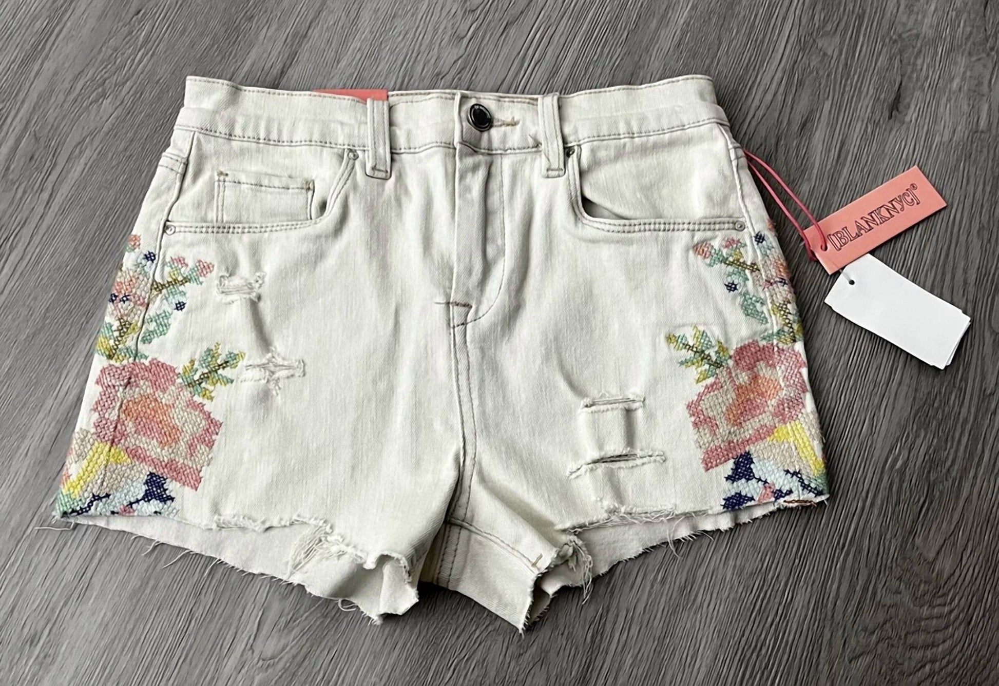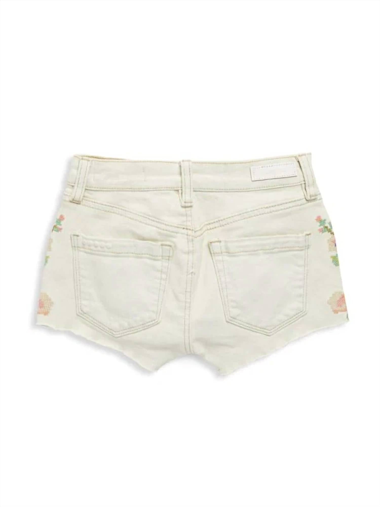 Introducing the BLANKNYC Girl's Closer Together Shorts in White, a vibrant addition to your summer wardrobe with multi-colored cross-stitch floral embroidery. These shorts are crafted from a cotton blend, providing comfort and style, with a raw-edge hem for a trendy finish. They feature a zip-fly and button closure along with classic five-pocket styling. Care for them is easy with machine wash instructions and a simple line dry. Measurements: Waist 25.5 in, Outseam 10.5 in, Inseam 2.5 in, Front Rise 10.5 in, Back Rise 12.75 in, Leg Opening 20 in.