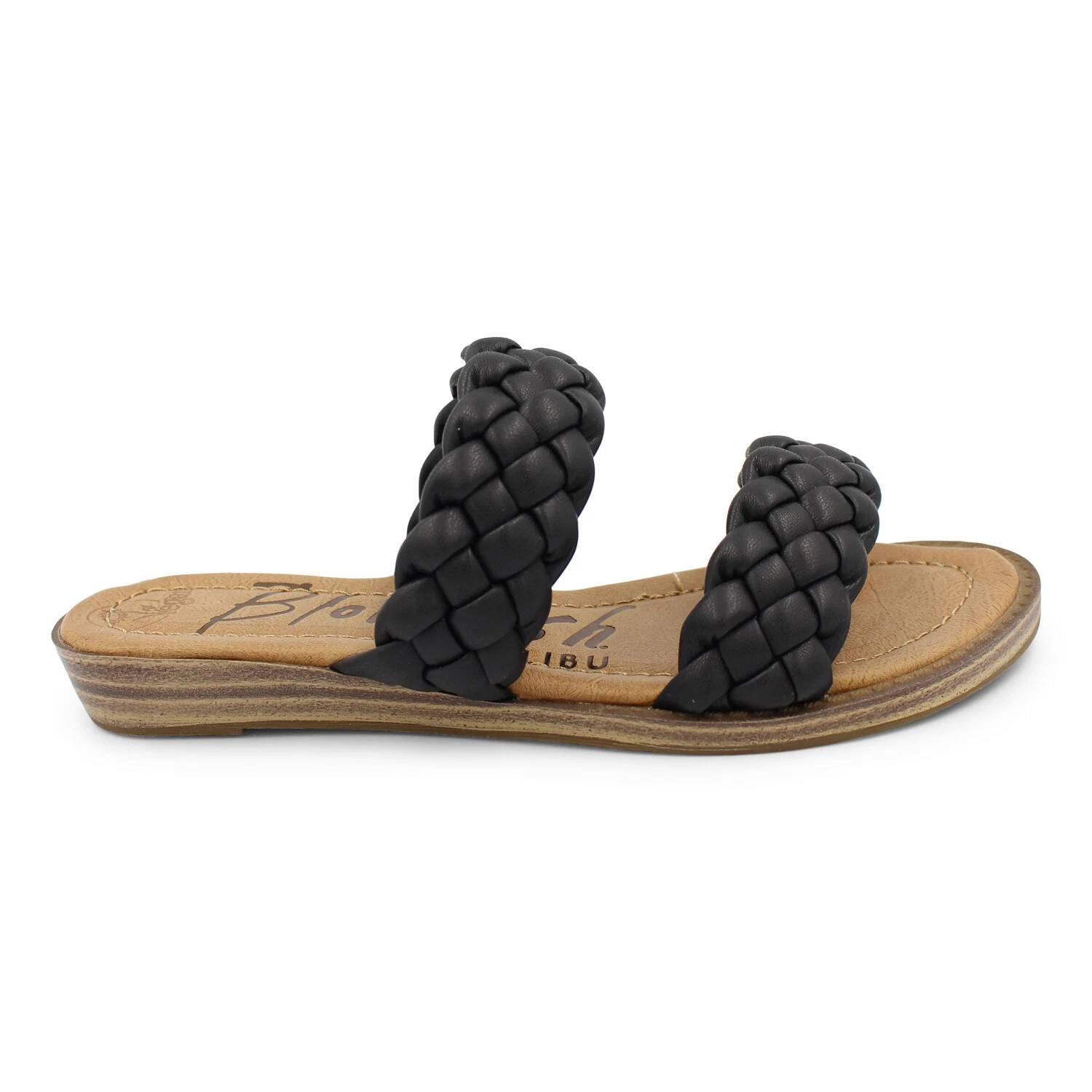 This sandal will take you from brunch to dinner and everything in between. Step into summer with the Blowfish Malibu Women's Bolley Braided Top Strap Sandals in classic black, perfect for both vacations and everyday wear. These sandals feature stylish puffy braided straps and a lightly padded footbed for all-day comfort. Crafted with a faux leather upper and a durable rubber sole, they combine minimalist design with practicality. Designed with a slip-on closure, these flat sandals are ideal for the warm-weather season.