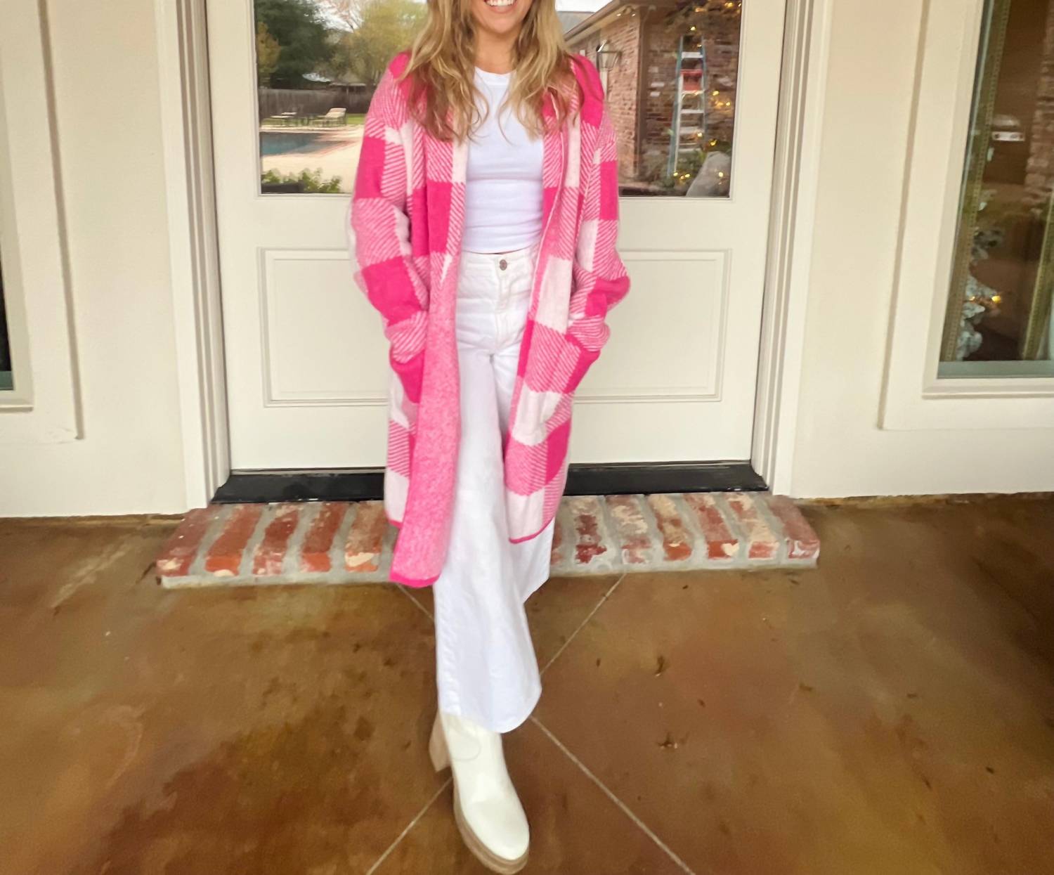 Throw this adorable cardigan over any cami or tank top. Elevate your wardrobe with the Angel Cardigan by Blue B, a must-have for any fashion enthusiast. Crafted from 85% Polyester and 15% Viscose, this charming pink and white gingham pattern cardigan features long sleeves and practical front pockets, making it perfect for fall getaways. Its V-neck design complements its preppy style, ensuring you look chic on any vacation. Care instructions not provided, but this versatile piece will enhance your collection with its playful pattern and undeniable style.