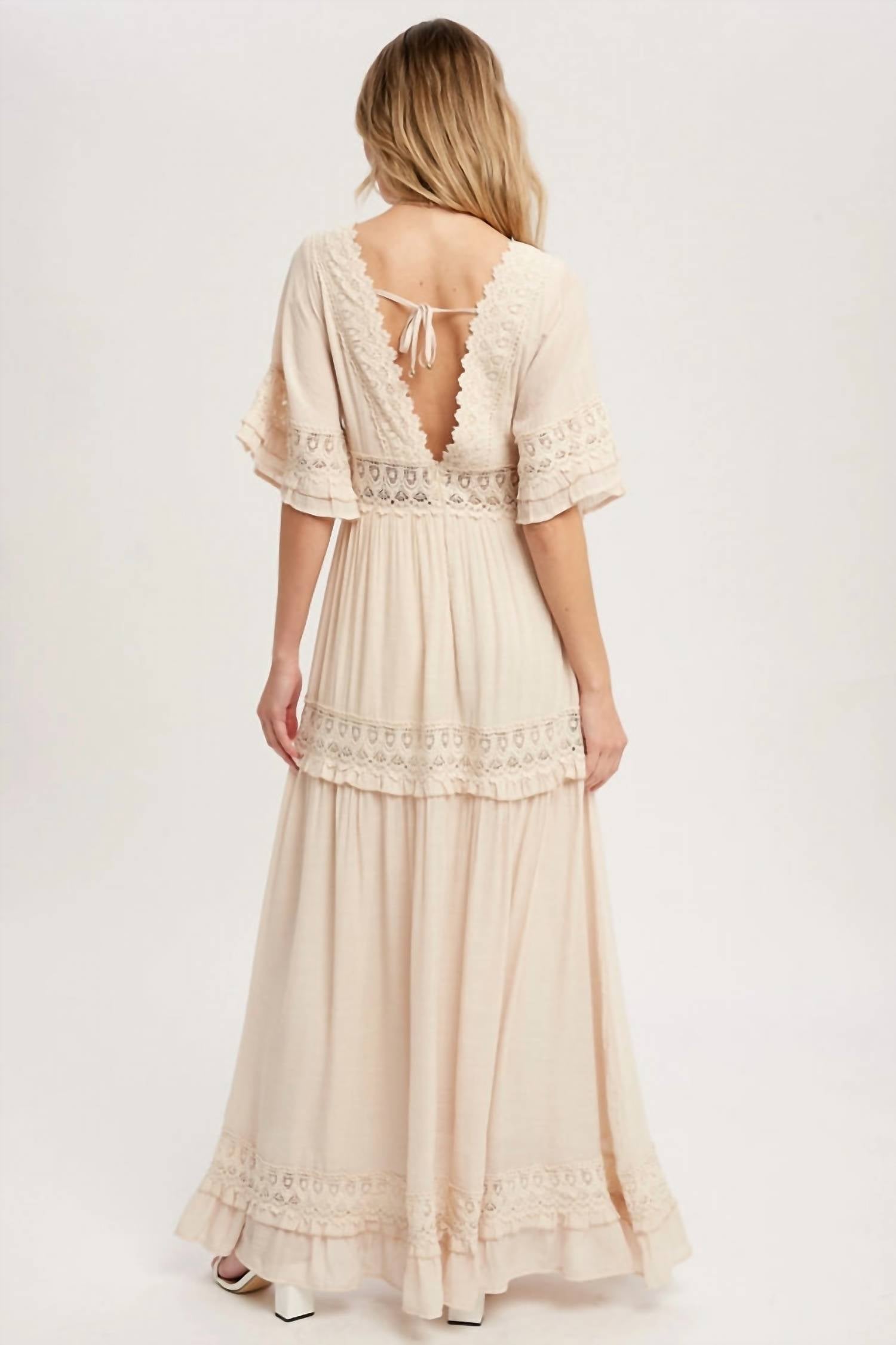 Style this maxi with your favorite statement necklace and sandals for the perfect look. Discover the Cream Elegant Lace Maxi Dress with Short Sleeves by BluIvy, perfectly blending elegance and charm in a Boho Chic style. With elbow sleeves and a flattering V-neckline, this A-line maxi dress is crafted for summertime vacations. Featuring a textured pattern with delicate lace and crochet frill trimming, it creates a captivating and feminine silhouette. Closure: Button closure. Care instructions: Hand wash and lay flat to dry. Ideal for women looking for a sophisticated yet romantic addition to their wardrobe.