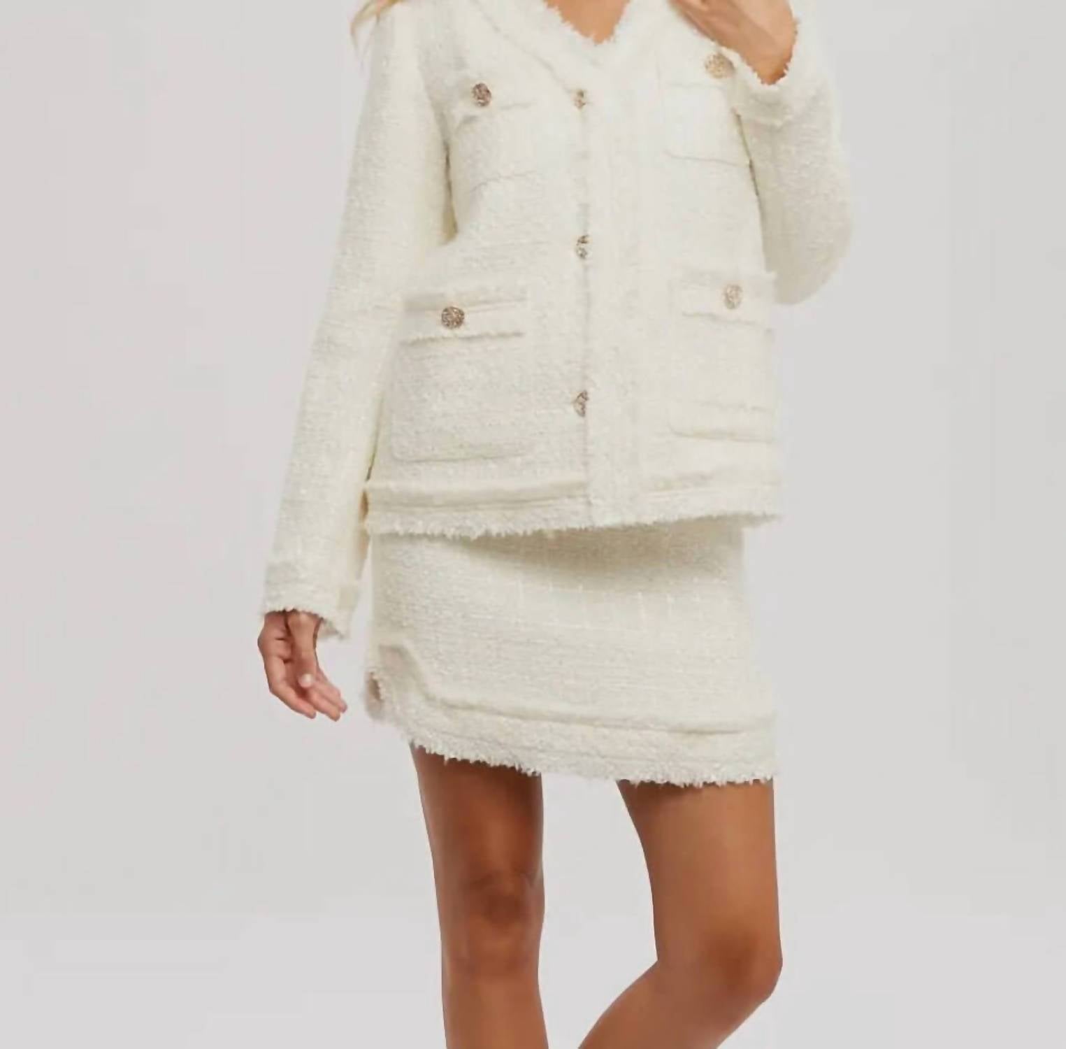 Tuck in your favorite tee for a more laid-back vibe. Introducing the Tara Tweed Skirt by BluIvy, a stunning piece that promises to make you shine. This women's mini skirt is crafted from an 80% Acrylic, 20% Wool blend in a textured tweed fabric that's enhanced with sparkle threading throughout. The design is completed with gold button detailing and a zip closure for a touch of elegance and edge. Hand wash recommended.