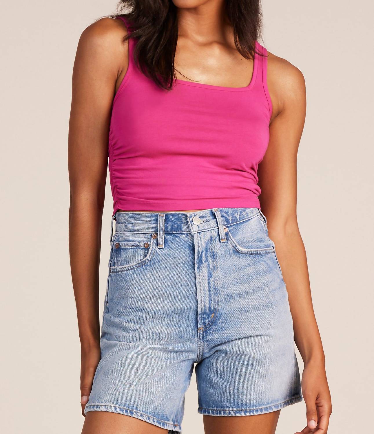 The perfect tank top for those warmer weather seasons. Introducing the Bobi Shirred Side Top, a fashion-forward addition to your wardrobe perfect for summer getaways. This sleeveless, pink tank top features a chic square neckline and stylish shirred side detailing that creates a flattering silhouette. With its pull-on closure and solid pattern, this top embodies trendsetting streetwear vibes ideal for vacation. Made for women who value both comfort and style, this piece can be effortlessly paired with a matching skirt for a complete look.