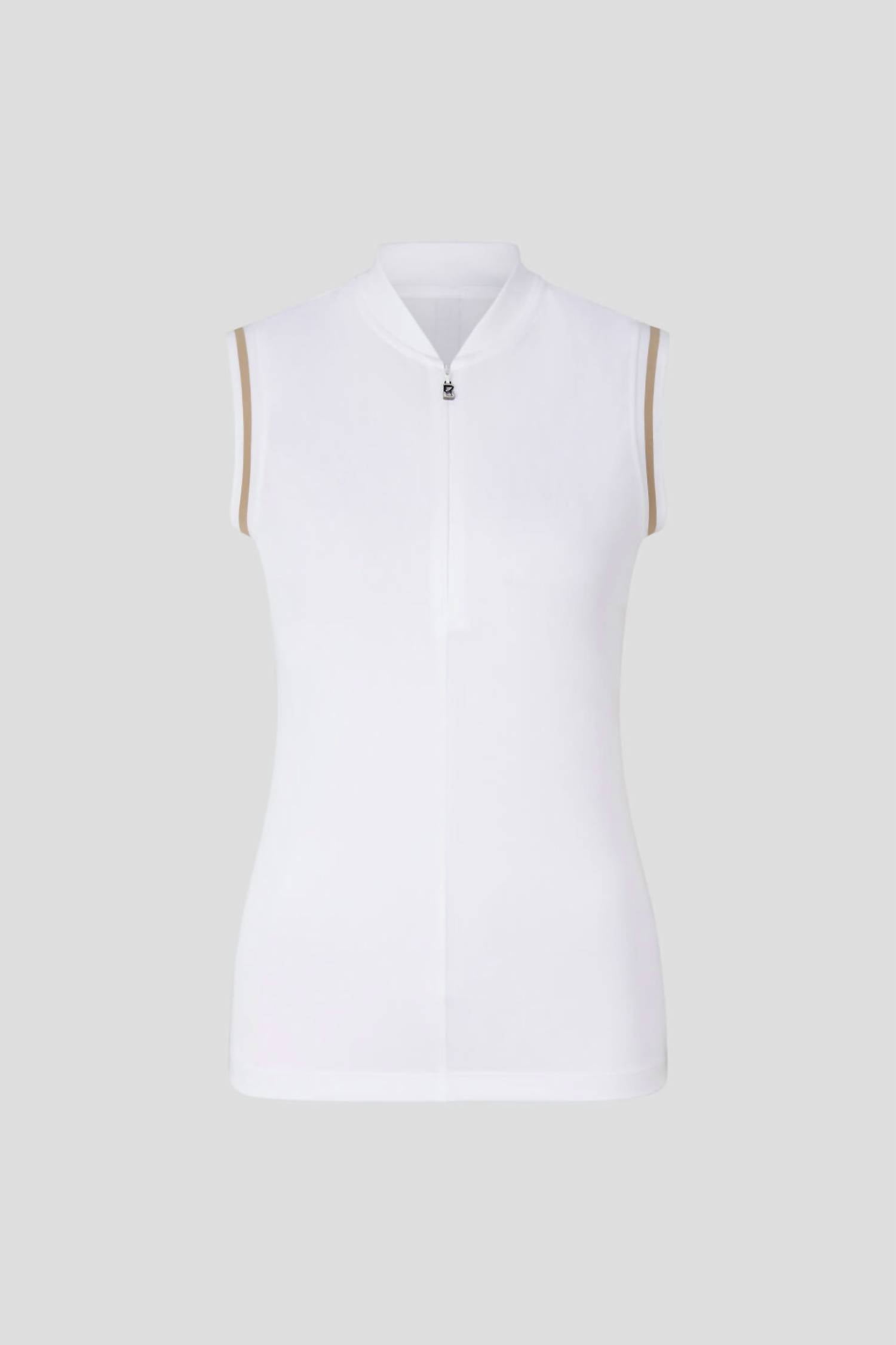 Pair this with your favorite jeans and slides for your next girls night out. Elevate your game day look with the Bogner Fire + Ice Women's Sport Evi Top in classic white. This sleeveless blouse features a fitted stand-up polo collar adorned with a concealed 'B' logo zip, complemented by ribbing armholes with contrasting stripes for added flair. The top is crafted from moisture-regulating technical piqué polyester, offering both performance and style. Ideal for summer, this solid-patterned activewear piece boasts a zip closure for practicality.