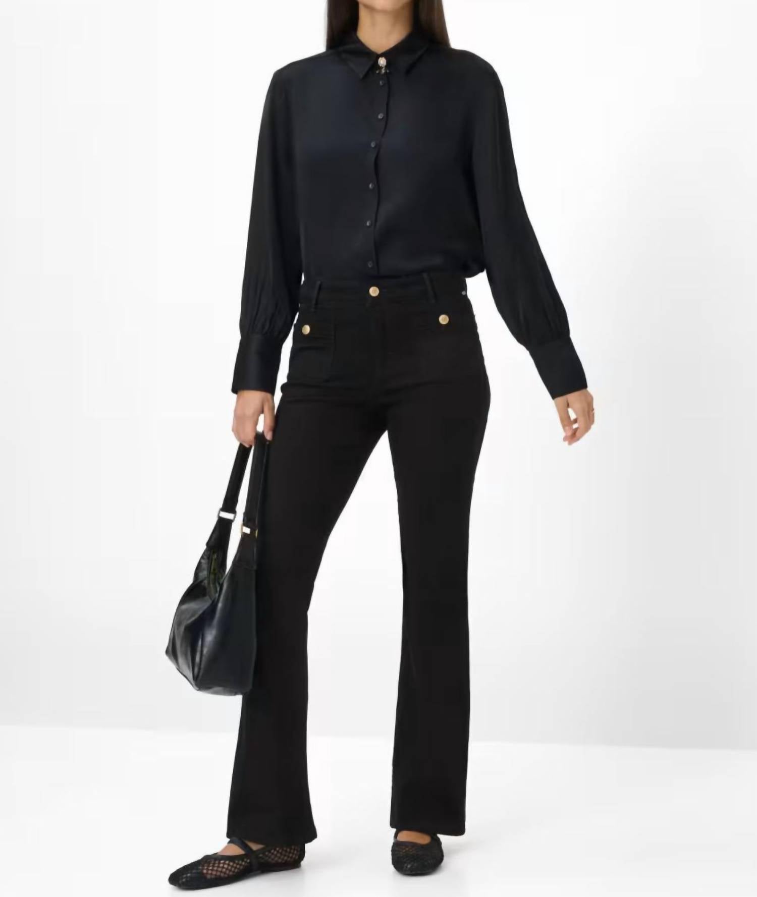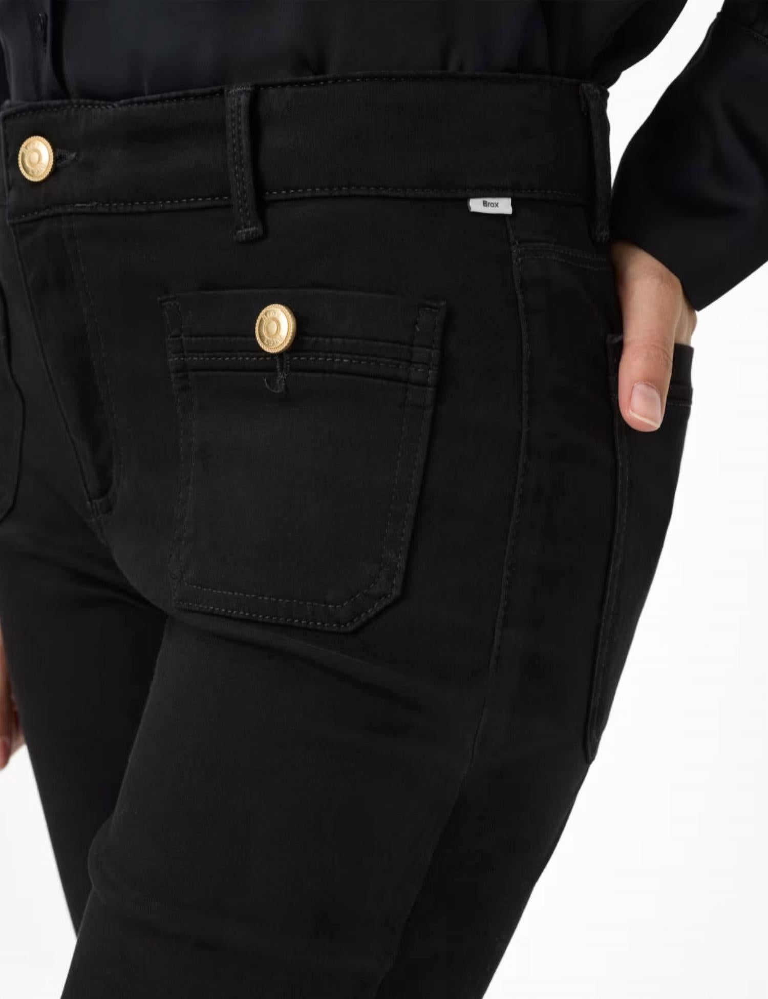 Elevate your wardrobe with the Shakira Bootcut Pant by Brax, designed in an autumnal black hue perfect for any fashion-forward woman. These stylish trousers feature a slim, slightly flared bootcut silhouette and high-rise waist, crafted from a durable cotton blend of 40% Lyocell, 28% Modal, 17% Cotton, 12% Elastomultiester, and 3% Elastane. The classic five-pocket style is redefined with decorative gold buttons, adding a touch of elegance to the regular fit. For convenience, these trousers offer a pull-on closure and are easy to care for with a gentle machine wash.