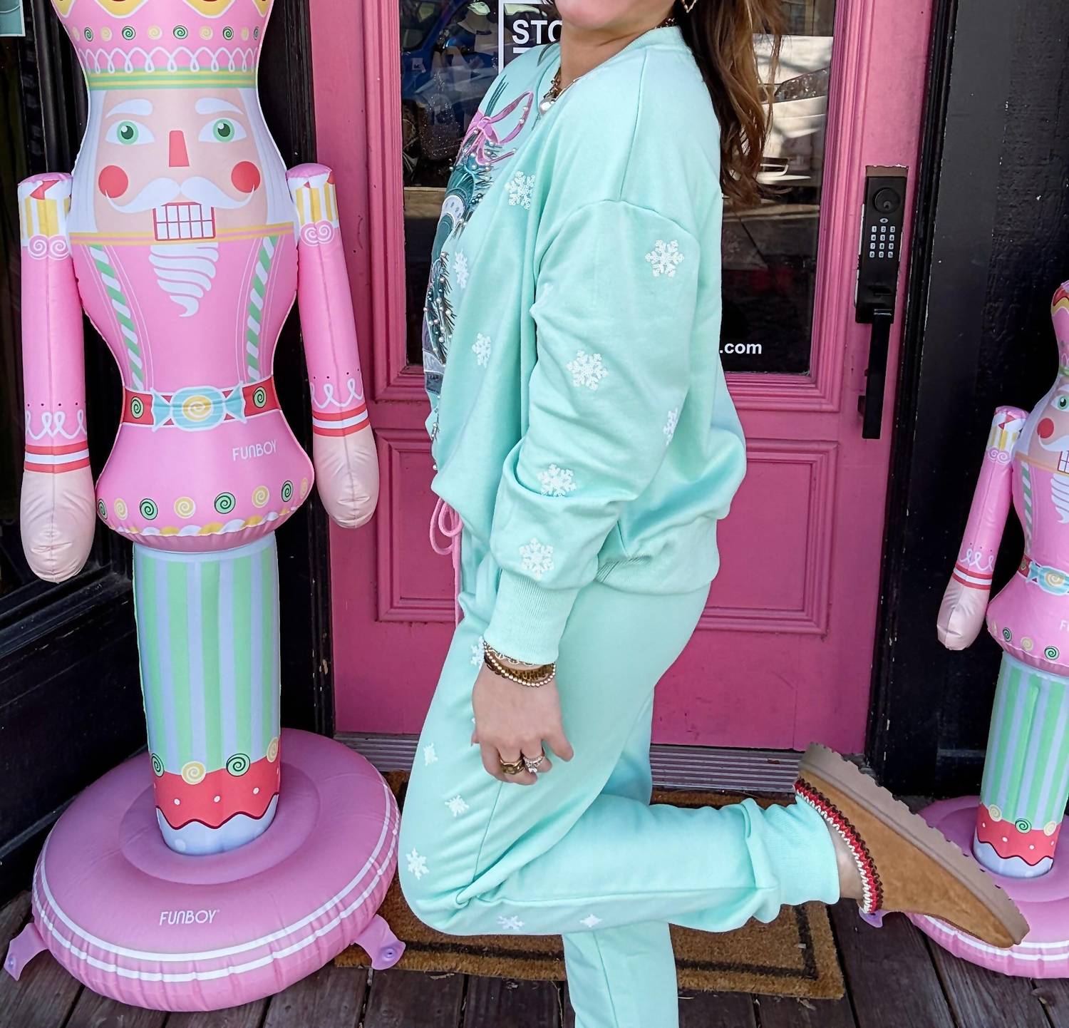 The perfect pant for running around town and looking cool while doing it. Elevate your loungewear with the Sequin Snowflake Sweatpants by Brianna Cannon, a chic choice for the holiday season in a festive green hue. These sweatpants feature a high-rise waist and a tapered leg style, with a regular fit perfect for cozy nights. Made from a soft cotton blend with 80% cotton and 20% polyester, they include a pull-on closure for easy wear. Care is effortless with machine wash and tumble dry instructions, making them ideal for matching holiday looks or relaxing at home. Available with waist measurements starting from 27.5" for size small.