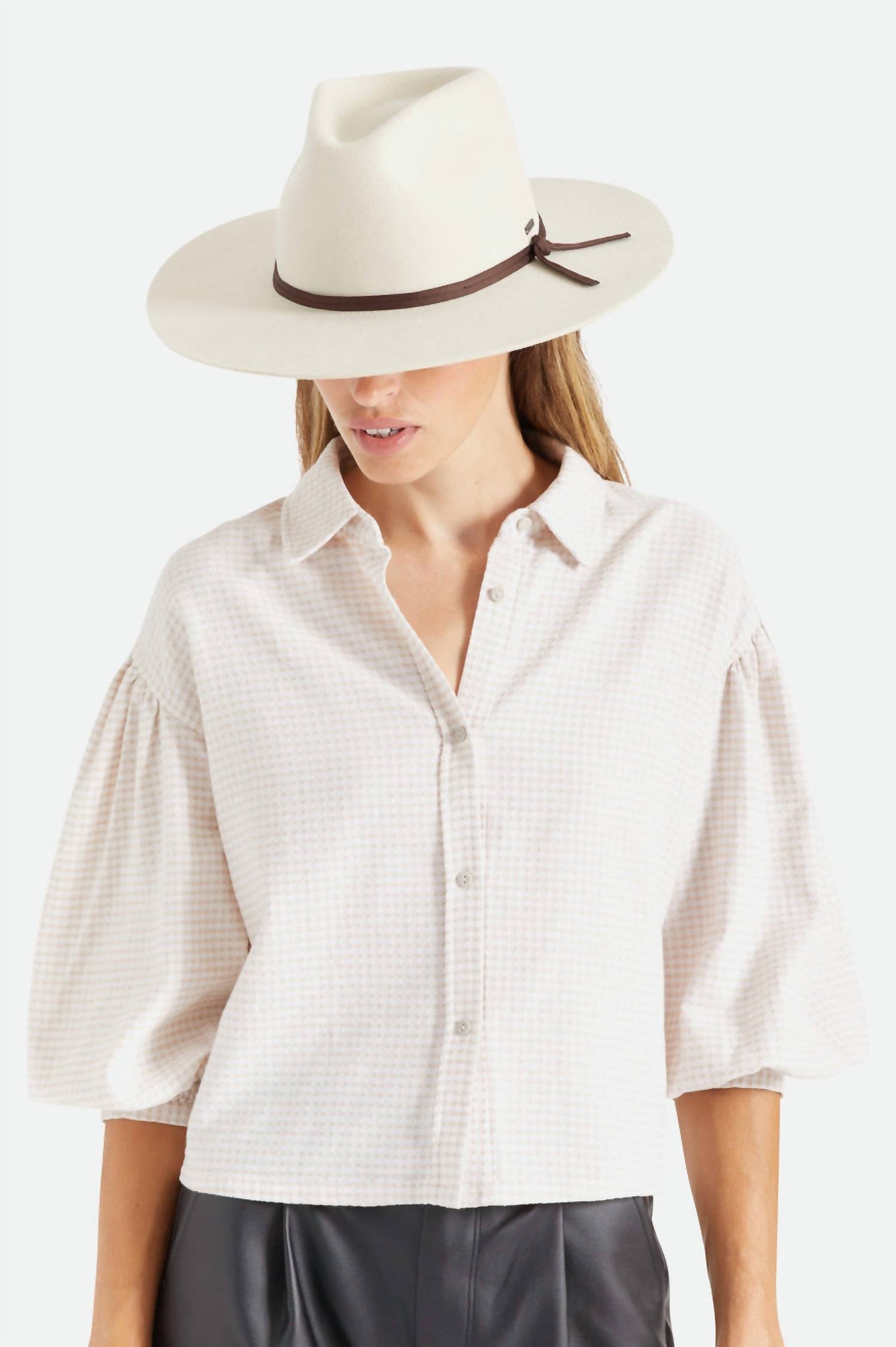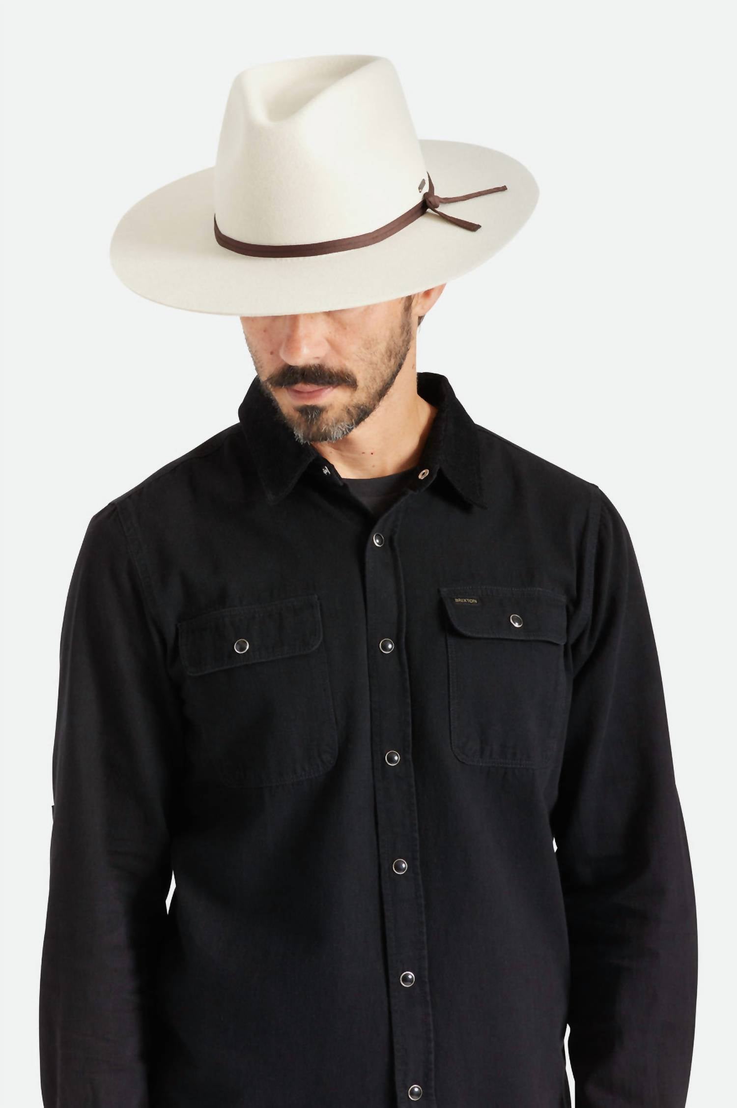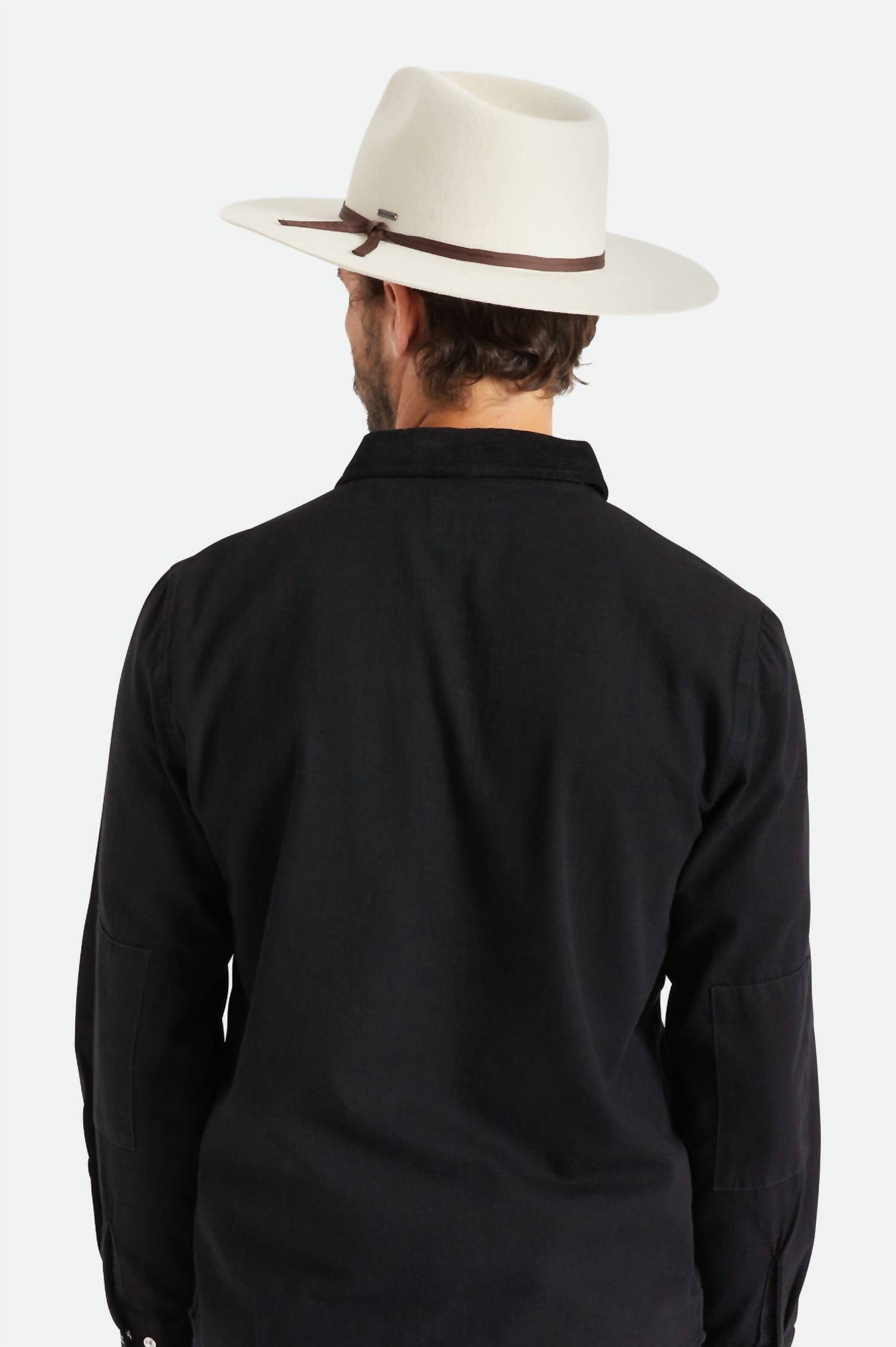 Elevate your style with the Brixton Cohen Cowboy Hat in a sophisticated dove hue. Crafted from 100% cruelty-free wool felt, this structured wide-brim hat measures 8.3 cm (3.25") and features a raw edge. It is elegantly finished with a thin grosgrain band and a distinctive metal Brixton pin. The adjustable interior sweatband ensures a perfect fit, making it both stylish and practical.