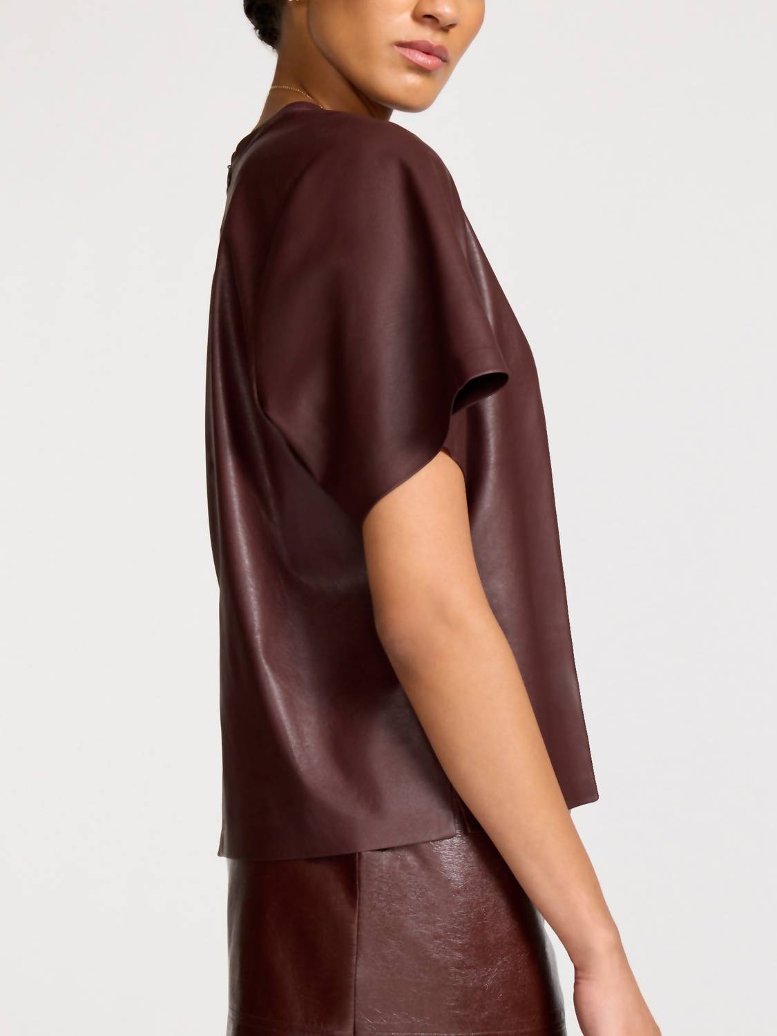 Pair this with your favorite jeans and slides for your next girls night out. The Miles Top by Brochu Walker is a modern take on the classic tee, crafted in maroon vegan leather. This women's blouse features a boxy fit with short sleeves and a crewneck, adding a touch of minimalistic style perfect for holiday parties. Made from 87% Polyester and 13% Polyurethane, it includes an invisible zip closure at the back. Carefully crafted overseas, it's an ideal choice for those embracing a minimalist trend, especially during the fall season. The model is 5'9" and wears a size small.