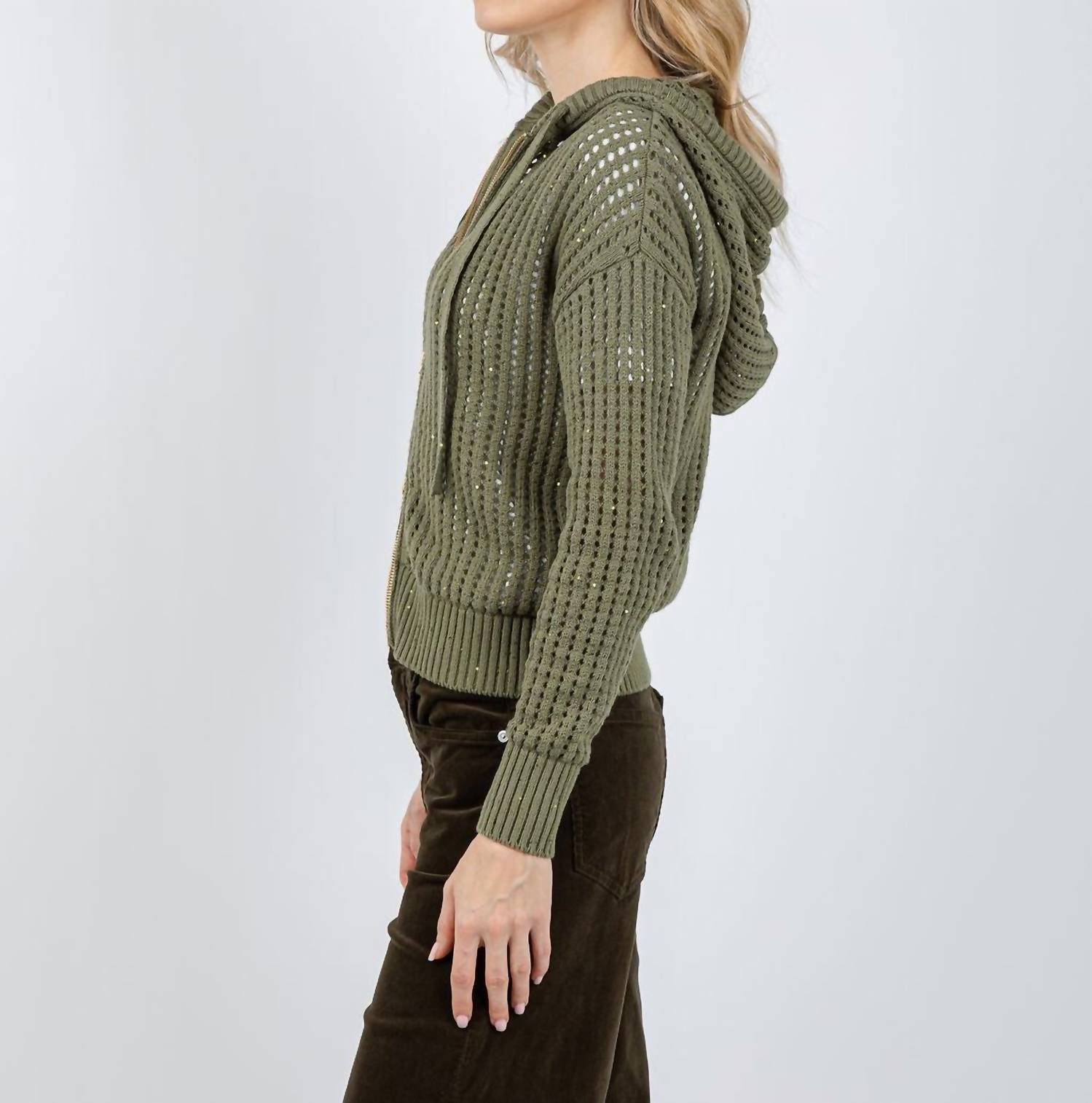 Cooler temps call for layering and we love this adorable sweatshirt for all the obvious reasons. Introduce sparkle to your travel wardrobe with the Astrid Sequin Hoodie by Brodie Cashmere, expertly crafted in olive tones for a minimalist touch. Featuring long sleeves and a comfortable cotton blend composition of 97% cotton and 3% polyester, this piece offers a textured, open crochet-knit finish adorned with delicate sequins. Originating with stylish zip closure and a cozy drawstring hood, this hoodie ensures a polished silhouette with ribbed cuffs and hem. Care for it easily with machine wash, while enjoying its luxurious and relaxed fit as modeled by Anna K, who stands at 5'8" with a 33” bust, 25” waist, and 36” hips.