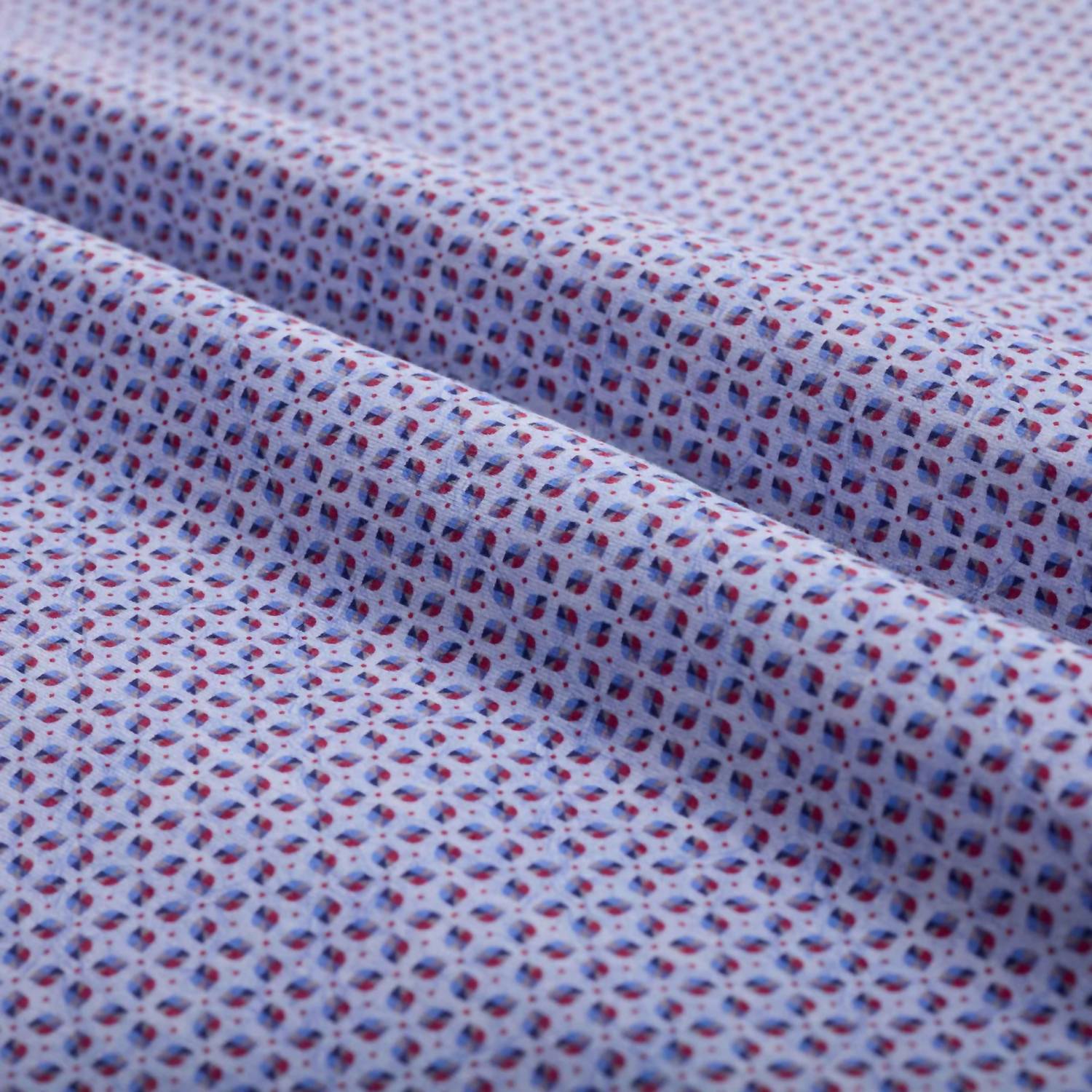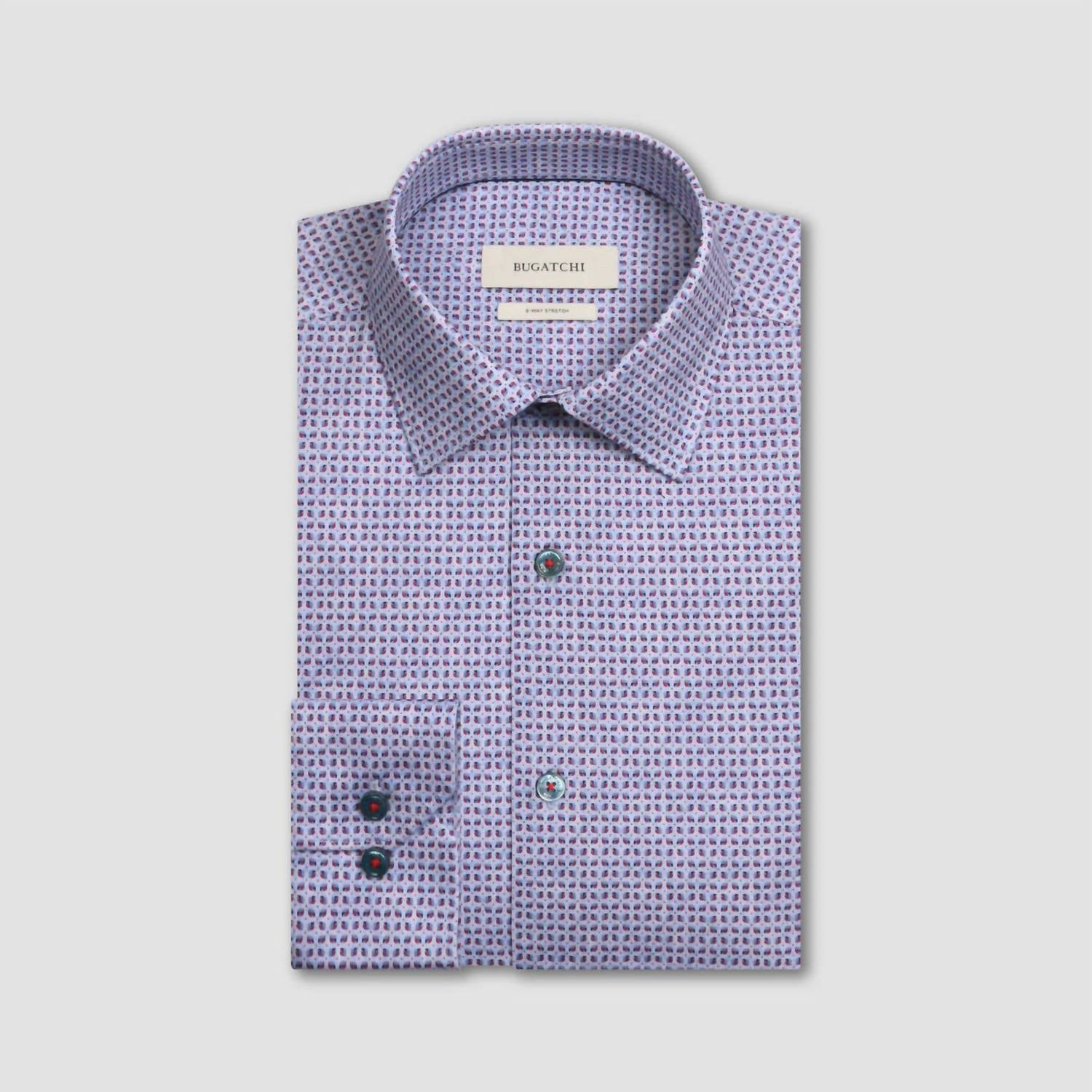Elevate your spring wardrobe with the James Geometric Oooh Cotton Shirt by Bugatchi Uomo in a striking Berry hue. This long-sleeved shirt boasts a stylish geometric print and a classic point collar, complemented by mother-of-pearl buttons and a versatile curved hem. Made from a high-performance Cotton Blend of 92% Cotton and 8% Spandex, this shirt features 8-way stretch, wrinkle resistance, and thermal comfort, ensuring it's as functional as it is stylish. Closure is provided by a full button closure, and the shirt is easy to maintain with machine wash care instructions.