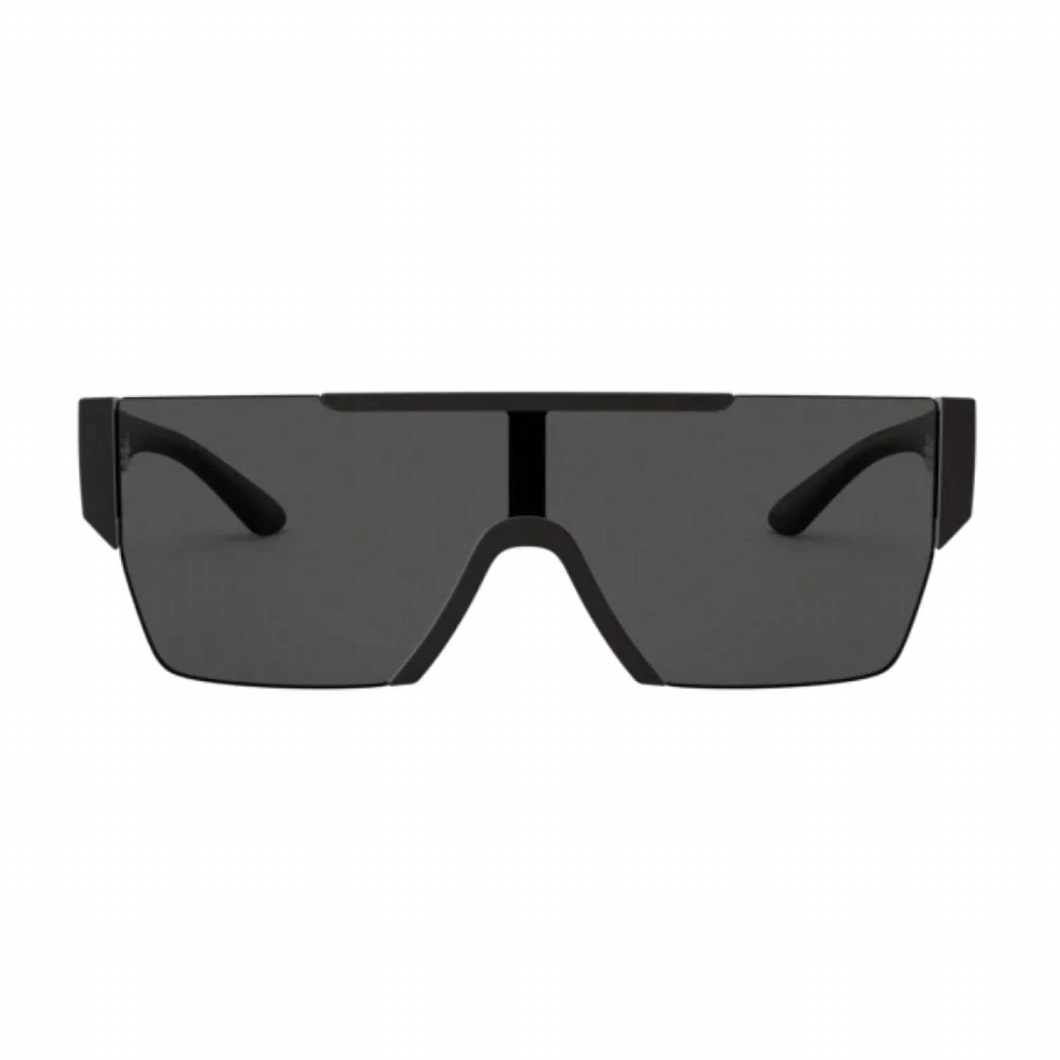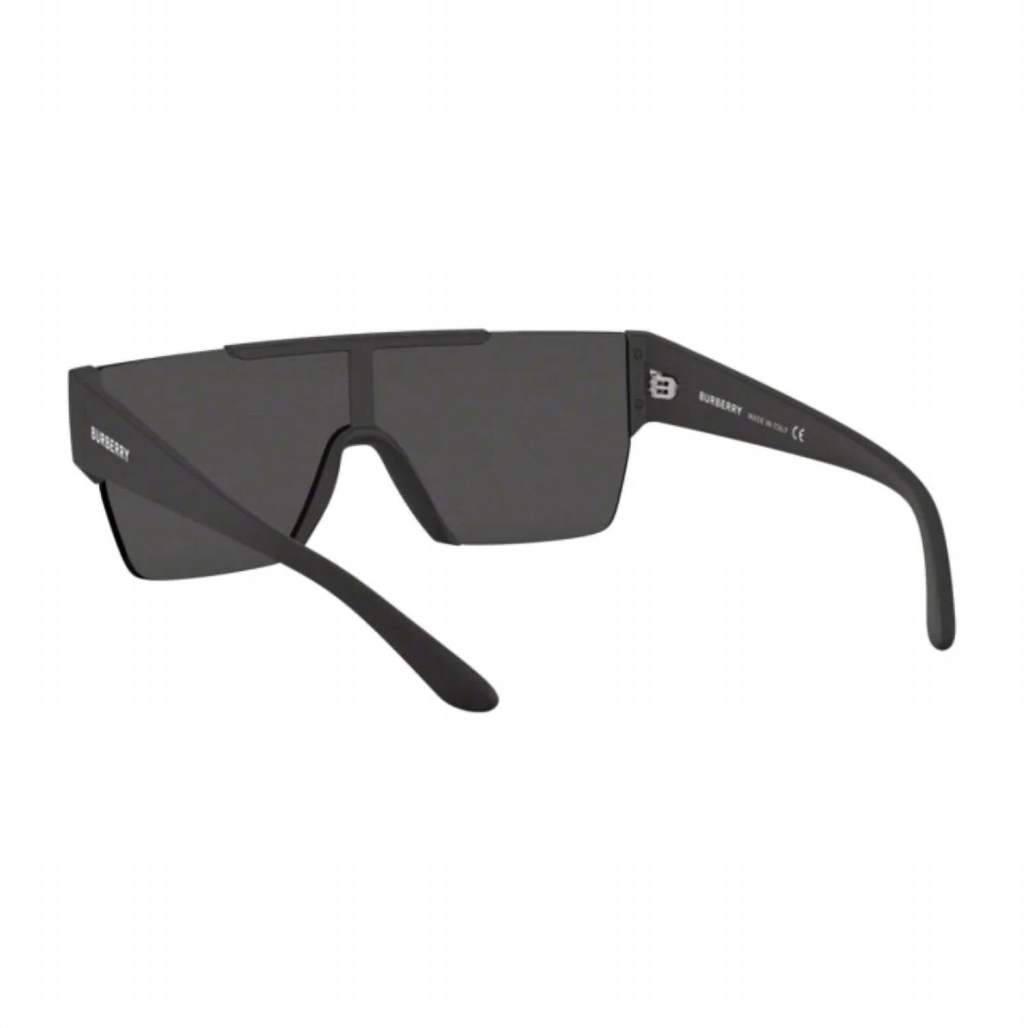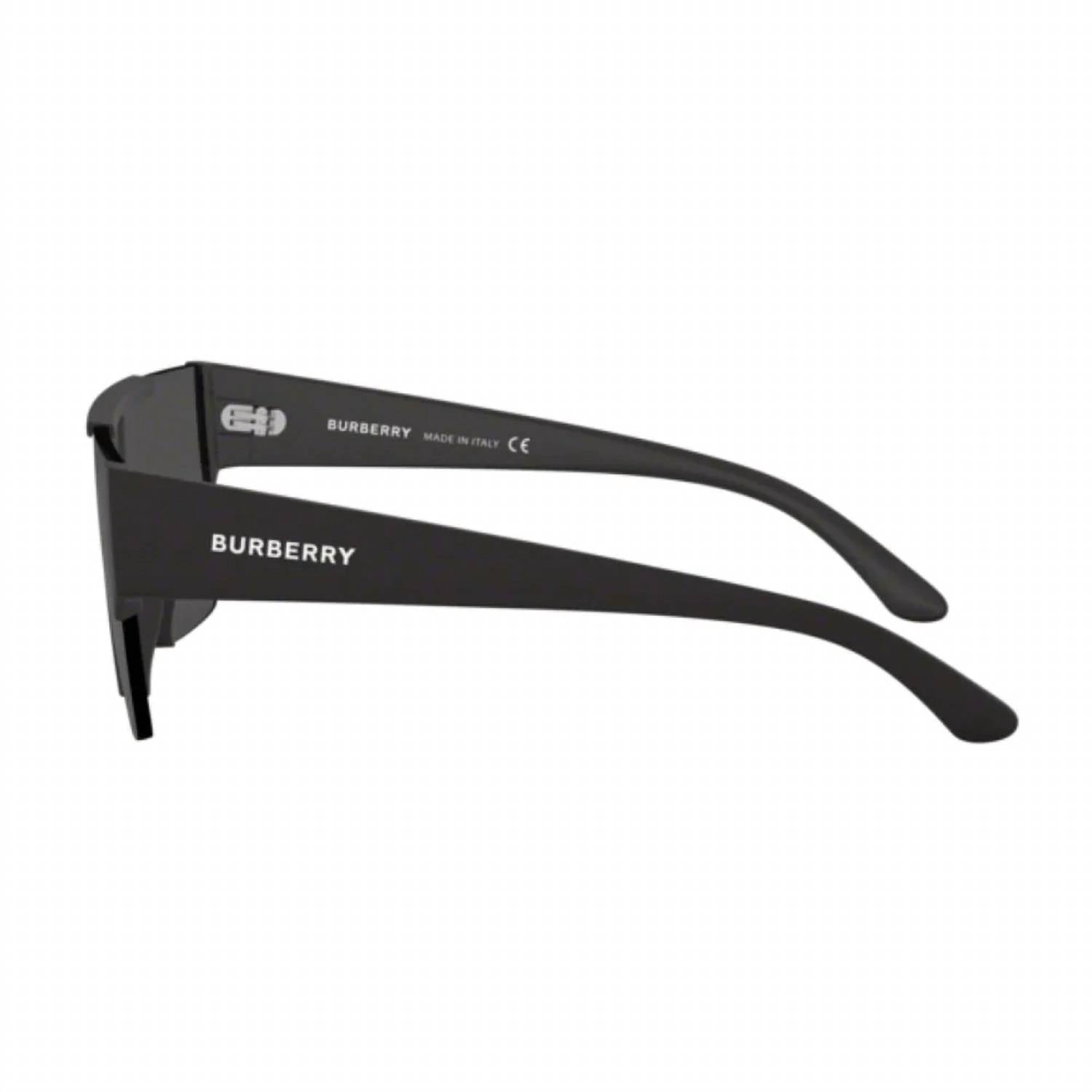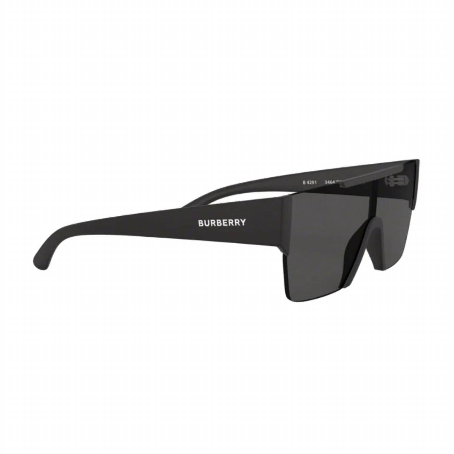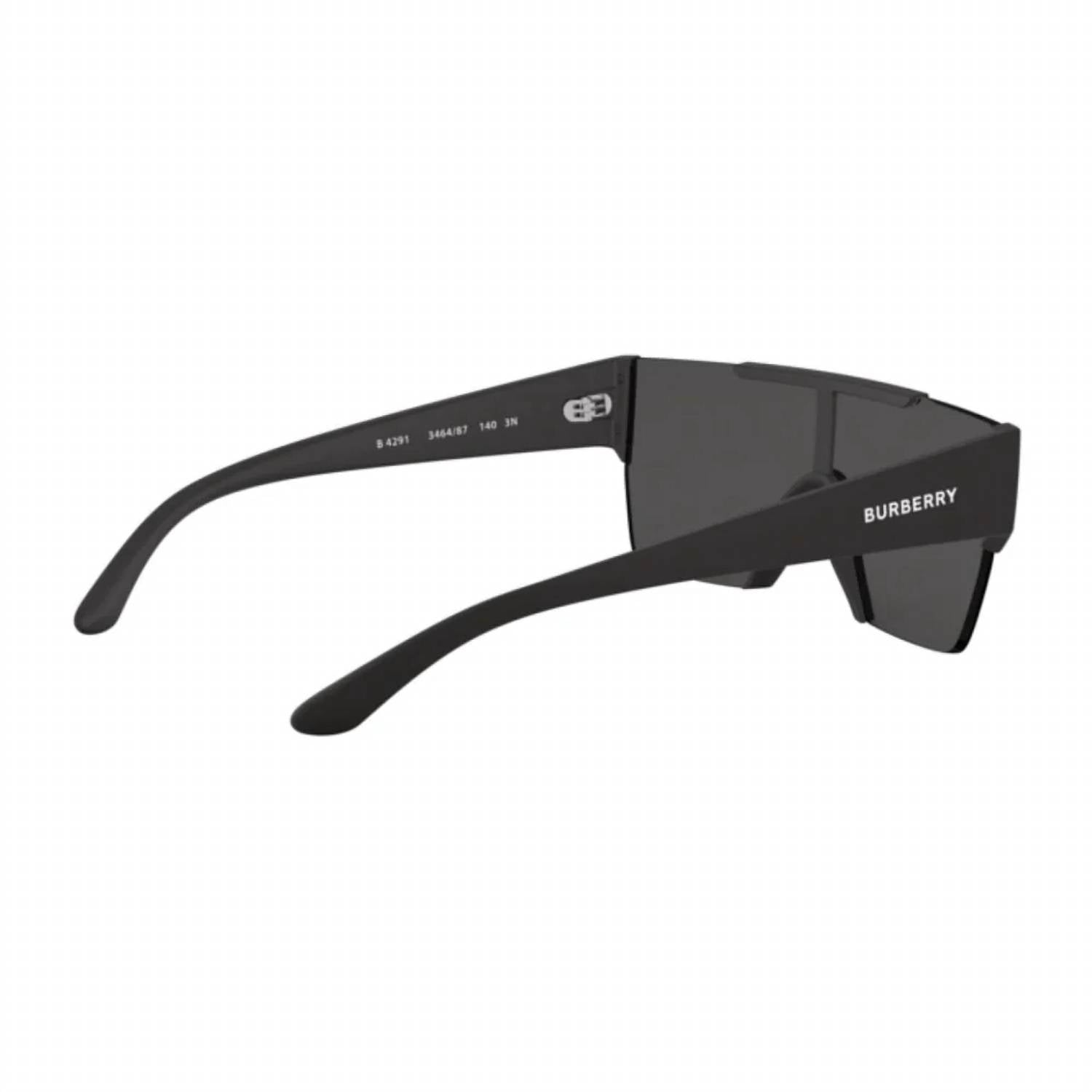 Introducing the Burberry Men's 4291 3464/87 Aviator Shield Sunglasses, a modern accessory with a matte black and grey design. These square-shaped, rimless frames are crafted from durable acetate, complemented by polyamide lenses that offer UV protection. The temples and frame maintain a sleek look with their black acetate construction. Measurements include a 38 mm lens width, an approximate 138 mm bridge, and 140 mm temples, all meticulously assembled in Italy.