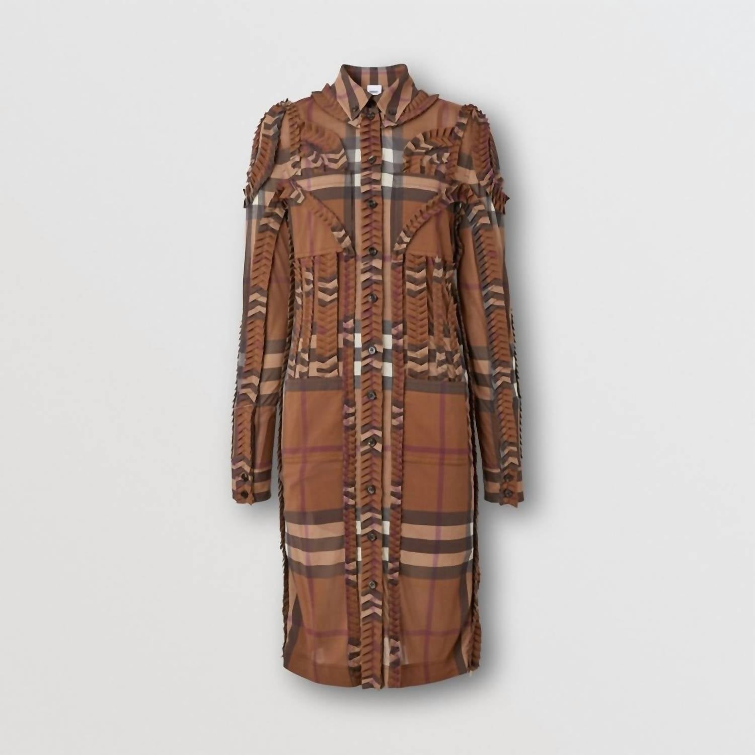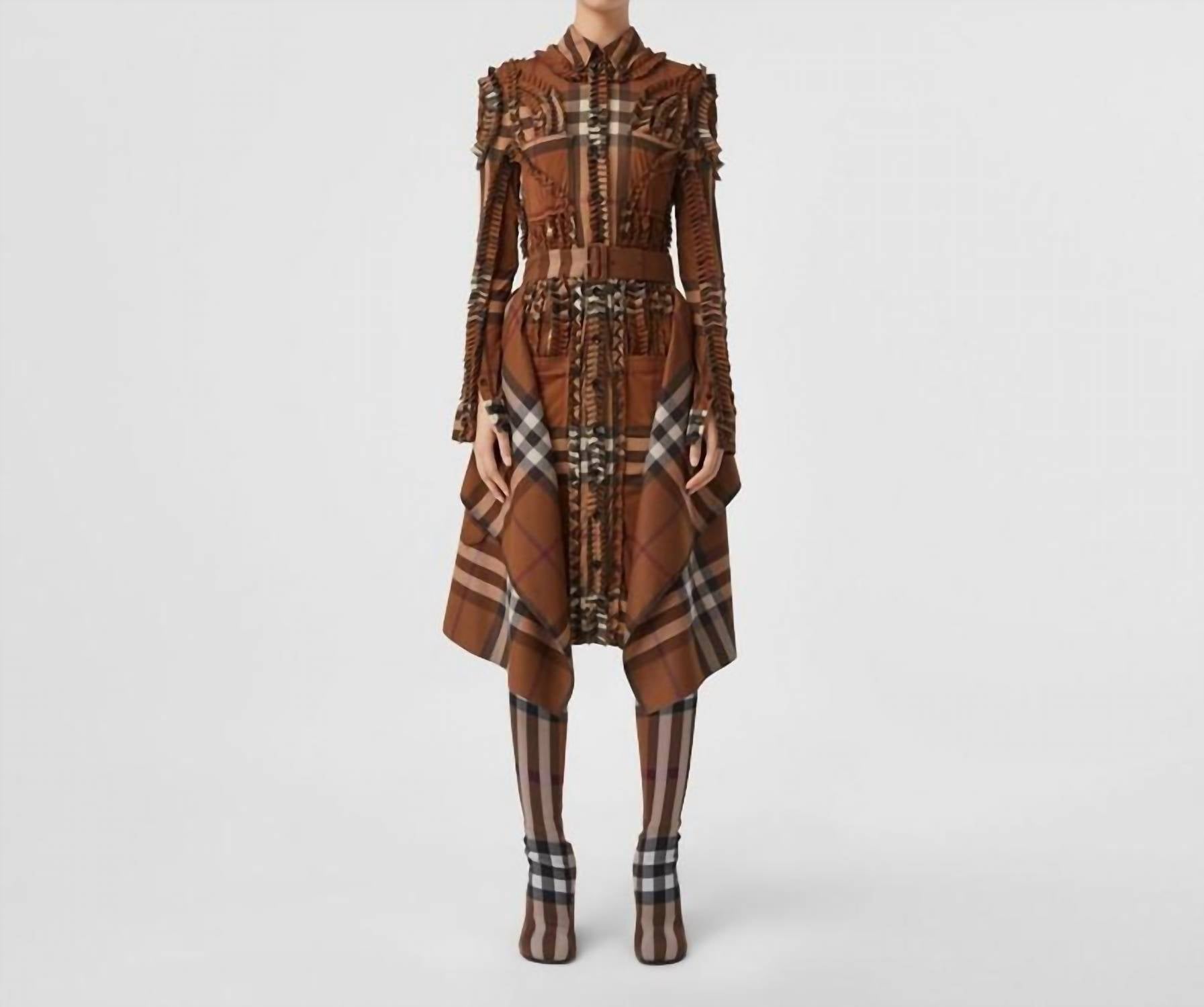 Cute and comfortable, this long sleeve dress has it all. Elevate your holiday party wardrobe with the Burberry Pleated Button-down Shirt Dress in dark brown. This long sleeve sheath dress, crafted from a luxurious 94% Viscose and 6% Elastane blend, originates from the fashion-forward streets of Italy. The plaid and check pattern, accentuated by pleated detailing and four front patch pockets, brings a maximalist flair to your fall season style. Closure: Front button up closure. Care: Dry clean only, lay flat to dry.