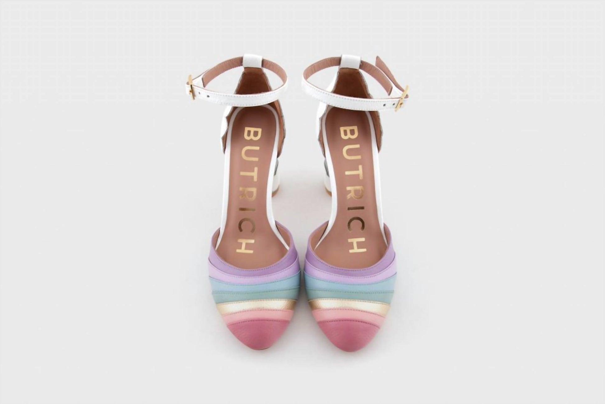 The perfect height for day to night. Meet our Sweet Sunshine, our most wanted Butrich style now in a new irresistible flavor. Straps with 7 cm heels, it has metallic suede and multicolor leather stripes. MATERIAL: Leather, metallic suede, metallic leather. HEEL: 7 CM