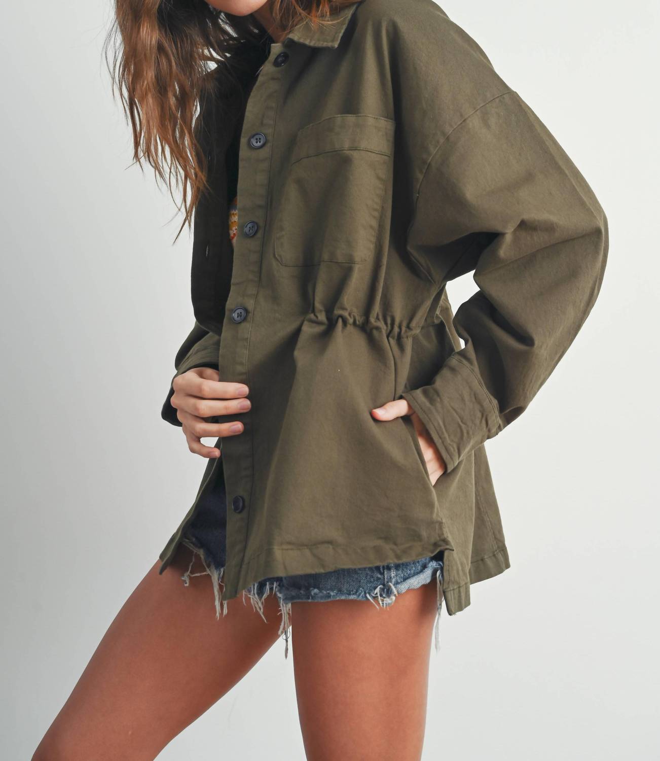 A casual yet cool jacket that every closset needs. Elevate your fall wardrobe with the Fall Adjustable Waist Cotton Jacket by Buttermelon, an elegant yet cozy olive piece crafted for style and warmth. This jacket features long sleeves and a cotton blend composition of 97% Cotton and 3% Spandex, ensuring comfort and flexibility. Its design is highlighted by a button closure with lapel buttons for added sophistication and an adjustable waist for a tailored fit. Ideal for dinner parties or casual outings, this minimalist jacket is a versatile addition to any woman's collection.