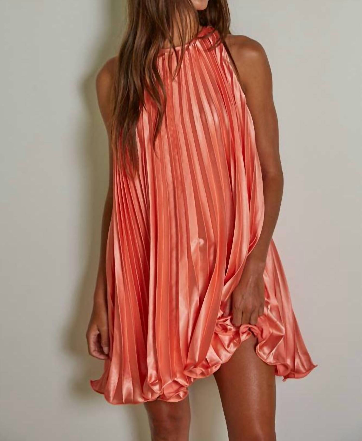 The kind of easy and flattering dress you'll be reaching for all season long. Step into the spotlight with the Accordion Pleated Round Neck Sleeveless Mini Dress by By Together, a chic choice for any celebration. Crafted from a woven satin blend of 97% Polyester and 3% Spandex, this dress offers a flattering sleeveless cut with textured accordion pleats in a vibrant Coral Reef hue. Sleek and stylish, it features a back slit with a convenient zip closure. Care instructions recommend a gentle hand wash to maintain its elegant silhouette. Available in Small, Medium, and Large sizes, perfect for your next dinner party or festive outing.