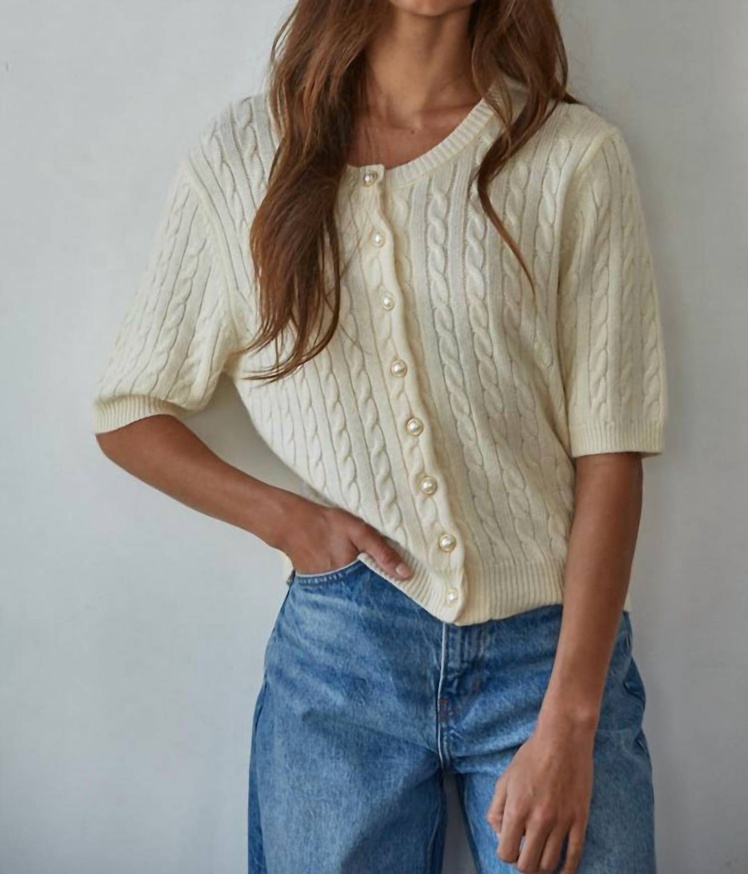 A classic fit that works just as good buttoned as it does left open. Introducing the Bonjour Cable Knit Cardigan Top by By Together, a textured cream cardigan perfect for a minimalist fall look. Featuring short sleeves and a stylish crewneck, this cardigan is designed for comfort and elegance. Composition: 29% Acrylic, 29% Viscose, 28% Polyester, 14% Nylon with a button closure. Garment Length: HPS Length is 20" for Small, 20.5" for Medium, and 21" for Large; Chest: 17" for Small, 18" for Medium, and 19" for Large.
