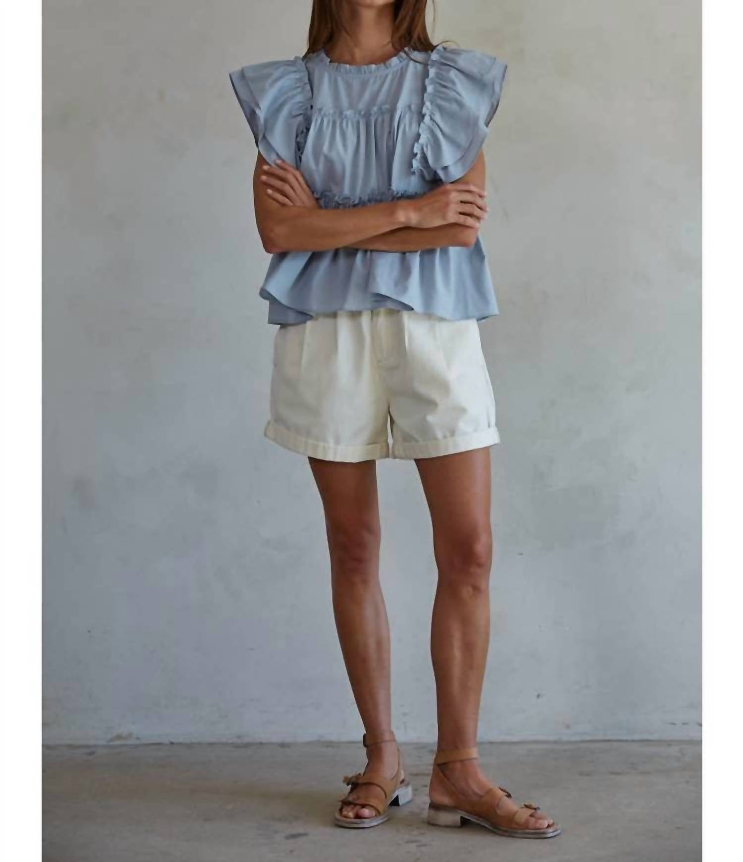 A versatile blouse that works from desk to dinner! Introducing the Dierdre Crew Neck Top by By Together, an ideal choice for Spring occasions and holiday parties in a sophisticated dusty blue hue. This blouse features cap sleeves and is crafted from a breathable cotton blend composed of 67% cotton, 18% modal, and 15% viscose, providing comfort and style. Designed for women, it offers a crew neck design with a solid pattern and button closure for an effortless fit. Care instructions: Machine wash and line dry.
