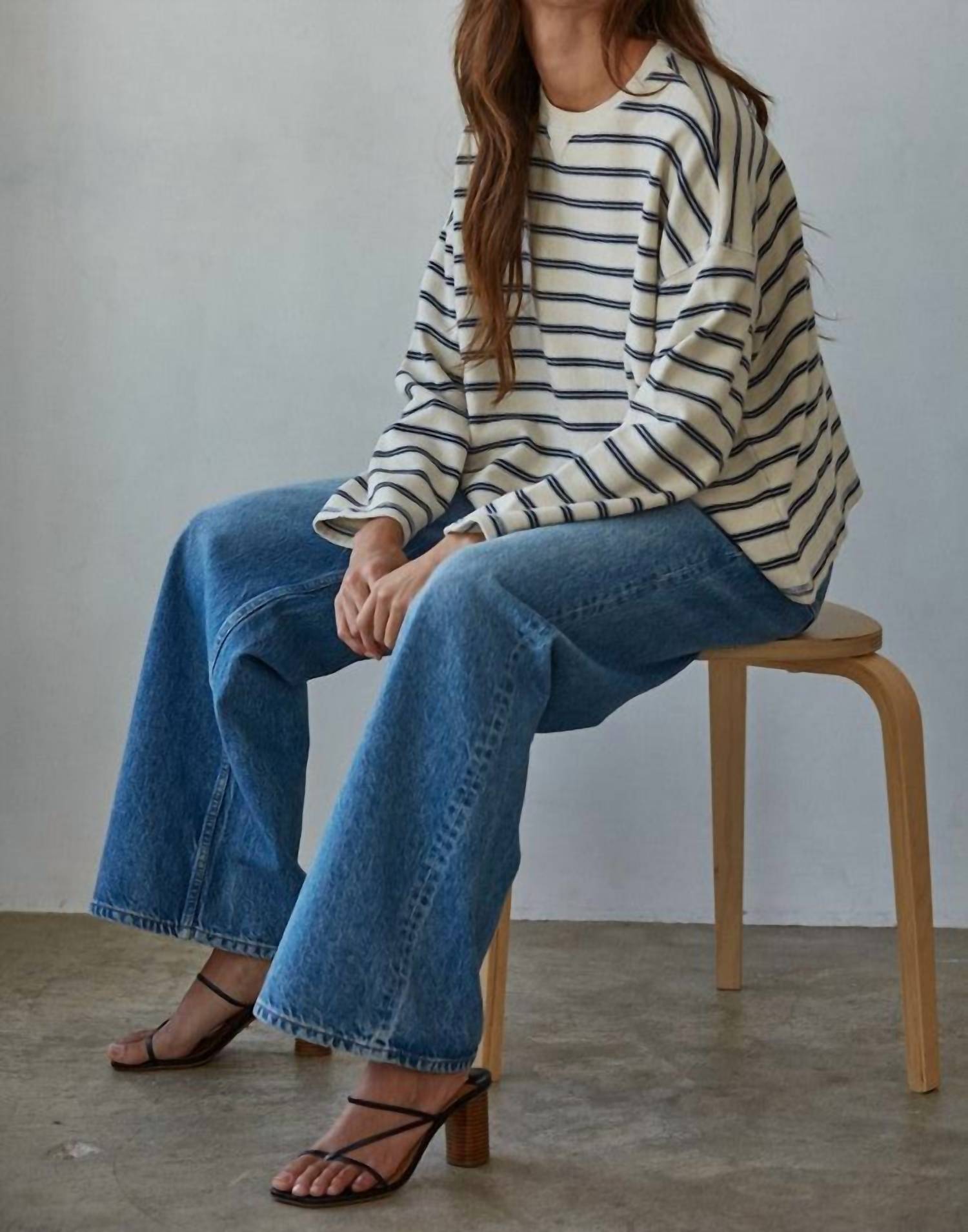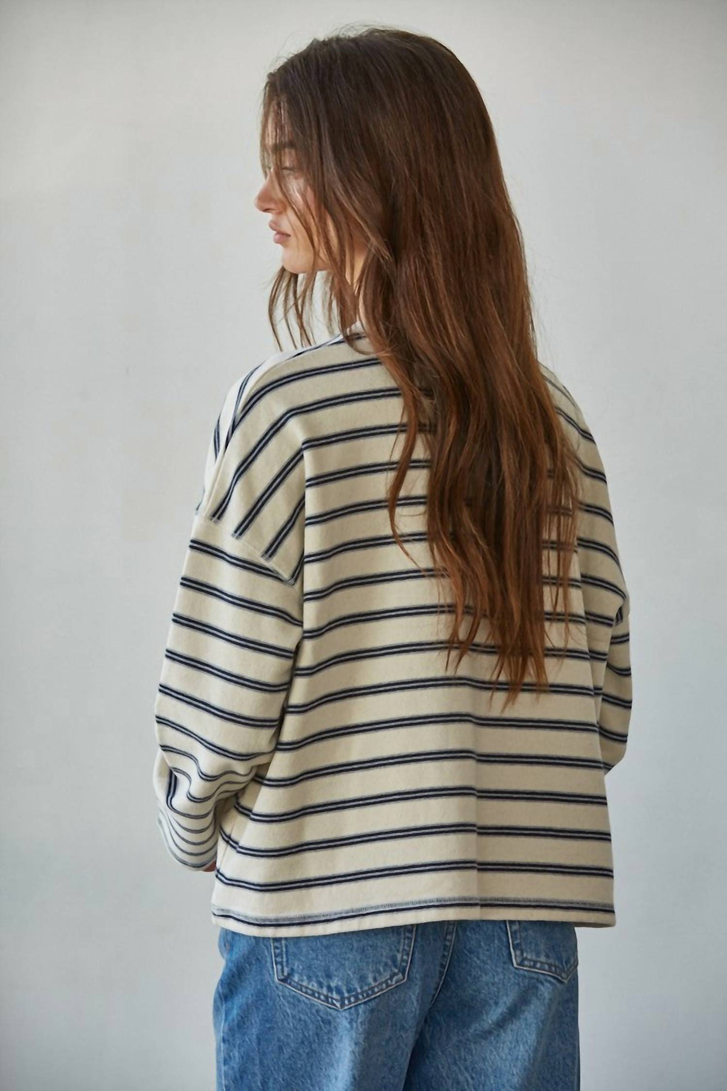 Great fit, cute design, soft fabric. You'll love everything about this long sleeve tee. Introducing the Low-key Pullover Top by By Together, a stylish choice for effortless travel wear. This natural stripe pullover features a relaxed long sleeve design crafted from 100% cotton, offering easygoing slouchy comfort. Closure: Pull on style. Care instructions: Machine wash and tumble dry for convenience. Perfect to pair with your favorite jeans for a laid-back spring look.