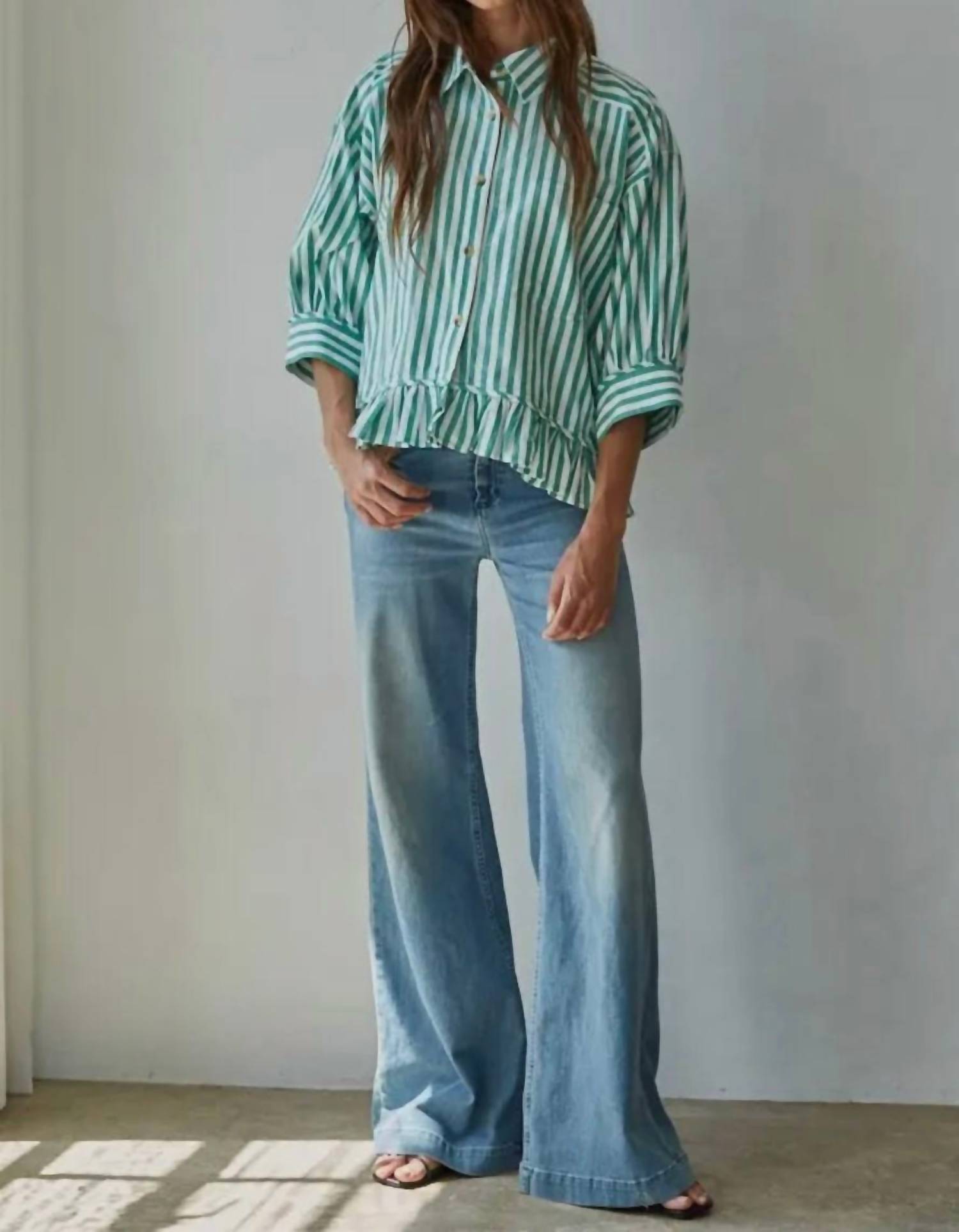 Perfectly tailored and soft to the touch. Introducing the Woven Cotton Striped Button Down Shirt by By Together, a chic addition to your wardrobe with its fresh green and white stripe pattern. This long sleeve shirt showcases dropped shoulders and voluminous sleeves that taper into a cuffed finish, complemented by a ruffled hem for a feminine touch. Closure: Button closure. Perfect for pairing with denim or tailored bottoms, this versatile shirt is ideal for both casual and dressed-up occasions.