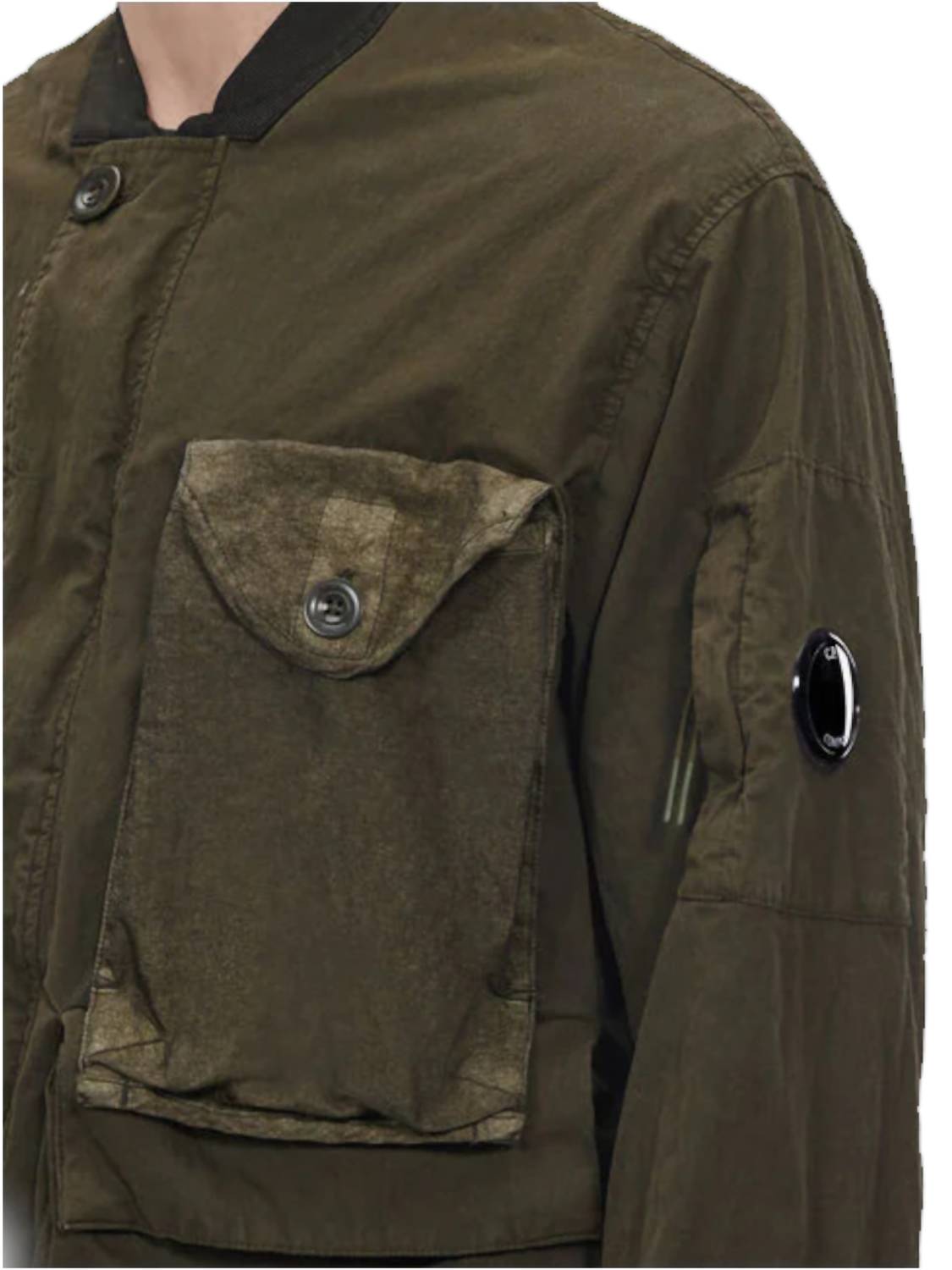 Introducing the Outerwear Short Jacket by C.P. Company in a sophisticated Ivy Green. This men's bomber jacket features long sleeves and is crafted from a nylon blend, perfected with a polyurethane coating for enhanced water resistance and a rich tonal finish. The jacket is designed with a ribbed collar, a button storm flap closure, secure chest compartments, and adjustable cuffs for exceptional functionality. Highlighted by a distinctive Lens detail on the sleeve pocket, this piece embodies streetwear elegance, ideal for a holiday party during the fall season.