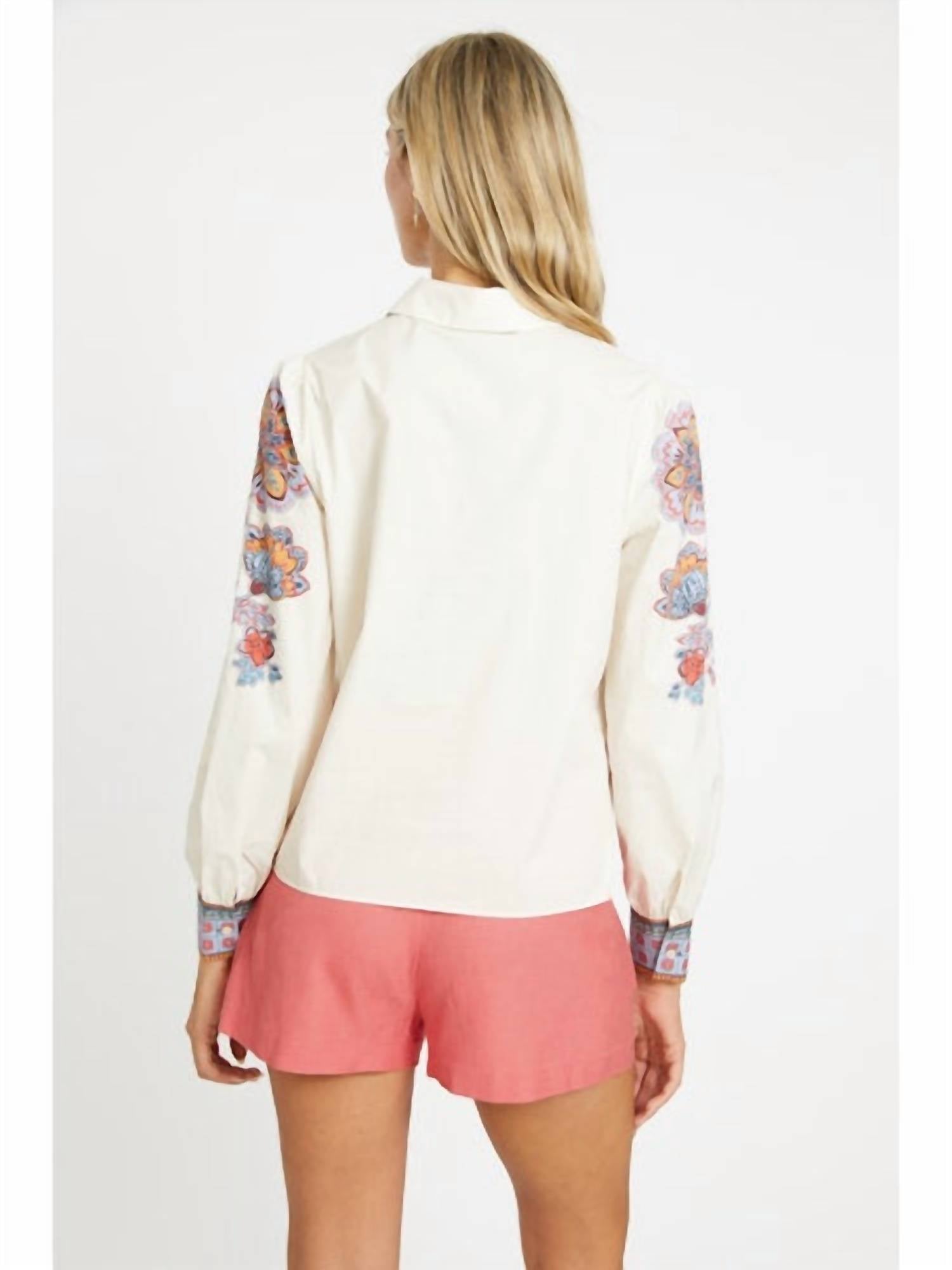 Pair this with your favorite jeans and slides for your next girls night out. Introducing the Audrey Woodblock Bloom Top by CABALLERO, a stunning floral piece perfect for both summer and fall. This long-sleeve blouse in ivory blends classic tailoring with artistic flair, featuring a crisp, clean look in soft cotton poplin. With a button-up closure and a collared neckline, it marries sophistication with comfort. Ideal for everyday elegance.